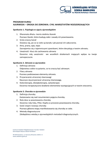 PROGRAM KURSU AJURWEDA – DROGA DO ZDROWIA. CYKL WARSZTATÓW ROZSZERZAJĄCYCH Spotkanie 1. Fizjologia w ujęciu ajurwedyjskim 1. Dharanata dhatu- teoria siedmiu tkanek Poznasz tkanki, które budują ciało i zasady ich powstawania. 2. Srota znaczy kanał Dowiesz się, po co w ciele są kanały i jak poznać ich zaburzenia. 3. Ama, prana, ojas, tejas Zaznajomisz się z tajemniczymi zjawiskami, które decydują o twoim zdrowiu. 4. Uważność- klucz do zachowania zdrowia Docenisz rolę uważności we wszelkich działaniach mających wpływ na twoje samopoczucie. Spotkanie 2. Zdrowie w ajurwedzie 1. Definicja zdrowia Odpowiesz sobie na pytanie, co to znaczy być zdrowym. 2. Filary zdrowia Poznasz podstawowe elementy zdrowia. 3. Przywracanie utraconej równowagi Nauczysz się przywracać utraconą równowagę. 4. Koloroterapia, dźwiękoterapia, sylwoterapia Docenisz terapeutyczne działanie elementów występujących w twoim otoczeniu. Spotkanie 3. Choroba w ajurwedzie 1. Definicja choroby Zastanowisz się nad rozumieniem pojęcia choroby. 2. Rola dosz w powstawaniu choroby Docenisz rolę Vaty, Pitty i Kaphy w procesie powstawania choroby. 3. Sześć stopni rozwoju choroby Poznasz główne etapy manifestowania się choroby w ciele. 4. Metody diagnostyczne Zdobędziesz wiedzę o ajurwedyjskich metodach diagnostycznych. Centrum Studiów Podyplomowych, Kursów i Szkoleń Górnośląska Wyższa Szkoła Handlowa 40-659 Katowice, ul. Harcerzy Września 1939 nr 3 www.szkolenia.gwsh.pl