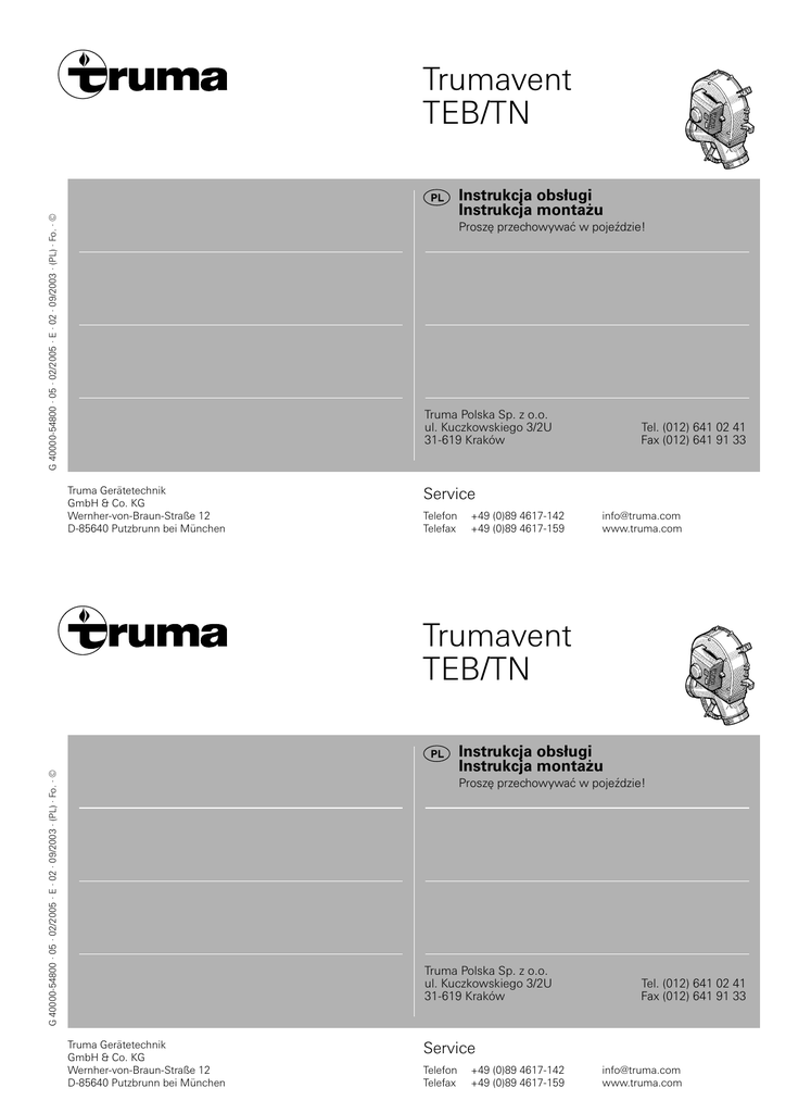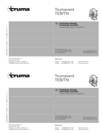 Trumavent TEB/TN G 40000-54800 · 05 · 02/2005 · E · 02 · 09/2003 · (PL) · Fo. · © Instrukcja obsługi Instrukcja montażu Proszę przechowywać w pojeździe! Truma Polska Sp. z o.o. ul. Kuczkowskiego 3/2U 31-619 Kraków Truma Gerätetechnik GmbH & Co. KG Wernher-von-Braun-Straße 12 D-85640 Putzbrunn bei München Tel. (012) 641 02 41 Fax (012) 641 91 33 Service Telefon Telefax +49 (0)89 4617-142 +49 (0)89 4617-159 [email protected] www.truma.com Trumavent TEB/TN G 40000-54800 · 05 · 02/2005 · E · 02 · 09/2003 · (PL) · Fo. · © Instrukcja obsługi Instrukcja montażu Proszę przechowywać w pojeździe! Truma Polska Sp. z o.o. ul. Kuczkowskiego 3/2U 31-619 Kraków Truma Gerätetechnik GmbH & Co. KG Wernher-von-Braun-Straße 12 D-85640 Putzbrunn bei München Tel. (012) 641 02 41 Fax (012) 641 91 33 Service Telefon Telefax +49 (0)89 4617-142 +49 (0)89 4617-159 [email protected] www.truma.com TEB – 12 V Maksymalną moc można w razie potrzeby ograniczyć przy pomocy pokrętła. Regulacja między tą wartością a wolnymi obrotami następuje automatycznie. z automatyką prędkości obrotowej Trumavent TN - 230 V Wyposażenie standardowe Trumavent 4 5 1 auto a b c 12 V Instrukcja obsługi Przed uruchomieniem koniecznie zapoznać się z instrukcją obsługi! Właściciel pojazdu jest odpowiedzialny za to, by obsługa urządzenia przebiegała w sposób prawidłowy. Naprawy mogą być dokonywane tylko przez fachowca! a = Regulacja ręczna (np. dla wentylacji) Żądaną moc nastawić pokrętłem. b = Wyłączenie (wzgl. tryb automatyczny/ ogrzewanie przy ogrzewaniach Trumatic S 3002 K i S 5002 K) c = Praca automatyczna (ogrzewanie) Moc dostosowuje się bezstopniowo do ilości ciepła oddawanej przez ogrzewanie. Dmuchawa Trumavent TEB może pracować z przetwornicą napięcia Truma SPU (nr art. 40000-47700) również pod napięciem 230 V ~. Przetwornicę napięcia SPU należy zamontować możliwie blisko podłogi. Podłączenie dalszych urządzeń 12 V do tej przetwornicy napięcia nie jest możliwe. Do podłączenia kilku urządzeń 12 V zalecamy ładowarkę do akumulatorów Truma NT 12/ 3-18 (nr art. 39901-01). Ładowarka ta (prąd ładowania 18 A) jest przeznaczona do ładowania akumulatorów ołowiowo-kwasowych lub ołowiowo-żelowych. Inne ładowarki należy używać jedynie z akumulatorem 12 V jako bufor. Urządzenia z zasilaniem sieciowym lub elektrycznym muszą być wyposażone w wyregulowane wyjście 12 V (udział prądu przemiennego poniżej 1 V). 2 5 man 2 4 3 3 Trumavent – Dmuchawa do rozdziału ciepłego powietrza i wentylacji 1 d e 230 V ~ d = Wyłącz. e = Załącz. Żądaną moc nastawić pokrętłem. Przed pracami konserwacyjnymi wzgl. naprawami, dmuchawą Trumavent odłączyć od sieci wszystkimi biegunami przy zachowaniu odstępu między stykami minimum 3,5 mm! W pojazdach dmuchawa Trumavent TN – 230 V oraz przetwornik napięcia SPU nie mogą być użytkowanie podczas jazdy. 2 Maksymalną moc można w razie potrzeby ograniczyć przy pomocy pokrętła. Regulacja między tą wartością a wolnymi obrotami następuje automatycznie. TEB – 12 V z automatyką prędkości obrotowej Trumavent TN - 230 V Wyposażenie standardowe Trumavent 1 4 5 auto a b c 12 V Instrukcja obsługi Przed uruchomieniem koniecznie zapoznać się z instrukcją obsługi! Właściciel pojazdu jest odpowiedzialny za to, by obsługa urządzenia przebiegała w sposób prawidłowy. Naprawy mogą być dokonywane tylko przez fachowca! a = Regulacja ręczna (np. dla wentylacji) Żądaną moc nastawić pokrętłem. b = Wyłączenie (wzgl. tryb automatyczny/ ogrzewanie przy ogrzewaniach Trumatic S 3002 K i S 5002 K) 2 c = Praca automatyczna (ogrzewanie) Moc dostosowuje się bezstopniowo do ilości ciepła oddawanej przez ogrzewanie. Dmuchawa Trumavent TEB może pracować z przetwornicą napięcia Truma SPU (nr art. 40000-47700) również pod napięciem 230 V ~. Przetwornicę napięcia SPU należy zamontować możliwie blisko podłogi. Podłączenie dalszych urządzeń 12 V do tej przetwornicy napięcia nie jest możliwe. Do podłączenia kilku urządzeń 12 V zalecamy ładowarkę do akumulatorów Truma NT 12/ 3-18 (nr art. 39901-01). Ładowarka ta (prąd ładowania 18 A) jest przeznaczona do ładowania akumulatorów ołowiowo-kwasowych lub ołowiowo-żelowych. Inne ładowarki należy używać jedynie z akumulatorem 12 V jako bufor. Urządzenia z zasilaniem sieciowym lub elektrycznym muszą być wyposażone w wyregulowane wyjście 12 V (udział prądu przemiennego poniżej 1 V). 5 man 2 4 3 3 Trumavent – Dmuchawa do rozdziału ciepłego powietrza i wentylacji 2 1 d e 230 V ~ d = Wyłącz. e = Załącz. Żądaną moc nastawić pokrętłem. Przed pracami konserwacyjnymi wzgl. naprawami, dmuchawą Trumavent odłączyć od sieci wszystkimi biegunami przy zachowaniu odstępu między stykami minimum 3,5 mm! W pojazdach dmuchawa Trumavent TN – 230 V oraz przetwornik napięcia SPU nie mogą być użytkowanie podczas jazdy. Rozdział ciepłego powietrza System rozprowadzania ciepłego powietrza konstruuje się indywidualnie do każdego typu pojazdu na zasadzie systemu konstrukcji zespołowej. Dla późniejszego poszerzenia dostępny jest bogaty program wyposażenia (patrz prospekt). Szkice z optymalnymi propozycjami montażu dla instalacji ciepłego powietrza we wszystkich powszechnie stosowanych typach przyczep i pojazdów kempingowych można otrzymać bezpłatnie za pośrednictwem centrali usługowej Truma. go. W położeniu środkowym ciepłe powietrze rozdziela się na oba wyjścia w ilości po 50%. W przypadku rur wentylatora o różnej długości lub przy wyższym zapotrzebowaniu ciepła po stronach należy zastosować rurę wentylatora Ø 72 mm. Dzięki temu można wykorzystać pełną moc powietrza po tej stronie. Przez przestawienie klapy powietrznej (f) można jeszcze indywidualnie zwiększyć ilość powietrza. Na skutek tej redukcji ulega moc powietrza po drugiej stronie. Jeśli spada moc po