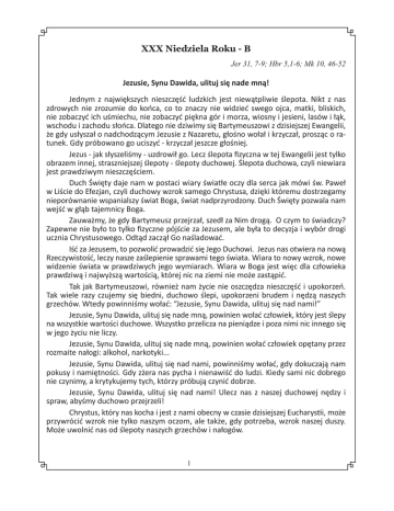 XXX Niedziela Roku - B Jer 31, 7-9; Hbr 5,1-6; Mk 10, 46-52 Jezusie, Synu Dawida, ulituj się nade mną! Jednym z największych nieszczęść ludzkich jest niewątpliwie ślepota. Nikt z nas zdrowych nie zrozumie do końca, co to znaczy nie widzieć swego ojca, matki, bliskich, nie zobaczyć ich uśmiechu, nie zobaczyć piękna gór i morza, wiosny i jesieni, lasów i łąk, wschodu i zachodu słońca. Dlatego nie dziwimy się Bartymeuszowi z dzisiejszej Ewangelii, że gdy usłyszał o nadchodzącym Jezusie z Nazaretu, głośno wołał i krzyczał, prosząc o ratunek. Gdy próbowano go uciszyć - krzyczał jeszcze głośniej. Jezus - jak słyszeliśmy - uzdrowił go. Lecz ślepota fizyczna w tej Ewangelii jest tylko obrazem innej, straszniejszej ślepoty - ślepoty duchowej. Ślepota duchowa, czyli niewiara jest prawdziwym nieszczęściem. Duch Święty daje nam w postaci wiary światłe oczy dla serca jak mówi św. Paweł w Liście do Efezjan, czyli duchowy wzrok samego Chrystusa, dzięki któremu dostrzegamy nieporównanie wspanialszy świat Boga, świat nadprzyrodzony. Duch Święty pozwala nam wejść w głąb tajemnicy Boga. Zauważmy, że gdy Bartymeusz przejrzał, szedł za Nim drogą. O czym to świadczy? Zapewne nie było to tylko fizyczne pójście za Jezusem, ale była to decyzja i wybór drogi ucznia Chrystusowego. Odtąd zaczął Go naśladować. Iść za Jezusem, to pozwolić prowadzić się Jego Duchowi. Jezus nas otwiera na nową Rzeczywistość, leczy nasze zaślepienie sprawami tego świata. Wiara to nowy wzrok, nowe widzenie świata w prawdziwych jego wymiarach. Wiara w Boga jest więc dla człowieka prawdziwą i najwyższą wartością, której nic na ziemi nie może zastąpić. Tak jak Bartymeuszowi, również nam życie nie oszczędza nieszczęść i upokorzeń. Tak wiele razy czujemy się biedni, duchowo ślepi, upokorzeni brudem i nędzą naszych grzechów. Wtedy powinniśmy wołać: “Jezusie, Synu Dawida, ulituj się nad nami!” Jezusie, Synu Dawida, ulituj się nade mną, powinien wołać człowiek, który jest ślepy na wszystkie wartości duchowe. Wszystko przelicza na pieniądze i poza nimi nic innego się w jego życiu nie liczy. Jezusie, Synu Dawida, ulituj się nade mną, powinien wołać człowiek opętany przez rozmaite nałogi: alkohol, narkotyki... Jezusie, Synu Dawida, ulituj się nad nami, powinniśmy wołać, gdy dokuczają nam pokusy i namiętności. Gdy zżera nas pycha i nienawiść do ludzi. Kiedy sami nic dobrego nie czynimy, a krytykujemy tych, którzy próbują czynić dobrze. Jezusie, Synu Dawida, ulituj się nad nami! Ulecz nas z naszej duchowej nędzy i spraw, abyśmy duchowo przejrzeli! Chrystus, który nas kocha i jest z nami obecny w czasie dzisiejszej Eucharystii, może przywrócić wzrok nie tylko naszym oczom, ale także, gdy potrzeba, wzrok naszej duszy. Może uwolnić nas od ślepoty naszych grzechów i nałogów. 1 Módlmy się dziś do Niego słowami żołnierza, który w czasie bitwy został zraniony w głowę i bał się utracić swoje oczy: Panie, nie zabieraj mi światła moich oczu! Ale jeśli już taka jest Twoja wola, to zostaw mi przynajmniej światło umysłu. Jeśli zaś i tego chcesz mnie pozbawić, zostaw mi przynajmniej światło wiary! Jezusie, Synu Dawida, ulituj się nad nami! Msza radiowa, Orchard Lake 2015 2