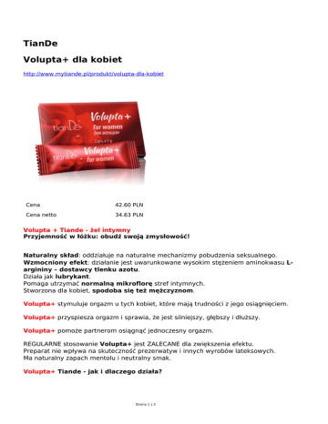TianDe Volupta+ dla kobiet http://www.mytiande.pl/produkt/volupta-dla-kobiet Cena 42.60 PLN Cena netto 34.63 PLN Volupta + Tiande - żel intymny Przyjemność w łóżku: obudź swoją zmysłowość! Naturalny skład: oddziałuje na naturalne mechanizmy pobudzenia seksualnego. Wzmocniony efekt: działanie jest uwarunkowane wysokim stężeniem aminokwasu Largininy – dostawcy tlenku azotu. Działa jak lubrykant. Pomaga utrzymać normalną mikroflorę stref intymnych. Stworzona dla kobiet, spodoba się też mężczyznom. Volupta+ stymuluje orgazm u tych kobiet, które mają trudności z jego osiągnięciem. Volupta+ przyspiesza orgazm i sprawia, że jest silniejszy, głębszy i dłuższy. Volupta+ pomoże partnerom osiągnąć jednoczesny orgazm. REGULARNE stosowanie Volupta+ jest ZALECANE dla zwiększenia efektu. Preparat nie wpływa na skuteczność prezerwatyw i innych wyrobów lateksowych. Ma naturalny zapach mentolu i neutralny smak. Volupta+ Tiande - jak i dlaczego działa? Strona 1 z 3 Podobnie jak kawa wzmacnia po przebudzeniu ze snu, żel intymny Volupta+ pobudza libido. Ma naturalny skład i oddziałuje na naturalne mechanizmy pobudzenia seksualnego. Podstawą działania żelu jest aminokwas - L-arginina. Dzięki niej w organizmie uruchamia się proces produkcji tlenku azotu (NO), który rozluźnia mięśnie gładkie ścianek naczyń krwionośnych, rozszerza je, zapewniając silny dopływ krwi do organów płciowych (na uruchomieniu produkcji tlenku azotu opiera się działanie takich preparatów jak Viagra i jej odpowiedniki). Dzięki pantenolowi, alantoinie i mentolowi pobudzający żel intymny pełni funkcję lubrykantu (łac. lubrico - „czynić gładkim, śliskim“). Lubrykant nawilża organy płciowe i znacznie poprawia jakość seksu, zapewniając idealne nawilżenie. Specyficzna cecha żelu Volupta+ polega na tym, że dzięki obecności w składzie kwasu mlekowego dba on o mikroflorę błon śluzowych miejsc intymnych. Volupta+ została stworzona specjalnie dla kobiet, jednak mężczyźni również docenią ten produkt i to nie tylko dlatego, że satysfakcja partnerki poprawia jakość życia seksualnego. U podstaw popędu seksualnego (zarówno u kobiet, jak i mężczyzn) leży jeden i ten sam mechanizm - silny dopływ krwi do organów płciowych, który w danym przypadku jest zapewniany przez tlenek azotu. To dlatego produkt Volupta+ jest zalecany do stosowanie zarówno przez kobiety, jak i mężczyzn, razem lub osobno. Volupta+ poprawi nie tylko jakość seksu, ale również jakość życia! Orgazm to nie tylko przyjemność. To prawdziwy zabieg leczniczo-profilaktyczny z punktu widzenia medycyny i fizjologii. To dostępna dla wszystkich forma profilaktyki nerwicy i depresji. Ponadto podczas orgazmu następuje dopływ krwi do miednicy mniejszej (a następnie jej odpływ), co wraz z przyjemnością rozwiąże lub zapobiegnie poważnym problemom zdrowotnym u kobiet i mężczyzn, które mogą być wywołane przez objawy zastoinowe. Unikalność Volupta Tiande L-arginina znajduje się również w kilku innych produktach intymnych. Unikalność Volupta+ od TianDe polega na tym, że aminokwas ten po raz pierwszy został zastosowany w tak dużej dawce (5 mg w każdej porcji o objętości 1 g) oraz w połączeniu z takimi składnikami jak kwas mlekowy, pantenol, alantoina i mentol. Sposób stosowania Volupta+ Tiande: Wycisnąć na palec „kroplę“ żelu (jest to około 1 g) i 5-10 minut przed stosunkiem nanieść na błonę śluzową u podstawy łechtaczki, która znajduje się na styku mniejszych warg sromowych. Dla wzmocnienia efektu czynności tej powinna towarzyszyć stymulacja seksualna: dotyk, gładzenie, pocałunki i inne elementy gry wstępnej - żadnych czynności automatycznych! Każde opakowanie wystarcza na 10 zastosowań. Uwagi dodatkowe: energiczne wcieranie żelu nie jest najlepszym sposobem! Zamiast tego przyłóż palec wskazujący do najbardziej wypukłego punktu łechtaczki i lekko go zegnij. Powstanie coś w rodzaju haczyka, który może dosięgnąć włókien nerwowych, znajdujących się bezpośrednio pod łechtaczką. Dzięki ich pobudzeniu podniecenie będzie Strona 2 z 3 głębsze. Po nałożeniu Volupta+ pojawi się uczucie chłodu i lekkiego mrowienia - tak zaczyna działać mentol. Później następuje wchłanianie L-argininy, któremu towarzyszy dopływ krwi do łechtaczki i organów płciowych i wzrost popędu seksualnego. Nabrzmiałe naczynia krwionośne zwiększają wrażliwość organów płciowych, powodując przyjemne odczucia i narastającą zdolność do osiągnięcia orgazmu. Łatwo się domyślić, że działanie Volupta+ podczas stosunku seksualnego ogarnie oboje partnerów. Mężczyzna może jednak zastosować żel również dzień wcześniej. Aby uzyskać najlepszy efekt, należy nanieść Volupta+ na błonę śluzową żołędzi członka - to właśnie tutaj substancje aktywne wchłaniają się najlepiej i będą stymulować powierzchnię tkanek, zwiększając tym samym dopływ krwi. Czas działania Volupta+ Dla każdej kobiety czas działania będzie inny, choć obserwuje się tendencję, że powodowane przez żel przyjemne odczucia trwają co najmniej 30 minut. W niektórych przypadkach nawet dłużej. W razie konieczności żel można zastosować ponownie. Prezerwatywa nie jest przeszkodą dla Volupta+! Preparat posiada bazę wodną i nie ma wpływu na żadne wyroby z lateksu. Narastający efekt stosowania Volupta+ Czy kobieta może liczyć na natychmiastowy rezultat stosowania Volupta+? Wszystko zależy od niej samej - jej wieku, stanu układu hormonalnego i znajomości zarówno przez nią, jak i jej partnera jej indywidualnych cech wrażliwości seksualnej. Niektóre kobiety odczuwają znaczną poprawę już po pierwszym użyciu. Większość jednak mówi o narastającym efekcie: im dłużej stosujesz Volupta+, tym silniejsze będą Twoje doznania. "Zdolność doznawania przyjemności jest dowodem siły" (Arystoteles) Pamię