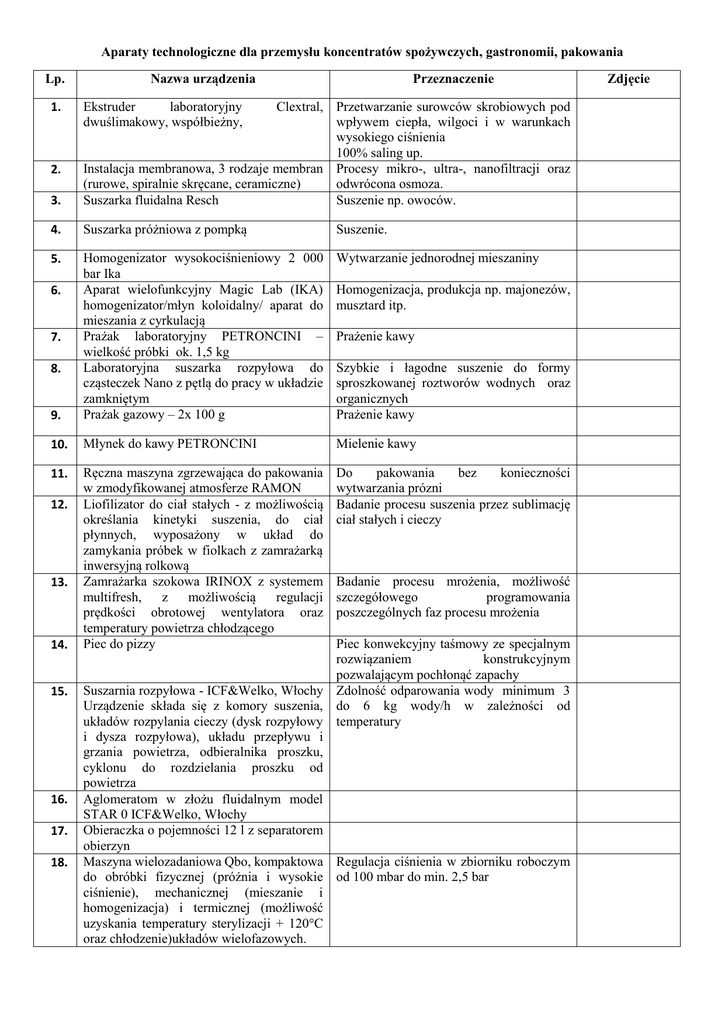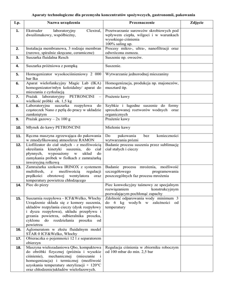 Aparaty technologiczne dla przemysłu koncentratów spożywczych, gastronomii, pakowania Lp. Nazwa urządzenia Przeznaczenie 3. Clextral, Przetwarzanie surowców skrobiowych pod wpływem ciepła, wilgoci i w warunkach wysokiego ciśnienia 100% saling up. Instalacja membranowa, 3 rodzaje membran Procesy mikro-, ultra-, nanofiltracji oraz (rurowe, spiralnie skręcane, ceramiczne) odwrócona osmoza. Suszarka fluidalna Resch Suszenie np. owoców. 4. Suszarka próżniowa z pompką Suszenie. 5. Wytwarzanie jednorodnej mieszaniny 9. Homogenizator wysokociśnieniowy 2 000 bar Ika Aparat wielofunkcyjny Magic Lab (IKA) homogenizator/młyn koloidalny/ aparat do mieszania z cyrkulacją Prażak laboratoryjny PETRONCINI – wielkość próbki ok. 1,5 kg Laboratoryjna suszarka rozpyłowa do cząsteczek Nano z pętlą do pracy w układzie zamkniętym Prażak gazowy – 2x 100 g 10. Młynek do kawy PETRONCINI Mielenie kawy 11. Ręczna maszyna zgrzewająca do pakowania w zmodyfikowanej atmosferze RAMON Liofilizator do ciał stałych - z możliwością określania kinetyki suszenia, do ciał płynnych, wyposażony w układ do zamykania próbek w fiolkach z zamrażarką inwersyjną rolkową Zamrażarka szokowa IRINOX z systemem multifresh, z możliwością regulacji prędkości obrotowej wentylatora oraz temperatury powietrza chłodzącego Piec do pizzy Do pakowania bez konieczności wytwarzania prózni Badanie procesu suszenia przez sublimację ciał stałych i cieczy 1. 2. 6. 7. 8. 12. 13. 14. 15. 16. 17. 18. Ekstruder laboratoryjny dwuślimakowy, współbieżny, Homogenizacja, produkcja np. majonezów, musztard itp. Prażenie kawy Szybkie i łagodne suszenie do formy sproszkowanej roztworów wodnych oraz organicznych Prażenie kawy Badanie procesu mrożenia, możliwość szczegółowego programowania poszczególnych faz procesu mrożenia Piec konwekcyjny taśmowy ze specjalnym rozwiązaniem konstrukcyjnym pozwalającym pochłonąć zapachy Suszarnia rozpyłowa - ICF&Welko, Włochy Zdolność odparowania wody minimum 3 Urządzenie składa się z komory suszenia, do 6 kg wody/h w zależności od układów rozpylania cieczy (dysk rozpyłowy temperatury i dysza rozpyłowa), układu przepływu i grzania powietrza, odbieralnika proszku, cyklonu do rozdzielania proszku od powietrza Aglomeratom w złożu fluidalnym model STAR 0 ICF&Welko, Włochy Obieraczka o pojemności 12 l z separatorem obierzyn Maszyna wielozadaniowa Qbo, kompaktowa Regulacja ciśnienia w zbiorniku roboczym do obróbki fizycznej (próżnia i wysokie od 100 mbar do min. 2,5 bar ciśnienie), mechanicznej (mieszanie i homogenizacja) i termicznej (możliwość uzyskania temperatury sterylizacji + 120°C oraz chłodzenie)układów wielofazowych. Zdjęcie 19. 20. Możliwość cięcia, rozdrabniania, mieszania, homogenizowania, rafinowania i emulsyfikowania produktów. pojemność zbiornika roboczego w przedziale 10 do 15 litrów Kompaktowa maszyna wielofunkcyjna do produkcji lodziarskiej i cukierniczej pojemność zbiornika roboczego w przedziale 2 do 3 litrów Wydajność 10 do 15 l/ Automatyczne mycie i sanityzacja maszyny ; oprogramowanie pozwalające na pracę zarówno w trybie manualnym jak i w pełni automatycznym Piece konwekcyjno-parowy Maszyna wielozadaniowa, kompaktowa dająca możliwość pasteryzacji, gotowania, ubijania, mrożenia lub chłodzenia, Możliwość użycie niepasteryzowanych surowców (np. mleka) przy zachowaniu 100% bezpieczeństwa sanitarnego 22. Modułowy piec piekarniczo – cukierniczy z Wypieki chleba i wyrobów cukierniczych garownikiem i okapem; piec 4-komory z STIR oraz garownią Patelnie multifunkcyjne 23. Urządzenie sous-vide 24. Frytownice 25. Grill kontaktowy 26. Wilk do mięsa 27. Pakowarka próżniowa 28. Trayslayer- urządzenie do pakowania w tackach Marynowarka ultradźwiękowa Do modyfikacji tekstury i przyspieszenia procesu marynowania Mroźnie uderzeniowe Wydajność schładzania: +90 °C > + 3 °C: 20 kg produktu; wydajność zamrażania: + 90 °C > - 18 °C: 14 kg produktu; 21. 29. 30. Do obróbki termicznej żywności pakowanej próżniowo
