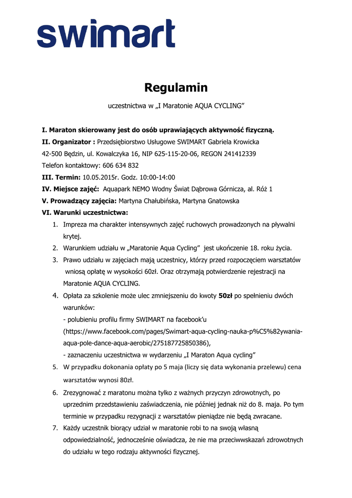 Regulamin uczestnictwa w „I Maratonie AQUA CYCLING” I. Maraton skierowany jest do osób uprawiających aktywność fizyczną. II. Organizator : Przedsiębiorstwo Usługowe SWIMART Gabriela Krowicka 42-500 Będzin, ul. Kowalczyka 16, NIP 625-115-20-06, REGON 241412339 Telefon kontaktowy: 606 634 832 III. Termin: 10.05.2015r. Godz. 10:00-14:00 IV. Miejsce zajęć: Aquapark NEMO Wodny Świat Dąbrowa Górnicza, al. Róż 1 V. Prowadzący zajęcia: Martyna Chałubińska, Martyna Gnatowska VI. Warunki uczestnictwa: 1. Impreza ma charakter intensywnych zajęć ruchowych prowadzonych na pływalni krytej. 2. Warunkiem udziału w „Maratonie Aqua Cycling” jest ukończenie 18. roku życia. 3. Prawo udziału w zajęciach mają uczestnicy, którzy przed rozpoczęciem warsztatów wniosą opłatę w wysokości 60zł. Oraz otrzymają potwierdzenie rejestracji na Maratonie AQUA CYCLING. 4. Opłata za szkolenie może ulec zmniejszeniu do kwoty 50zł po spełnieniu dwóch warunków: - polubieniu profilu firmy SWIMART na facebook’u (https://www.facebook.com/pages/Swimart-aqua-cycling-nauka-p%C5%82ywaniaaqua-pole-dance-aqua-aerobic/275187725850386), - zaznaczeniu uczestnictwa w wydarzeniu „I Maraton Aqua cycling” 5. W przypadku dokonania opłaty po 5 maja (liczy się data wykonania przelewu) cena warsztatów wynosi 80zł. 6. Zrezygnować z maratonu można tylko z ważnych przyczyn zdrowotnych, po uprzednim przedstawieniu zaświadczenia, nie później jednak niż do 8. maja. Po tym terminie w przypadku rezygnacji z warsztatów pieniądze nie będą zwracane. 7. Każdy uczestnik biorący udział w maratonie robi to na swoją własną odpowiedzialność, jednocześnie oświadcza, że nie ma przeciwwskazań zdrowotnych do udziału w tego rodzaju aktywności fizycznej. 8. Wszystkie objawy złego samopoczucia należy natychmiast zgłaszać prowadzącym. 9. Dokonanie wpłaty na „Maraton Aqua cycling” jest jednoznaczne z przeczytaniem, zrozumieniem i akceptacją tego regulaminu. 10. Uczestnicy warsztatów zobowiązani są do przestrzegania zasad bezpieczeństwa, regulaminu „Nemo Wodny Świat”, na której odbywa się impreza i dbałości o powierzony im sprzęt sportowy. 11. Zabrania się rejestrowania dźwięku, fotografowania i filmowania zajęć oraz rozpowszechniania materiałów dydaktycznych bez zgody organizatora i wykładowców. 12. Osoby, które nie dostosują się do tego warunku regulaminu zostaną wyproszone z zajęć. 13. Organizator zastrzega sobie prawo do odwołania maratonu, zmiany godzin, rodzaju lekcji fitness oraz instruktorów, którzy poprowadzą zajęcia. 14. Każdy uczestnik maratonu zobowiązany jest do posiadania butów do wody. 15. Procedura rejestracji na maraton wygląda następująco: • Dokonanie wpłaty na konto bankowe ING B/Ś 86 1050 1227 1000 0090 7114 3359 z dopiskiem „imię i nazwisko uczestnika, Maraton Aqua cycling 2015” Dane do przelewu: Przedsiębiorstwo Usługowe SWIMART Gabriela Krowicka 42-500 Będzin, ul. Kowalczyka 16 Lub wpłaty w Aquaparku NEMO upoważnionemu pracownikow. • Wysłanie pocztą elektroniczną na adres [email protected] potwierdzenia wykonania przelewu, oraz następujących danych: Imię i nazwisko, numer telefonu kontaktowego. • W wiadomości zwrotnej w postaci e-mail lub SMS wyślemy Państwu potwierdzenie zgłoszenia na szkolenie. Prosimy o obecność minimum 20minut przed rozpoczęciem maratonu. Do zobaczenia na maratonie :)