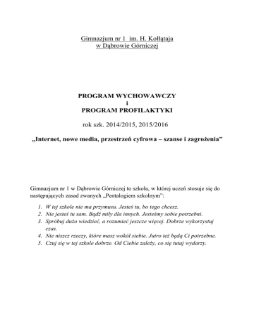 Gimnazjum nr 1 im. H. Kołłątaja w Dąbrowie Górniczej PROGRAM WYCHOWAWCZY i PROGRAM PROFILAKTYKI rok szk. 2014/2015, 2015/2016 „Internet, nowe media, przestrzeń cyfrowa – szanse i zagrożenia” Gimnazjum nr 1 w Dąbrowie Górniczej to szkoła, w której uczeń stosuje się do następujących zasad zwanych „Pentalogiem szkolnym”: 1. W tej szkole nie ma przymusu. Jesteś tu, bo tego chcesz. 2. Nie jesteś tu sam. Bądź miły dla innych. Jesteśmy sobie potrzebni. 3. Spróbuj dużo wiedzieć, a rozumieć jeszcze więcej. Dobrze wykorzystuj czas. 4. Nie niszcz rzeczy, które masz wokół siebie. Jutro też będą Ci potrzebne. 5. Czuj się w tej szkole dobrze. Od Ciebie zależy, co się tutaj wydarzy. WIZJA I MISJA SZKOŁY, MODEL ABSOLWENTA WIZJA SZKOŁY: Wizją Gimnazjum nr 1 w Dąbrowie Górniczej jest szkoła oparta na zasadach partnerstwa, szacunku, poszanowania różnych poglądów i na wzajemnej pomocy; oferująca usługi edukacyjne na wysokim poziomie; wspierająca wszechstronny rozwój uczniów; bardzo dobrze wyposażona, wykorzystująca najnowsze technologie informacyjne; przygotowująca uczniów do dorosłego życia; wspierająca rodziców w procesie wychowania dziecka. Mając na uwadze osiągniecie tego celu, szkoła – we współpracy z rodzicami, środowiskiem lokalnym oraz odpowiednimi organizacjami i instytucjami wspomagającymi działania edukacyjne i wychowawcze szkoły – podejmuje działania zmierzające do: 1. Organizacji procesu dydaktyczno-wychowawczego zgodnie z przepisami w zakresie oświaty i wychowania, uwzględniając potrzeby rozwojowe i możliwości psychofizyczne uczniów, specyfikę pracy szkoły oraz zapewniając optymalne warunki do nauki i atmosferę sprzyjającą uczeniu się. 2. Rozwoju szkoły oraz podnoszenia jakości swej pracy. 3. Systematycznego podnoszenia stanu opieki psychologiczno-pedagogicznej oraz bezpieczeństwa uczniów. 4. Stosowania demokratycznych zasad i procedur w życiu szkoły. Respektowania norm społecznych. 5. Kształtowania u uczniów prawidłowych postaw społecznych, umiejętności samodzielnego podejmowania decyzji oraz odpowiedzialności za siebie i innych. 6. Eliminowania zachowań ryzykownych poprzez wyposażanie uczniów w wiedzę i umiejętności pomagające w radzeniu sobie w sytuacjach trudnych. 7. Promowania zdrowego stylu życia wśród uczniów – realizacja programów profilaktycznych. 8. Wspomagania rozwoju fizycznego, psychicznego i społecznego uczniów. 9. Wyrównywania szans edukacyjnych uczniów. 10. Rozwijania i doskonalenia zdolności i zainteresowań uczniów poprzez bogatą ofertę zajęć pozalekcyjnych oraz ciekawą tematykę projektów edukacyjnych. 11. Wzrostu efektów nauczania, w tym osiągania przez uczniów wysokich wyników na egzaminie gimnazjalnym oraz sukcesów w konkursach i olimpiadach przedmiotowych. 12. Stałego doskonalenia pracy nauczycieli. 13. Systematycznego unowocześniania pracowni przedmiotowych oraz rozwijania bazy dydaktycznej. 14. Sprawnej komunikacji między rodzicami a szkołą oraz zaangażowania rodziców w życie szkoły. 15. Zachęcania uczniów do podejmowania aktywności na terenie szkoły (np. działania samorządu uczniowskiego, akcje charytatywne) i w środowisku lokalnym, w tym w zakresie promocji szkoły w regionie. MISJA SZKOŁY: „Prowadzenie do pełnego rozwoju osobistego ucznia, do bycia człowiekiem uczciwym, umiejącym żyć z innymi i dla innych” Gimnazjum nr 1 w Dąbrowie Górniczej nieustannie dba o to, by być miejscem wszechstronnego rozwoju osobowego ucznia w jego wymiarze indywidualnym, społecznym, psychicznym, zdrowotnym, estetycznym, moralnym i duchowym. W szczególności: 1. Wychowuje w oparciu o uniwersalne wartości, przygotowuje do rozpoznawania wartości moralnych, ich hierarchizacji i dokonywania wyborów. Inspiruje do poszukiwania i odkrywania sensu życia. 2. Przygotowuje do życia w rodzinie, społeczności lokalnej, państwie i na świecie – poprzez wpajanie zasad współżycia społecznego, naukę szacunku i tolerancji, zachęcanie do działania zespołowego. 3. Kształtuje postawy patriotyczne. Uczy szacunku wobec dziedzictwa historycznego oraz dziedzictwa kulturowego regionu i kraju. 4. Uczy szacunku i tolerancji dla innych narodów, kultur i religii. 5. Stwarza optymalne warunki do rozwoju intelektualnego, motywuje do pogłębiania wiedzy i kształtowania umiejętności, do samodoskonalenia się oraz rozwijania własnych zdolności i zainteresowań. 6. Pomaga młodemu człowiekowi w zrozumieniu siebie samego, swoich potrzeb, mocnych i słabych stron. Rozwija poczucie własnej wartości oraz wiarę we własne możliwości. Wspiera w sytuacjach trudnych. MODEL ABSOLWENTA: Absolwent Gimnazjum nr 1 w Dąbrowie Górniczej: 1. Zna i stosuje zasady dobrego wychowania. Cechuje go wysoka kultura osobista. 2. Posiada świadomość językową, poprawnie posługuje się językiem ojczystym, dba o kulturę słowa. 3. Zna i przestrzega podstawowe zasady demokracji, normy i zasady współżycia społecznego, jest świadomy odpowiedzialności za siebie i innych, przewiduje skutki swoich działań. Umie współpracować i współdziałać w grupie. 4. Prezentuje postawę szacunku i tolerancji wobec innych ludzi, kultur i religii. 5. Rozpoznaje podstawowe wartości i dokonuje właściwej ich hierarchizacji. Potrafi odróżnić zachowania dobre od złych. Prezentuje postawę refleksyjną wobec człowieka i jego powinności moralnych. 6. Dokonuje właściwych wyborów moralnych kierując się przyjętą hierarchią wartości i dobrem wspólnym. 7. Dba o własny rozwój intelektualno-emocjonalny. 8. Zna swoje mocne i słabe strony, dba o rozwój mocnych stron i pracuje nad słabymi. 9. Rozwija swoje zainteresowania, talenty i pasje. 10. Umie samodzielnie, twórczo i krytycznie myśleć. 11. Prezentuje swoje poglądy i broni ich, szanując równocześnie tych, którzy mają odmienne zdanie. Posiada umiejętność prowadzenia dyskusji i arg