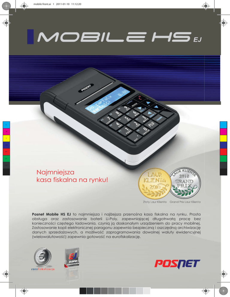 mobile front.ai 1 2011-01-10 11:12:20 C M Y CM MY CY CMY K Najmniejsza kasa fiskalna na rynku! Posnet Mobile HS EJ to najmniejsza i najlżejsza przenośna kasa fiskalna na rynku. Prosta obsługa oraz zastosowanie baterii Li-Poly, zapewniającej długotrwałą pracę bez konieczności częstego ładowania, czynią ją doskonałym urządzeniem do pracy mobilnej. Zastosowanie kopii elektronicznej paragonu zapewnia bezpieczną i oszczędną archiwizację danych sprzedażowych, a możliwość zaprogramowania dowolnej waluty ewidencyjnej (wielowalutowość) zapewnia gotowość na eurofiskalizację. mobile specyfikacja.ai 1 2011-01-10 11:23:41 liczba PLU nazwa towaru stawki VAT 4000 24 znaki 7 (A...G) wyświetlacz operatora wyświetlacz klienta alfanumeryczny z podświetleniem LCD 2 x 16 znaków alfanumeryczny z podświetleniem LCD 2 x 16 znaków typ ilość znaków w wierszu szerokość papieru szybkość wydruku długość rolki termiczny, “easy load” 40 57 mm 22 linie/s 14 m typ karta microSD/microSDHC C M komunikacja z PC 1 x USB 1 x RS232 zasilacz zewnętrzny wbudowany akumulator 230V AC/10-15V DC/1A zapewniający wydruk min. 6000 linii wymiary waga 86 x 46 x 158 mm (szer. x wys. x dł.) ~400 g (z papierem) Y CM MY CY CMY K • kopia elektroniczna paragonu (EJ) ”) • zmiana waluty ewidencyjnej („eurofiskalizacja”) • pełna obsługa operacji parkingowych • kalkulator • rozbudowane statystyki sprzedaży i zestawy raportów • sygnalizacja konieczności wykonania raportu dobowego • przypominanie o obowiązkowym przeglądzie okresowym
