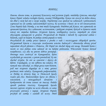POPIEL Dawno, dawno temu, w prastarej Kruszwicy nad jeziorem Goplo, niedaleko Gniezna, mieszkal ksiaze Popiel, wladca rozlegles krainy, zwanej Wielkopolska. Ksiaze nie cieszyl sie dobra slawa, nie dbal o swój lud ani o swoje wojsko. Najchetniej czas spedzal na zabawach i polowaniach, zapraszal tez do zamku cudzoziemskich rycerzy, by ucztowac i bawic sie w ich towarzystwie. Zona Popiela byla Niemka, a na imie miala Kunegunda. Podobnie jak Ksiaze, nie zajmowala sie sprawami ksiestwa, lecz zabawami, ucztowaniem, i pieknymi strojami, których w komorze miala wiecej niz niejedna królowa. Stryjowie ksiecia, wielkopolscy rycerze, niepokoili sie zlymi obyczajami, panujacymi w grodzie. Przyjezdzali do Popiela i mówili by zaprzestal zabaw i hulanek, zajal sie krajem, bo piekna ziemia popada w ruine. Przychodzili do zamku prosci kmiecie z prosba o rade i rozstrzyganie chlopskich sporów. Przypominali ksieciu o zwyczaju zwolywania wieców ludowych i obowiazku obrony przed najazdami obcych plemion z Pomorza. Ale Popiel nie sluchal skarg ani uwag. Dosiadal konia i razem ze swa piekna zona udawal sie na kolejne polowania. Wieczorami Ksiaze miewal watpliwosci, czy aby na pewno dobrze postepuje. Pewnego razu zwierzyl sie Kunegundzie, która wysluchala go uwaznie, a potem powiedzial, by nie sluchal stryjów, bo oni sa zawistni i skorzy do klótni. Uspakajala, ze nie odbiora mu wladzy. Po namysle maz odrzekal, ze chlopi groza nam buntem, jesli moi stryjowie dogadaja sie z nimi, gotowi pozbawic mnie wladzy. Kunegunda podpowiadala, ze Polska to dziwny kraj, w Niemczech kazdy rzadzi jak chce. Buntowników karze sie chlosta i wiezieniem, a niewygodnych doradców i konkurentów do tronu usuwa sie inaczej. Podala sposób podania trucizny. Kunegunda kazala mezowi zaprosic stryjów na uczte obiecala, ze sama przyrzadzi potrawy i napoje. Stryjowie Popiela przybyli do zamku i zasiedli do uczty. Mieli