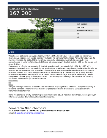 Wisełka DZIAŁKA na SPRZEDAŻ 167 000 42758 167 000 PLN 160 PLN ResidentalBuilding 25 41 Opis Wisełka jest położona na wyspie Wolin, 10 km od Międzyzdrojów. Miejscowość ma kameralny charakter, położona jest wśród sosnowych lasów na obrzeżu Wolińskiego Parku Narodowego. To świetne miejsce dla osób, które chciałyby po prostu odpocząć, wybrać się na grzyby lub powędkować w jeziorze Wisełka, do którego od oferowanych działek jest ok. 150 m. Do morza jest około 1,5 km. Posiadamy w ofercie na sprzedaż 8 działek o podobnych metrażach (od 1004 do 1058 m2), położonych w większym kompleksie, na wzniesieniu z widokiem na miasteczko Wisełkę. Działki są jeszcze nie zabudowane, ale posiadają obowiązujący plan zagospodarowania przestrzennego z przeznaczeniem pod zabudowę jednorodzinną, wolno-stojącą, całoroczną. Na granicy każdej z działek dostępna en. elektryczna, inne media (woda i kanalizacja dostępna na granicy całego kompleksu działek, przy drodze publicznej). Zapraszamy do bliższego zapoznania się z ofertą. Do działki należy doliczyć udział w drodze. Zapytaj naszego maklera o BEZPŁATNE doradztwo przy uzyskaniu KREDYTU. Współpracujemy z wieloma bankami i mamy doświadczenie w przeprowadzaniu transakcji z uwzględnieniem warunków kredytowych. Dane nie stanowią oferty handlowej w rozumieniu art. 66,§ 1 Kodeksu Cywilnego. Szczegółowych informacji udziela Biuro Nieruchomości Pomerania . Pomerania Nieruchomości tel. Lewobrzeże: 914894242 | Prawobrzeże: 913508888 email: [email protected] Pomerania Nieruchomości Powered by TCPDF (www.tcpdf.org)