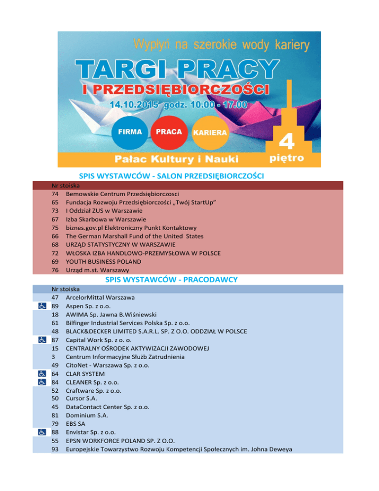 SPIS WYSTAWCÓW - SALON PRZEDSIĘBIORCZOŚCI Nr stoiska 74 Bemowskie Centrum Przedsiębiorczosci 65 Fundacja Rozwoju Przedsiębiorczości „Twój StartUp” 73 I Oddział ZUS w Warszawie 67 Izba Skarbowa w Warszawie 75 biznes.gov.pl Elektroniczny Punkt Kontaktowy 66 The German Marshall Fund of the United States 68 URZĄD STATYSTYCZNY W WARSZAWIE 72 WŁOSKA IZBA HANDLOWO-PRZEMYSŁOWA W POLSCE 69 YOUTH BUSINESS POLAND 76 Urząd m.st. Warszawy SPIS WYSTAWCÓW - PRACODAWCY Nr stoiska 47 ArcelorMittal Warszawa 89 Aspen Sp. z o.o. 18 AWIMA Sp. Jawna B.Wiśniewski 61 Bilfinger Industrial Services Polska Sp. z o.o. 48 BLACK&DECKER LIMITED S.A.R.L. SP. Z O.O. ODDZIAŁ W POLSCE 87 Capital Work Sp. z o. o. 15 CENTRALNY OŚRODEK AKTYWIZACJI ZAWODOWEJ 3 Centrum Informacyjne Służb Zatrudnienia 49 CitoNet - Warszawa Sp. z o.o. 64 CLAR SYSTEM 84 CLEANER Sp. z o.o. 52 Craftware Sp. z o.o. 50 Cursor S.A. 45 DataContact Center Sp. z o.o. 81 Dominium S.A. 79 EBS SA 88 Envistar Sp. z o.o. 55 EPSN WORKFORCE POLAND SP. Z O.O. 93 Europejskie Towarzystwo Rozwoju Kompetencji Społecznych im. Johna Deweya 85 86 98 95 97 63 58 12 2 60 21 46 23 4 17 57 51 39 43 25 44 8 38 59 41 22 80 40 82 54 101 13 77 91 28 53 7 37 70 6 11 26 5 27 33 24 36 35 19 29 Ever Grupa Sp. z o.o. Fundacja "Wsparcie i Praca Osób Niepełnosprawnych" Fundacja Aktywizacja Fundacja Normalna Przyszłość Fundacja Pomocy Młodzieży i Dzieciom Niepełnosprawnym „Hej, Koniku!” Fundacja TUS GEO2.PL SP. Z O.O. GfK Polonia Sp. z o.o. GLOBE IT SP. Z. O.O. GŁÓWNY INSPEKTORAT TRANSPORTU DROGOWEGO Grast&MTB Sp. z o.o. HP Global Business Center Sp. z o.o HTL-STREFA S.A. INTEGRUM MANAGEMENT Sp. z o.o. InterKadra Agencja Pracy i Doradztwa Personalnego Inter-Permit Group Sp. z o.o. Inter-Team Sp. z o.o. Ira Net Sp. z o. o. Jeronimo Martins Polska S.A. (BIEDRONKA) Jobhouse Sp. z o.o. KONSALNET SECURITY SP. Z O.O. KORPORACJA WSCHÓD Sp. z o.o. Krajowa Agencja Poszanowania Energii S.A. LG Eletronics Mława Sp. z o. o. LikeSoft Sp. z o. o. LS Airport Services S.A. MarcPol S.A. Mazowiecka Wojewódzka Komenda OHP Mc Donald's Polska MOBILIS Sp. z o. o. Monster Polska Sp. z o.o. Nadwiślański Oddział Straży Granicznej im. Powstania Warszawskiego OCHRONA JUWENTUS Sp. z o.o. ONE – Fundacja dla Aktywnych Kobiet PGB Human Resources Sp. z o.o. Piekarnie Lubaszka Sp. z o.o. Polska Agencja Żeglugi Powietrznej ProIDS Sp. z o.o. ProService Agent Trasferowy Sp. z o.o. PRZEDSIĘBIORSTWO KOMUNIKACJI SAMOCHODOWEJ W GRODZISKU MAZ. SP. Z O.O. PZL „Warszawa-Okęcie” S.A. RAMZES SP. Z O.O. redNet Property Group Sp. z o.o. Regent Warsaw Hotel RS Components Sp. z o.o. RTV EURO AGD Ruch S.A. SANA Natasza Jaszczyk Securitas Polska Sp. z o.o. SKILLS NET 42 34 20 92 96 90 10 31 94 78 62 99 1 56 9 71 32 14 100 83 16 30 SOLID SECURITY Sp. z o.o. Stegmann Polska Sp. z o. o. Stokrotka Sp. z o.o. Stowarzyszenie Otwarte Drzwi Stowarzyszenie Przyjaciół Integracji Stowarzyszenie SPOZA Testronic Sp. z o.o. TNT Express Worldwide (Poland) Sp. z o.o. Towarzystwo Pomocy Głuchoniewidomym Tradma Sp. z o.o. Tramwaje Warszawskie Sp. z o.o. UNIWERSYTET WARSZAWSKI - BIURO KARIER Urząd Pracy m.st. Warszawy VATTAX SP. Z O.O. Ve Interactive Poland Voice Contact Center Sp. z o.o. Wezyr Holiday Service Sp. z o.o Wojewódzki Sztab Wojskowy w Warszawie Wojewódzki Urząd Pracy w Warszawie WSI Warszawska Sp. z o.o. Zakład Doskonalenia Zawodowego w Warszawie Zakład Mechaniczno - Elektryczny "TOBZAMER" - Stanisław Tobiasz SPIS WYSTAWCÓW - STREFA PRACODAWCÓW FRANCUSKICH Nr stoiska 2 Francusko-Polska Izba Gospodarcza (CCIFP) 1 Auchan Polska Sp. z o.o. 3 UNIAPOL 4 Carrefour Polska Sp. z o.o. 7 Hunters Sp. z o.o. 5 IDES Consultants Polska Sp. z o.o. 11 KARMAR S.A. 12 Lyreco Polska S.A. 8 Manpower 6 Simply Market 10 SITA POLSKA 9 Sodexo Polska Sp. z o.o. miejsca pracy dla osób z niepełnosprawnością