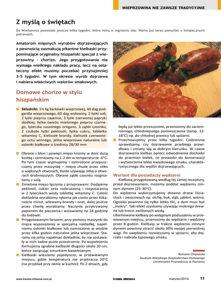WIEPRZOWINA NIE ZAWSZE TRADYCYJNIE Z myślą o świętach Do Wielkanocy pozostało jeszcze kilka tygodni, które miną w mgnieniu oka. Warto już teraz pomyśleć o świątecznych potrawach. Amatorom mięsnych wyrobów dojrzewających z pewnością zasmakują pikantne kiełbaski przypominające oryginalny hiszpański specjał z wieprzowiny – chorizo. Jego przygotowanie nie wymaga wielkiego nakładu pracy, lecz na ostateczny efekt musimy poczekać przynajmniej 3-5 tygodni. W tym okresie wyrób dojrzewa i nabiera właściwych walorów smakowych. Domowe chorizo w stylu hiszpańskim Składniki: 1½ kg karkówki wieprzowej, 40 dag pod- gardla wieprzowego, 60 dag wołowiny, 2 łyżki soli, 2 łyżki pieprzu cayenne, 3 łyżki czerwonej papryki słodkiej, łyżka świeżo mielonego pieprzu czarnego, łyżeczka suszonego oregano, 3 ząbki czosnku, 2 czubate łyżki peklosoli, łyżka cukru, tabletka witaminy C, kieliszek brandy, kieliszek czerwonego octu winnego, jelita wieprzowe naturalne lub osłonki białkowe o średnicy 28/30 mm Obrane z błon i powięzi mięso kroimy w dość dużą kostkę i zamrażamy na 1-2 dni w temperaturze -6°C. Po tym czasie wyjmujemy i zamrożone przepuszczamy przez maszynkę – mięso chude przez sitko o większych otworach, tłuste używając sitka o otworach drobniejszych. Obrane ząbki czosnku rozgniatamy z solą. Zmielone mięso łączymy z przyprawami. Dodajemy peklosól, cukier oraz rozkruszoną i rozpuszczoną w 2 łyżeczkach wody tabletkę witaminy C. Całość dokładnie wyrabiamy rękoma jak ciasto przez kilkanaście minut, wlewamy brandy i ocet, dalej jeszcze przez chwilę wyrabiamy. Naczynie przykrywamy papierem do pieczenia i wstawiamy na 24 godziny do lodówki. Przygotowanym farszem, przy pomocy maszynki do mięsa wyposażonej w specjalną nakładkę, napełniamy osłonki białkowe lub namoczone w wodzie przez kilka godzin naturalne jelita wieprzowe. Staramy się jelita napełniać dokładnie, by nie zostawały w nich żadne puste przestrzenie. Po wypełnieniu formujemy zgrabne kiełbaski długości około 20 cm, końce związując sznurkiem bawełnianym. Kiełbaski wieszamy pojedynczo, w przewiewnym miejscu, gdzie temperatura nie przekracza 20°C (na przykład przy oknie w kuchni). Po 2 dniach, gdy www.trzoda-chlewna.com.pl będą już lekko przesuszone, przenosimy do zaciemnionego, chłodniejszego pomieszczenia (temp. 1218°C) np. do chłodnej piwnicy lub spiżarni. Przechowujemy przez kilka tygodni. Codziennie sprawdzamy, czy dojrzewanie przebiega prawidłowo i zmiany idą w dobrym kierunku. W czasie dojrzewania kiełbas oprócz odwodnienia dochodzi do przemian białek, co prowadzi do konserwacji i wytworzenia lekko kwaskowego smaku, charakterystycznego dla wędlin dojrzewających. Wariant dla posiadaczy wędzarni Kiełbasę przygotowaną według tej samej receptury, przed dojrzewaniem, możemy poddać wędzeniu zimnym dymem (25-30°C). Do wędzenia wykorzystujemy drewno drzew liściastych i owocowych np. olchę, buk, dąb, jabłoń, wiśnia. Ognisko powinno się tylko lekko tlić, a dym musi być „mokry”. Taki efekt uzyskamy używając mokrego drewna lub trocin zwilżonych wodą. Uformowane kiełbasy po wstępnym podsuszeniu w przewiewnym miejscu, przenosimy do wędzarni i wędzimy przez 8 godzin. Kiełbasy w trakcie wędzenia zimnym dymem powinny stracić około 30% swojej pierwotnej wagi. Po uwędzeniu rozwieszamy w spiżarni, aby dojrzała i nabrała typowego smaku. Romana Chojnacka Studium Wiejskiego Gospodarstwa Domowego Uniwersytet Przyrodniczy w Poznaniu marzec/2014 11