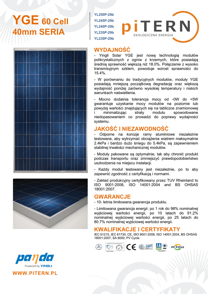 YGE 60 Cell 40mm SERIA YL250P-29b YL245P-29b YL240P-29b YL235P-29b YL230P-29b WYDAJNOŚĆ - Yingli Solar YGE jest nową technologią modułów polikrystalicznych z ogniw z krzemych, które posiadają średnią sprawność większą niż 18.0%. Połączenie z wysoko transmisyjnym szkłem, powoduje wzrost sprawności do 15.4%. - W porównaniu do tradycyjnych modułów, moduły YGE posiadają mniejszą początkową degradację oraz większą wydajność poniżej zarówno wysokiej temperatury i niskich warunkach naświetlenia. - Mocno dodatnia tolerancja mocy od -0W do +5W gwarantuje uzyskanie mocy modułów na poziomie lub powyżej wartości znajdujących się na tabliczce znamionowej i minimalizując straty modułu spowodowane niedopasowaniem co prowadzi do poprawy wydajności systemu. JAKOŚĆ I NIEZAWODNOŚĆ - Odporne na korozje ramy aluminiowe niezależnie testowane, aby wytrzymać obciążenia wiatrem maksymalnie 2.4kPa i bardzo dużo śniegu do 5.4kPa, są zapewnieniem stabilnej trwałości mechanicznej modułów. - Moduły pakowane są optymalnie, tak aby chronić produkt podczas transportu oraz zmniejszyć prawdopodobieństwo uszkodzenia na miejscu instalacji. - Każdy moduł testowany jest niezależnie, po to aby zapewnić zgodność z certyfikacją i normami. - Zakład produkcyjny certyfikowany przez TUV Rheinland to ISO 9001:2008, ISO 14001:2004 and BS OHSAS 18001:2007. GWARANCJE - 10- letnia limitowana gwarancja produktu. - Limitowana gwarancja energii: po 1 rok do 98% nominalnej wyjściowej wartości energii, po 10 latach do 91.2% nominalnej wyjściowej wartości energii, po 25 latach do 80.7% nominalnej wyjściowej wartości energii. KWALIFIKACJE I CERTYFIKATY IEC 61215, IEC 61730, CE, ISO 9001:2008, ISO 14001:2004, BS OHSAS 18001:2007, SA 8000, PV Cycle. WWW.PITERN.PL PANDA 60 Cell 40mm SERIA WYDAJNOŚĆ ELEKTRYCZNA Parametry elektryczne w Standardowych Warunkach Testowych (STC) Typ modułu Moc wyjściowa Tolerancja mocy wyjściowej Sprawność modułu Napięcie max. Prąd max. Napięcie otwartego obwodu Prąd zwarcia Pmax Pmax m Vmax Imax Voc Isc W W % V A V A YL250P-29b YL245P-29b YL240P-29b YL235P-29b YL230P-29b 250 245 235 230 15.3 30.4 8.24 38.4 8.79 15.0 30.2 8.11 37.8 8.63 240 -0 / +5 14.7 29.5 8.14 37.5 8.65 14.4 29.5 7.97 37.0 8.54 14.1 29.5 7.80 37.0 8.40 STC: 1000W/m2 nasłonecznienia, 25°C temperatury, AM 1,5 współczynnik referencyjnych mas powietrza, zależne od EN 60904-3 Parametry elektryczne w Nominalnej temperaturze pracy ogniw (NOCT) Typ modułu Moc wyjściowa Napięcie max. Prąd max. Napięcie otwartego obwodu Prąd zwarcia Pmax Vmax Imax Voc Isc YL250P-29b YL245P-29b YL240P-29b YL235P-29b YL230P-29b 181.1 27.6 6.56 35.4 7.12 177.9 27.2 6.54 34.5 6.99 174.3 26.6 6.56 34.2 7.01 170.7 26.6 6.42 33.8 6.92 167.0 26.6 6.29 33.8 6.81 W V A V A NOCT: przy otwartym obwodzie modułu, 800W/m2 nasłonecznienia, 20°C temperatury, 1 m/s prędkość wiatru CHAR AKTERYSTYKA TERMICZNA Nominalna temperatura pracy ogniwa NOCT Temperaturowy współczynnik dla Pmax ɣ Temperaturowy współczynnik dla VOC βVoc αIoc βmax Temperaturowy współczynnik dla ISC Temperaturowy współczynnik dla Vmax °C % / °C % / °C % / °C % / °C 46 +/- 2 -0.45 -0.33 0.06 -0.45 WARUNKI PRACY Max. napięcie systemu Max. seria znamionowa bezpiecznika Ograniczony prąd wsteczny Zakres temperatury pracy Max. obciążenie statyczne, przód Max. obciążenie statyczne, tył Max. uderzenie gradu (wielkość / prędkość) 1000VDC 15A 15A -40 do 85°C 5400Pa 2400Pa 25mm / 23 m/s MATERI AŁY KONSTRUKCYJNE Przednie pokrycie (materiał / grubość) Ogniwo (jakość / materiał / wielkość) Osłonki (materiał) Rama (materiał / kolor / kolor anodowania) Połączenie skrzyni (stopień ochrony) Kabel (długość / przekrój) Złącze kablowe / stopień ochrony tel. +48 61-679-14-14 email: [email protected] WWW.PITERN.PL szkło- niska zawartość żelaza / 3.2mm 60 / polikrystaliczy krzem / 156mm x 156mm ethylene vinyl acetate (EVA) stop anodowanego aluminium / srebrny / czysty ≥ IP65 1100mm / 4mm2 MC4 / IP67 Uwaga: Przeczytaj instrukcję obsługi i montażu modułów Yingli Solar przed instalacją i użyciem. Nasi partnerzy