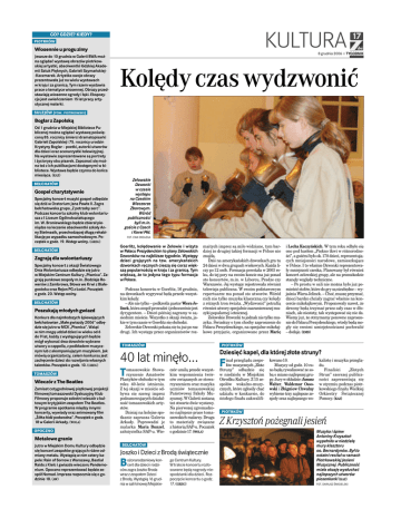 KULTURA CO? GDZIE? KIEDY? PIOTRKÓW Wiosennie u progu zimy Jeszcze do 10 grudnia w Galerii BWA można oglądać wystawę obrazów piotrkowskiej artystki, absolwentki łódzkiej Akademii Sztuk Pięknych, Gabrieli Szymańskiej-Kaczmarek. Artystka swoje obrazy prezentowała już na wielu wystawach w kraju i za granicą. Tym razem wystawia prace o tematyce wiosennej. Obrazy przedstawiają wiosenne ogrody i łąki. Ekspozycja jest uwieńczeniem 15 lat pracy artystycznej malarki. 17 8 grudnia 2006 đ TYGODNIK Kolędy czas wydzwonić SULEJÓW (POW. PIOTRKOWSKI) Boglar z Zapolską Od 1 grudnia w Miejskiej Bibliotece Publicznej można oglądać wystawę poświęconą 85. rocznicy śmierci dramatopisarki Gabrieli Zapolskiej i 75. rocznicy urodzin Krystyny Boglar – poetki, autorki utworów dla dzieci oraz scenarzystki telewizyjnej. Na wystawie zaprezentowane są portrety i życiorysy obu pisarek. Zapoznać się można też z ich publikacjami dostępnymi w bibliotece. Wystawa będzie czynna do końca miesiąca. (KAZ) BEŁCHATÓW Gospel charytatywnie Specjalny koncert muzyki gospel odbędzie się dziś w Oratorium Jana Pawła II. Zagra bełchatowska grupa „Z potrzeby serc”. Podczas koncertu szkolny klub wolontariusza z I Liceum Ogólnokształcącego im. W. Broniewskiego będzie zbierał pieniądze na leczenie absolwentki szkoły Anny Stelmasik, przechodzącej długą rehabilitację po wypadku samochodowym. Początek o godz. 19. Wstęp wolny. (GREG) BEŁCHATÓW Zagrają dla wolontariuszy Specjalny koncert z okazji Światowego Dnia Wolontariusza odbędzie się jutro w Miejskim Centrum Kultury „Piwnica”. Zagrają punkowe zespoły m.in. Złodzieje Rowerów z Zambrowa, Słowa we Krwi z Białegostoku oraz Rejon PG z Łodzi. Początek o godz. 20. Wstęp wolny. BEŁCHATÓW Poszukają młodych gwiazd Konkurs dla najmłodszych śpiewających bełchatowian „Małe gwiazdy 2006” odbędzie się jutro w MCK „Piwnica”. Wziąć w nim mogą udział dzieci w wieku od 6 do 9 lat, każdy z występujących będzie mógł wykonać dwa dowolnie wybrane utwory a cappella, z podkładem muzycznym lub z akompaniującym muzykiem. Jak mówią organizatorzy, celem konkursu jest zachęcenie dzieci do rozwijania własnych talentów. Początek o godz. 10. (GREG) TOMASZÓW Wieczór z The Beatles Zamiast cotygodniowej piątkowej projekcji filmowej tomaszowski Dyskusyjny Klub Filmowy proponuje sobotni wieczór z kultowym brytyjskim zespołem The Beatles. W programie spotkania między innymi koncerty, wywiady oraz animowany film „Żółta łódź podwodna”. Początek o godz. 18 w Galerii Arkady. (WOLA) OPOCZNO Zelowskie Dzwonki w czasie występu na Czeskim Wieczorze Zborowym. Wśród publiczności byli m.in. goście z Czech i Korei Płd. FOT. EWA DRZAZGA Goerlitz, kolędowanie w Zelowie i wizyta w Pałacu Prezydenckim to plany Zelowskich Dzwonków na najbliższe tygodnie. Występy dzieci grających na tzw. amerykańskich dzwonkach ręcznych cieszą się coraz większą popularnością w kraju i za granicą. Tym większą, że to jedyna tego typu formacja w Polsce. Podczas koncertu w Goerlitz, 16 grudnia, na dzwonkach wygrywać będą przede wszystkim kolędy. – Ale nie tylko – podkreśla pastor Wiera Jelinek, która zespół prowadzi i jednocześnie jest dyrygentem. – Dzień później zagramy w sąsiednim mieście. Wszystko z okazji święta, jakie w tym czasie w Goerlitz się obchodzi. Zelowskie Dzwonki pokażą się tu już po raz drugi. Ich występy przez organizatorów roz- maitych imprez są miło widziane, tym bardziej że drugiej takiej formacji w Polsce nie znajdą. Dziś na amerykańskich dzwonkach gra tu 24 dzieci w dwu grupach wiekowych. Każda liczy po 12 osób. Formacja powstała w 2003 roku, do tej pory na swoim koncie ma już ponad sto koncertów, m.in. w Libercu, Pradze czy Warszawie. Jej występy rejestrowała również telewizja publiczna. W swoim podstawowym repertuarze ma ponad sto utworów. Wśród nich nie tylko muzykę klasyczną czy kolędy z różnych tron świata. „Wydzwonić” potrafią również utwory specjalnie zaaranżowanej muzyki popularnej i etnicznej. Zelowskie Dzwonki to jednak nie tylko muzyka. Świadczy o tym choćby zaproszenie do Pałacu Prezydenckiego, na specjalne mikołajkowe przyjęcie, organizowane przez Marię TOMASZÓW PIOTRKÓW 40 lat minęło... T omaszowskie Stowarzyszenie Amatorów Plastyków obchodzi w tym roku 40-lecie istnienia. Z tej okazji w mieście odbywa się szereg imprez podsumowujących działalność tomaszowskich artystów. Dzisiaj na kolejne spotkanie zaprasza Galeria Arkady. Poprowadzi je malarka Maria Bunzel, założycielka SAP-u. Wie- czór umilą przede wszystkim wspomnienia twórców związanych ze stowarzyszeniem oraz muzyka uczniów tomaszowskiej Państwowej Szkoły Muzycznej. W Galerii zostaną też otwarte dwie wystawy. Na pierwszej zgromadzono najlepsze prace tomaszowskich malarzy. Druga to materiały związane z historią SAP-u. Początek o godzinie 17. (WOLA) Metalowe granie Jutro w Miejskim Domu Kultury odbędzie się koncert zespołów grających różne odmiany metalu. Wystąpią w nim cztery kapele: Rain of Sorrow z Warszawy, Bastial Raids z Kielc i gwiazda wieczoru Pandemonium. Opoczno reprezentować będzie zespół Nomad. Impreza rozpocznie się o godzinie 18. (AW) BEŁCHATÓW Joszko i Dzieci z Brodą świątecznie B ożonarodzeniowy koncert dla dzieci i rodziców zagra Joszko Broda wraz z zespołem Dzieci z Brodą. Wystąpią 16 grudnia w sali kinowej Miejskie- i Lecha Kaczyńskich. W tym roku odbyło się ono pod hasłem „Piękno tkwi w różnorodności”, a gośćmi było ok. 170 dzieci, reprezentujących mniejszości narodowe, zamieszkujące w Polsce. I to właśnie Dzwonki reprezentowały mniejszość czeską. Planowany był również koncert zelowskiej grupy, ale na przeszkodzie stanęły względy techniczne. – Po prostu w sali nie można było już pomieścić stołów, które do gry są niezbędne – wyjaśnia 