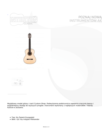 Wyjątkowy model gitary z serii Custom Shop. Podwyższona podstrunnica zapewnia znacznie lepszy i wygodniejszy dostęp do wyższych progów. Instrument wykonany z najlepszych materiałów. Twardy futerał w zestawie. Top: lity Świerk Europejski Boki i tył: lity Indyjski Palisander Strona 1 z 2 Podstrunnica: Heban Gryf: Mahoń Szerokość przy siodełku: 52mm Skala: 650mm Klucze:DJ308X-E2 Mostek: Palisander Lakier: połysk Struny: Martinez podwyższona podstrunnica (custom shop) widoczna na zdjęciu pręt do regulacji gryfu Futerał w komplecie Strona 2 z 2