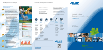 Produkty, koncepcje, roz wiązania. Inteligentna technologia! LENTO oferuje technologię pełną zalet bez żadnych kompromisów. Konstruujemy dla potrzeb klienta Wysoka jakość, 100% sprężonego powietrza bez oleju znajduje zastosowanie nie tylko w przemyśle medycznym, farmaceutycznym, spożywczym czy elektrotechnicznym, ale wszędzie tam gdzie na pierwszym miejscu jest najwyższa jakość produktów. Od 100 lat ALUP produkuje wysokiej jakości sprężarki. Nasz innowacyjny program przewiduje rozwiązania dla potrzeb klientów we wszystkich zastosowaniach przemysłowych. W procesie sprężania stosowany jest jedynie naturalny surowiec – woda. Dzięki temu otrzymujemy: Czyste, przyjazne dla środowiska sprężone powietrza bez oleju, brudu i drobinek kurzu, które są odfiltrowane przez wodę Czysty kondensat dostaje się bezpośrednio do systemu odprowadzającego. Najniższe temperatury podczas kompresji dzięki optymalnej wymianie ciepła – wysoka sprawność procesu sprężania. Sprężarki śrubowe 100 % 0% Czas Tradycyjne 100 % stertowanie 50 % bieg jałowy 0% czas wybiegu Czas Sterowanie 100 % ze zmienną prędkością 50 % technologia 0% SCD Prąd znamionowy silnika 8 7 Czas Bezpośredni rozruch gwiazda/trójkąt LENTO Rozruch płynny 6 5 Idealna kombinacja 4 LENTO ze stałą prędkością obrotową pokrywa podstawowe obciążenie sprężarki LENTO ze zmienną prędkością pokrywa każde dodatkowe zapotrzebowanie występujące w systemie Zapewnia minimalną temperaturę produkowanego sprężonego powietrza, oddzielny osuszacz nie jest wymagany Redukcja kosztów, prosta instalacja Bezolejowe do 10 bar 0,75 – 12 kW Ze zmienną prędkością obrotową i napędem bezpośrednim 5,5 – 260 kW 4 – 13 bar Standardowe do 10 bar 1,5 – 15 kW Bezolejowe z wtryskiem wody 11 – 55 kW 4 – 13 bar 2 1 Dmuchawy O stałej i zmiennej prędkości. 0,1 – 250 kW 50 – 1000 mbar Czas rozruchu Zakres ciśnienia (bar) 9.2 Układy uzdatniania Dystrybutor: 8.8 8.6 Potencjalne oszczędności 8.4 8.2 LENTO Ciśnienie odciążenia Osuszacze chłodnicze 0,27 – 100 m3 /min Osuszacze adsorpcyjne 0,08 – 145 m3/min Wysokociśnieniowe do 40 bar 2,2 – 45 kW Filtry sieciowe 0,5 – 225 m3/min Doprężacze od 15 do 40 bar 2,2 – 30 kW Alup Kompressoren Polska Sp. z o.o. Tradycyjny tryb pracy, dociążenie-odciążenie Ciśnienie odciążenia Na zamówienie Filtry z aktywnym wkładem węglowym 0,08 – 145 m3/min Al. Krakowska 26, JANKI 05-090 RASZYN k/WARSZAWY www.alup.pl 9.0 7.8 Turbo sprężarki Na średnie ciśnienia do 15 bar 1,5 – 15 kW 0 8.0 Zmniejszenie kosztów serwisu oraz konserwacji pozwala na łączenie z innymi bezolejowymi sprężarkami Sprężarki tłokowe Stałonapędowe 2,2 – 500 kW 4 – 13 bar 3 Wbudowany osuszacz ALUP – opieramy się na doświadczeniu! 50 % Seria modeli LENTO o zmiennej prędkości obrotowej daje wymierne korzyści i oszczędności kosztów: Dzięki redukcji ciśnienia oszczędzasz pieniądze! Dotyczy to nie tylko doboru urządzeń, ale również stałej współpracy w zakresie serwisu, obsługi i monitorowania eksploatacji urządzeń. Sprężarki śrubowe bezolejowe z wtryskiem wody Seria LENTO Zapotrzebowanie Dokładnie dopasowanie do cyklu produkcji. Eliminacja strat energetycznych związanych z biegiem jałowym sprężarek Oszczędność energii przy uruchomieniu bez udaru prądowego Łatwy wybór opcji ciśnienia od 5 do 10 bar Naszym celem jest nie tylko dostarczanie sprężarek, ale również zapewnienie wszechstronnych konsultacji dla wszystkich Klientów. Tel.: +48 0 22 720 65 90 Fax: +48 0 22 720 65 95 e-mail: [email protected] Kompleksowe uzdatnianie kondensatu do 120 m3/min Układy sterujące i monitorujące Sterowanie nadrzędne Wizualizacja (dla PC) Telemonitoring (stałe połączenie z serwisem) Wydajność 0.81 - 9.65 m3/min Inteligentne, innowacyjne, niezawodne Konstrukcja, budowa, priorytety Dane techniczne Zmienno-obrotowe W 100% bezolejowe sprężone powietrze Pełna elastyczność dla zmiennej oraz stałej prędkości obrotowej Duża oszczędność energii Stało-obrotowe Mocna i cicha Bezpieczna w obsłudze Jasny, prosty układ ułatwia serwisowanie Przyjazna dla środowiska Korzyści dla naszych klientów: Nasze urządzenia produkowane są w oparciu o najnowsze osiągnięcia myśli technicznej i zgodnie z normą ISO 9001. Satysfakcja klienta oraz jakość urządzeń stanowią dla nas najwyższy priorytet. Maszyny spełniają również kryteria normy charakteryzującej pomiar wydajności i sprawności ISO 1217 – 3 aneks C. Liczne warianty i opcje pozwalają na wykorzystanie sprężarek LENTO w ogromnej ilości zastosowań i uzyskanie wymaganej jakości sprężonego powietrza. Ciśnienie robocze Wydajność zgodnie z normą Moc ISO 1217 (aneks C-1996) Silnika Długość Szerok. Wys. Waga bar min. (m3/min) max. (m3/min) kW mm mm mm kg 22 37 55 5 – 10 4.5 – 10 4.5 – 10 0.81 2.52 2.51 3.50 6.48 9.65 22 37 55 843 2435 2435 1105 965 965 1795 1840 1840 595 1090 1090 11 5 – 10 11 843 1105 1795 535 5 – 10 2.52 15 843 1105 1795 553 18 5 – 10 3.10 18.5 843 1105 1795 577 22 5 – 10 - 1.81 15 3.53 22 843 1105 1795 625 30 7.5 – 13 5.31 30 2435 965 1840 1121 37 7.5 – 13 6.43 37 2435 965 1840 1193 45 7.5 – 13 7.71 45 2435 965 1840 1216 55 7.5 – 13 - 9.16 55 2435 965 1840 1273 Typ Czyste sprężone powietrze, ekonomiczna produkcja: Zespół śrubowy – Jednostopniowy, z wtryskiem wody – Obudowa – odlew z brązu – Śruby polimeryzowane ceramicznie – Niska temperatura sprężania - poniżej 60°C Silnik elektryczny – o wysokiej sprawności – Klasa ochrony IP 55 – Kompaktowy o dużej mocy, bezpieczny podczas działania, optymalny układ chłodzenia Wersja-plus z wbudowanym osuszaczem – Sprężarka dostarcza sprężone powietrze osuszone Ponadto oferujemy specjalne wersje urządzeń. . * V przy ciśnieniu roboczym 7,5 bar(e) chłodzone wodą (opcjonalnie powietrzem) LENTO to rozwiązanie dla: Aplikacja 1 Aplik