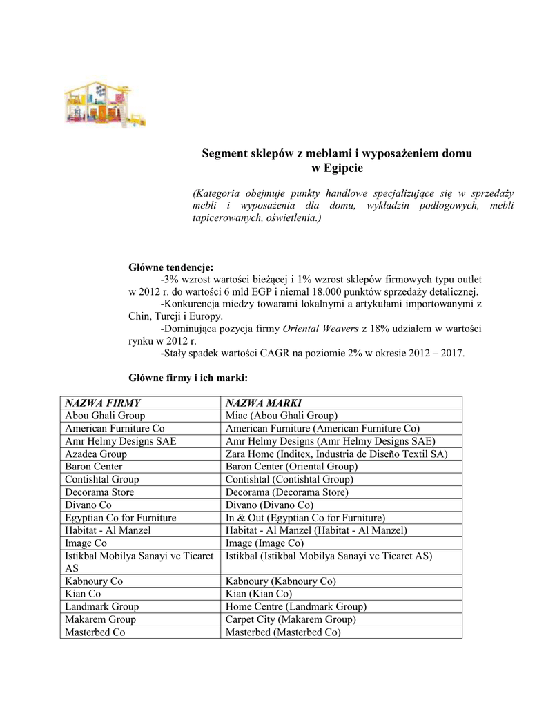 Segment sklepów z meblami i wyposażeniem domu w Egipcie (Kategoria obejmuje punkty handlowe specjalizujące się w sprzedaży mebli i wyposażenia dla domu, wykładzin podłogowych, mebli tapicerowanych, oświetlenia.) Główne tendencje: -3% wzrost wartości bieżącej i 1% wzrost sklepów firmowych typu outlet w 2012 r. do wartości 6 mld EGP i niemal 18.000 punktów sprzedaży detalicznej. -Konkurencja miedzy towarami lokalnymi a artykułami importowanymi z Chin, Turcji i Europy. -Dominująca pozycja firmy Oriental Weavers z 18% udziałem w wartości rynku w 2012 r. -Stały spadek wartości CAGR na poziomie 2% w okresie 2012 – 2017. Główne firmy i ich marki: NAZWA FIRMY Abou Ghali Group American Furniture Co Amr Helmy Designs SAE Azadea Group Baron Center Contishtal Group Decorama Store Divano Co Egyptian Co for Furniture Habitat - Al Manzel Image Co Istikbal Mobilya Sanayi ve Ticaret AS Kabnoury Co Kian Co Landmark Group Makarem Group Masterbed Co NAZWA MARKI Miac (Abou Ghali Group) American Furniture (American Furniture Co) Amr Helmy Designs (Amr Helmy Designs SAE) Zara Home (Inditex, Industria de Diseño Textil SA) Baron Center (Oriental Group) Contishtal (Contishtal Group) Decorama (Decorama Store) Divano (Divano Co) In & Out (Egyptian Co for Furniture) Habitat - Al Manzel (Habitat - Al Manzel) Image (Image Co) Istikbal (Istikbal Mobilya Sanayi ve Ticaret AS) Kabnoury (Kabnoury Co) Kian (Kian Co) Home Centre (Landmark Group) Carpet City (Makarem Group) Masterbed (Masterbed Co) Mefco Helwan Co For Furniture Production SAE Oriental Group Oriental Weavers Co Mefco Helwan (Mefco Helwan Co For Furniture Production SAE) Misr America Carpet Mills (Oriental Group) Oriental Weavers (Oriental Weavers Co) źródło: Passport, Euromonitor, 2012, za EMIS źródło: Passport, Euromonitor, 2012, za EMIS źródło: Passport, Euromonitor, 2012, za EMIS Przydatne linki: - Egyptian Furniture Export Council: www.efecfurniture.com - Federation of Egyptian Industries: http://www.fei.org.eg/chambers.asp?/ Targi branży meblarskiej: - Le Marché, http://lemarcheegypt.com/ - Woodshow, http://www.cairowoodshow.com/ - Indoors, http://www.in-doors.net/ - Kitchen & Bathroom, http://kitchen-bathroomegypt.com/ Opracowanie: WPHI w Kairze; lipiec 2013 r.