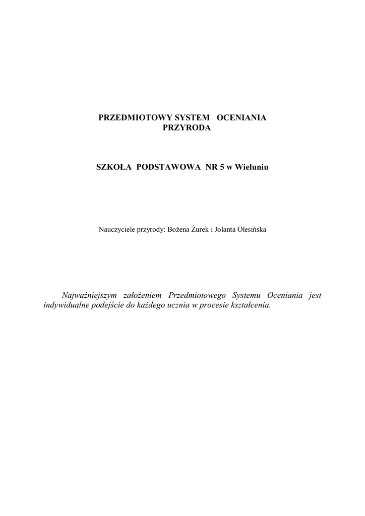 PRZEDMIOTOWY SYSTEM OCENIANIA PRZYRODA SZKOŁA PODSTAWOWA NR 5 w Wieluniu Nauczyciele przyrody: Bożena Żurek i Jolanta Olesińska Najważniejszym założeniem Przedmiotowego Systemu Oceniania jest indywidualne podejście do każdego ucznia w procesie kształcenia. Przedmiotowy System Oceniania z przyrody dla klas IV-VI Celem nauczania przyrody w szkole podstawowej jest zainteresowanie światem, jego różnorodnością, wskazywanie zależności istniejących w środowisku przyrodniczym, kształtowanie umiejętności obserwacji zjawisk przyrodniczych, ukazywanie współzależności człowieka i środowiska. Realizacji tych celów służy ocena wiadomości i umiejętności ucznia. Ma ona za zadanie dostarczyć informacji o stopniu opanowania wiedzy i umiejętności uczniowi, jego rodzicom oraz nauczycielowi, ma wykrywać braki w wiedzy i umiejętnościach oraz pokazywać sposoby ich likwidacji. Ma również motywować ucznia do systematycznej pracy. Przedmiotem oceny są: wiadomości, umiejętności przedmiotowe i ponadprzedmiotowe, postawy i wartości kształtowane w procesie dydaktycznym. Podstawa prawna do opracowania PSO 1.Rozporządzenie MEN z dn.30.04.2007r. 2.WSO szkoły 3.Podstawa programowa kształcenia ogólnego dla przedmiotu przyroda 1. PRZEDMIOTOWY PROGRAM OCENIANIA Przedmiotem oceny są: Poziom I - Wiadomości Zapamiętanie - faktów, zjawisk, pojęć, określeń, rozróżnianie różnych źródeł informacji Rozumienie - istoty faktów, zjawisk, zależności zachodzących w przyrodzie, pojęć, schematów i wykresów Poziom II - Umiejętności Sytuacje typowe - poszukiwanie i gromadzenie informacji korzystanie z podręcznika, literatury, mediów posługiwanie się znanymi pojęciami podczas wypowiedzi formułowania opinii o zjawiskach przyrody posługiwanie się przyrządami, mapami, planami, atlasami Sytuacje problemowe, samodzielne uogólnianie, porównywanie i wyciąganie wniosków dostrzeganie związków, zależności, prawidłowości wykorzystanie posiadanej wiedzy w życiu codziennym identyfikowanie roślin, zwierząt, form terenu, zjawisk, procesów rozpoznawanie właściwych i niewłaściwych postaw wobec środowiska przyrodniczego Poziom III - Aktywność / postawa / przygotowanie do zajęć udział w wykonywanych zadaniach własna inicjatywa w zdobywaniu wiedzy i umiejętności chęć i umiejętność współpracy w grupie funkcjonowanie w grupie jako członek i lider tolerancja wobec innych Wymagania na poszczególne stopnie szkolne w klasyfikacji semestralnej i rocznej: OCENA CELUJĄCA - wiedza i umiejętności ucznia znacznie przekraczają program nauczania - biegle posługuje się zdobytymi wiadomościami i umiejętnościami - samodzielność myślowa - propozycje własnych ( często nietypowych ) rozwiązań problemów - OCENA BARDZO DOBRA opanowanie materiału nauczania w pełnym zakresie umiejętność wykorzystania swoich wiadomości i umiejętności do rozwiązywania nowych problemów OCENA DOBRA opanowanie wiedzy i umiejętności w zakresie umożliwiającym samodzielne myślenie przyczynowo –skutkowe dobre wykorzystanie swoich wiadomości do rozwiązywania nowych problemów OCENA DOSTATECZNA opanowanie wiedzy w ograniczonym stopniu, a braki wiedzy pozwalają jeszcze na dalszą edukację - rozwiązywanie typowych zadań o niskim stopniu trudności OCENA DOPUSZCZAJĄCA opanowanie wiedzy w bardzo ograniczonym zakresie rozwiązywanie prostych, typowych zadań o niskim stopniu trudności z pomocą nauczyciela - OCENA NIEDOSTATECZNA nieopanowanie na minimalnym poziomie wymagań programowych nieumiejętność rozwiązywania elementarnych problemów ( nawet przy pomocy nauczyciela) Kontroli i ocenie podlegają prace pisemne, wypowiedzi ustne i prace praktyczne. 1. Pisemne: - odpowiedź na pytania - rozwiązywanie wskazanych zadań, wykonywanie ćwiczeń - testy, sprawdziany - kartkówki 2. Ustne: - kilkuzdaniowa wypowiedź - udział w dyskusji - prezentacja pracy własnej lub grupy 3. Praktyczne: - wytwory pracy np. album, słownik, praca plastyczna, projekcja multimedialna - gromadzenie i segregacja materiałów - posługiwanie się mapą, atlasem, słownikiem, - współpraca w grupie - samokształcenie Ocenie podlegają: - sprawdziany wiadomości - odpowiedzi ustne - kartkówki (obejmują materiał z 3 ostatnich lekcji, mogą być nie zapowiadane) - aktywność na lekcji (3 plusy – ocena bardzo dobra) - zeszyt ćwiczeń - dodatkowe prace np. referaty, wywiady, zielniki, projekcje, itp. - prace domowe ( 3 minusy ocena niedostateczna) Sprawdziany, testy są obowiązkowe i zapowiedziane co najmniej tydzień wcześniej. Omówiony jest ich zakres. Oceniane są na podstawie punktów, które przeliczane są na oceny: 0 – 34% niedostateczn y 35 – 50% dopuszczający 51 – 69% dostateczny 70 – 85% dob ry 85 – 100% bard zo dob ry Powyżej 90% maksymalnej liczby punktów oraz rozwiązani e zadania dodat kowego wykraczającego p oza p rogram nau czania – celujący Uczeń może poprawić sprawdzian lub test, jeżeli uzyskał oceny: niedostateczną w ciągu dwóch tygodni od oddania pracy i tylko raz. Kartkówki obejmują materiał z trzech ostatnich lekcji, nie są zapowiedziane i nie podlegają poprawie. Każdy uczeń ma prawo do oceny za wykonane prace nadobowiązkowe. Dopuszcza się dwukrotne nie odrobienie zadania domowego w semestrze, za każde następne stawiana jest ocena ndst. Prace domowe, prowadzenie zeszytów przedmiotowych, którymi są zeszyty ćwiczeń mają wpływ na ocenę końcową. Aktywność ucznia na lekcji może być oceniana w sposób punktowy (3 plusy ocena bardzo dobra) / pod koniec semestru następuje podsumowanie i przeliczenie punktów na ocenę /. Uczeń nie ma możliwości poprawiania ocen przed klasyfikacją. Uczeń ma prawo być nie przygotowany do lekcji bez podania przyczyny dwa razy w semestrze , o ile zgłosi ten fakt przed lekcją , to nie ponosi żadnych konsekwencji (oprócz znaku- np. ) . Nie dotyczy to jednak lekcji , 
