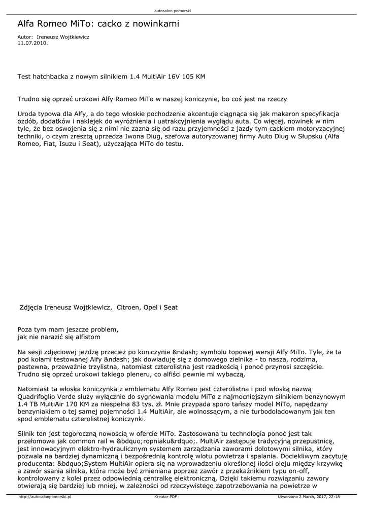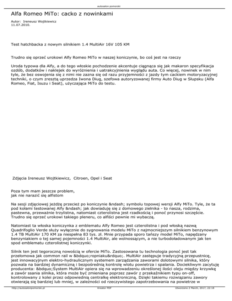 autosalon pomorski Alfa Romeo MiTo: cacko z nowinkami Autor: Ireneusz Wojtkiewicz 11.07.2010. Test hatchbacka z nowym silnikiem 1.4 MultiAir 16V 105 KM Trudno się oprzeć urokowi Alfy Romeo MiTo w naszej koniczynie, bo coś jest na rzeczy Uroda typowa dla Alfy, a do tego włoskie pochodzenie akcentuje ciągnąca się jak makaron specyfikacja ozdób, dodatków i naklejek do wyróżnienia i uatrakcyjnienia wyglądu auta. Co więcej, nowinek w nim tyle, że bez oswojenia się z nimi nie zazna się od razu przyjemności z jazdy tym cackiem motoryzacyjnej techniki, o czym zresztą uprzedza Iwona Diug, szefowa autoryzowanej firmy Auto Diug w Słupsku (Alfa Romeo, Fiat, Isuzu i Seat), użyczająca MiTo do testu. Zdjęcia Ireneusz Wojtkiewicz, Citroen, Opel i Seat Poza tym mam jeszcze problem, jak nie narazić się alfistom Na sesji zdjęciowej jeżdżę przecież po koniczynie – symbolu topowej wersji Alfy MiTo. Tyle, że ta pod kołami testowanej Alfy – jak dowiaduję się z domowego zielnika - to nasza, rodzima, pastewna, przeważnie trzylistna, natomiast czterolistna jest rzadkością i ponoć przynosi szczęście. Trudno się oprzeć urokowi takiego pleneru, co alfiści pewnie mi wybaczą. Natomiast ta włoska koniczynka z emblematu Alfy Romeo jest czterolistna i pod włoską nazwą Quadrifoglio Verde służy wyłącznie do sygnowania modelu MiTo z najmocniejszym silnikiem benzynowym 1.4 TB MultiAir 170 KM za niespełna 83 tys. zł. Mnie przypada sporo tańszy model MiTo, napędzany benzyniakiem o tej samej pojemności 1.4 MultiAir, ale wolnossącym, a nie turbodoładowanym jak ten spod emblematu czterolistnej koniczynki. Silnik ten jest tegoroczną nowością w ofercie MiTo. Zastosowana tu technologia ponoć jest tak przełomowa jak common rail w „ropniaku”. MultiAir zastępuje tradycyjną przepustnicę, jest innowacyjnym elektro-hydraulicznym systemem zarządzania zaworami dolotowymi silnika, który pozwala na bardziej dynamiczną i bezpośrednią kontrolę wlotu powietrza i spalania. Dociekliwym zacytuję producenta: „System MultiAir opiera się na wprowadzeniu określonej ilości oleju między krzywkę a zawór ssania silnika, która może być zmieniana poprzez zawór z przekaźnikiem typu on-off, kontrolowany z kolei przez odpowiednią centralkę elektroniczną. Dzięki takiemu rozwiązaniu zawory otwierają się bardziej lub mniej, w zależności od rzeczywistego zapotrzebowania na powietrze w http://autosalonpomorski.pl Kreator PDF Utworzono 2 March, 2017, 22:18 autosalon pomorski silniku”. Mała Alfa porusza się dość żwawo, co zadowoli amatora raczej spokojnej jazdy, choć i on poczuje sportowego ducha dzięki zarówno budowie tego auta, jak i innym nowatorskim rozwiązaniom w układzie napędowym. System D.N.A., czyli trzy pozycje ustawienia napędu odpowiadają tyluż stylom jazdy i rodzajom zachowania na drodze: Dynamic, Normal i All Weather . To nowinka w Alfie, przeszczepiona z modeli sportowych i z wyższych półek. Przed użyciem dobrze wiedzieć, czego się chce i co należy przećwiczyć. Do wyboru ustawienia napędu służy przełącznik suwakowy, umieszczony poręcznie przy dźwigni zmiany biegów. Można obsługiwać go nawet po omacku, wszak aktualna pozycja jest wyświetlana w „okienku” zestawu zegarów. Ruszam w pozycji środkowej N czyli Normal, zalecanej do jazdy miejskiej. Ot, zwykła jazda relaksująca kiedy silnik, wspomaganie kierownicy, systemy VDC („alfowski” ESP) i ASR działają standardowo, a ustawienie układu DST ogranicza nadsterowność. Tylko delikatna wibracja kierownicy przypomina mi parę razy o potrzebie lekkich korekt, gdy szybko i ostro skręcam z pasa startowego na parking. W innych autach bez DST takie manewry powodowały zarzucanie tyłem, a w MiTo nic takiego się nie dzieje. Przełączenie suwaka na D czyli Dynamic wywołuje inny odgłos wydechu niż w pozycji N – brzmi bardziej basowo. Nie ma wprawdzie skoku obrotów w górę, ale za to silnik szybciej reaguje na „depnięcia” pedałem gazu. Wspomaganie kierownicy jest sztywniejsze. W działaniu układu DST nie czuć istotnych zmian. VDC i ASR zmniejszają swoją aktywność, wszak uaktywnia się Q2 – znany z Alfy 147 samoblokujący mechanizm różnicowy, bazujący na rozwiązaniu typu Torsen. Ze swego zadania, polegającego głównie na zwiększaniu przyczepności i stabilności auta przy ruszaniu, ma okazję nieraz się wywiązać. Pełnię swych możliwości auto ujawnia na ostrych, szybko pokonywanych zakrętach. Trzyma się drogi tak pewnie, jakby koła obracały się w specjalnie wydrążonych w nawierzchni rowkach. Budzi to moje największe zaufanie do właściwości trakcyjnych MiTo. Teraz suwak w tył na A (All Weather), co zapewnia maksimum bezpieczeństwa, nawet przy słabej przyczepności kół. Reakcje silnika i wspomagania kierownicy są identyczne jak przy ustawieniu na N, natomiast system VDC oznacza się większą wrażliwością, włącza się – jak widzę na kontrolce i słyszę z odgłosów pracy układu hamulcowego – wespół z ABS, ingerującym podczas hamowania na nawierzchni o zróżnicowanej przyczepności (czysty asfalt z lewej, zapiaszczony z prawej). Delikatna wibracja kierownicy, podobnie jak w ustawieniach D czy N, „podpowiada” o potrzebie skorygowania toru jazdy. To jeszcze nie wszystko gdyż w każdym z wymienionych ustawień D.N.A. funkcjonuje system Start&Stop, czyli taki samoczynny wyłącznik i włącznik silnika. Nowość w Alfie, w innych markach już nie. Taki automatyczny stoper i rozrusznik silnika, montowany w celu dbałości o środowisko i wydłużenia żywotności motoru. W sumie fajna rzecz, zwłaszcza w ruchu miejskim. Na czerwonych światłach wrzucam luz i silnik staje, mam zielone – naciskam sprzęgło, silnik odpala i jadę dalej. Rozwiązanie nie tylko proekologiczne i oszczędnościowe, bowiem zdarza się niezamierzone zduszenie motoru, np. wskutek ruszania na nieodpowiednim biegu. Wtedy Start&S
