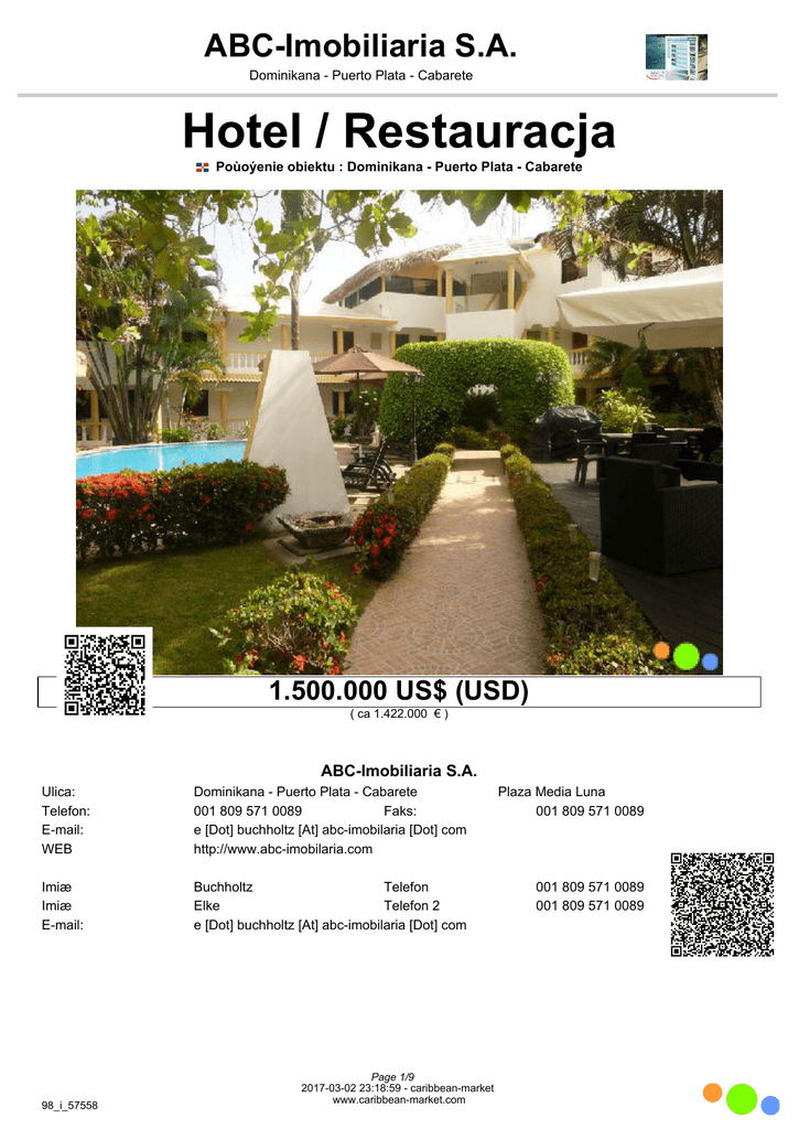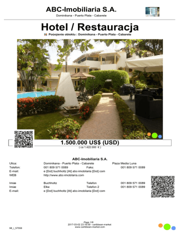ABC-Imobiliaria S.A. Dominikana - Puerto Plata - Cabarete Hotel / Restauracja Poùoýenie obiektu : Dominikana - Puerto Plata - Cabarete 1.500.000 US$ (USD) ( ca 1.422.000 € ) ABC-Imobiliaria S.A. Ulica: Telefon: E-mail: WEB Dominikana - Puerto Plata - Cabarete 001 809 571 0089 Faks: e [Dot] buchholtz [At] abc-imobilaria [Dot] com http://www.abc-imobilaria.com Plaza Media Luna 001 809 571 0089 Imiæ Imiæ E-mail: Buchholtz Telefon Elke Telefon 2 e [Dot] buchholtz [At] abc-imobilaria [Dot] com 001 809 571 0089 001 809 571 0089 98_i_57558 Page 1/9 2017-03-02 23:18:59 - caribbean-market www.caribbean-market.com ABC-Imobiliaria S.A. Dominikana - Puerto Plata - Cabarete Numer kodu Typ budynku Poùoýenie Materiaùy Property Address 98_i_57558 Hotel / Restauracja Seafront Beton Cabarete Numer kodu Nr referencyjny Status objektet Rok po uzgodnieniu potrzebne 1994 Powierzchnia dziaùki Firma Ýycie Kuchnia Sypialnie Zùy Opinie Toaleta 3084 m2 Powierzchnia 518 m2 Dojazd: 30 Protokoùy 10 Protokoùy Biznes Inne Usùugi Garaý Carport zadaszony taras Samochód Pieszo Lotnisko Plaýa Akcesoria Dzierýawa Taras Balkon Jetty Pokój Party Klimatyzacja Resort Ogród Pralnia Goràcy zadaszony taras ogrodzony / murem 98_i_57558 Page 2/9 2017-03-02 23:18:59 - caribbean-market www.caribbean-market.com 1 ABC-Imobiliaria S.A. Dominikana - Puerto Plata - Cabarete 98_i_57558 Page 3/9 2017-03-02 23:18:59 - caribbean-market www.caribbean-market.com ABC-Imobiliaria S.A. Dominikana - Puerto Plata - Cabarete 98_i_57558 Page 4/9 2017-03-02 23:18:59 - caribbean-market www.caribbean-market.com ABC-Imobiliaria S.A. Dominikana - Puerto Plata - Cabarete 98_i_57558 Page 5/9 2017-03-02 23:18:59 - caribbean-market www.caribbean-market.com ABC-Imobiliaria S.A. Dominikana - Puerto Plata - Cabarete 98_i_57558 Page 6/9 2017-03-02 23:18:59 - caribbean-market www.caribbean-market.com ABC-Imobiliaria S.A. Dominikana - Puerto Plata - Cabarete 98_i_57558 Page 7/9 2017-03-02 23:18:59 - caribbean-market www.caribbean-market.com ABC-Imobiliaria S.A. Dominikana - Puerto Plata - Cabarete 98_i_57558 Page 8/9 2017-03-02 23:18:59 - caribbean-market www.caribbean-market.com ABC-Imobiliaria S.A. Dominikana - Puerto Plata - Cabarete 98_i_57558 Page 9/9 2017-03-02 23:18:59 - caribbean-market www.caribbean-market.com