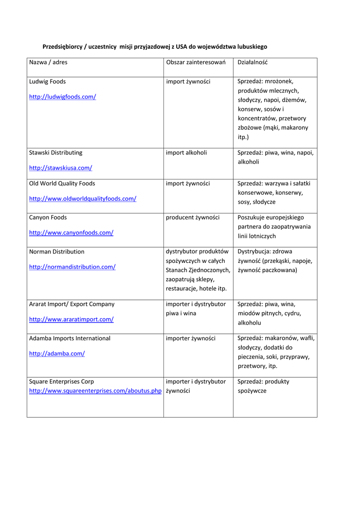 Przedsiębiorcy / uczestnicy misji przyjazdowej z USA do województwa lubuskiego Nazwa / adres Obszar zainteresowań Działalność Ludwig Foods import żywności Sprzedaż: mrożonek, produktów mlecznych, słodyczy, napoi, dżemów, konserw, sosów i koncentratów, przetwory zbożowe (mąki, makarony itp.) import alkoholi Sprzedaż: piwa, wina, napoi, alkoholi import żywności Sprzedaż: warzywa i sałatki konserwowe, konserwy, sosy, słodycze producent żywności Poszukuje europejskiego partnera do zaopatrywania linii lotniczych dystrybutor produktów spożywczych w całych Stanach Zjednoczonych, zaopatrują sklepy, restauracje, hotele itp. Dystrybucja: zdrowa żywność (przekąski, napoje, żywność paczkowana) importer i dystrybutor piwa i wina Sprzedaż: piwa, wina, miodów pitnych, cydru, alkoholu importer żywności http://adamba.com/ Sprzedaż: makaronów, wafli, słodyczy, dodatki do pieczenia, soki, przyprawy, przetwory, itp. Square Enterprises Corp importer i dystrybutor http://www.squareenterprises.com/aboutus.php żywności Sprzedaż: produkty spożywcze http://ludwigfoods.com/ Stawski Distributing http://stawskiusa.com/ Old World Quality Foods http://www.oldworldqualityfoods.com/ Canyon Foods http://www.canyonfoods.com/ Norman Distribution http://normandistribution.com/ Ararat Import/ Export Company http://www.araratimport.com/ Adamba Imports International