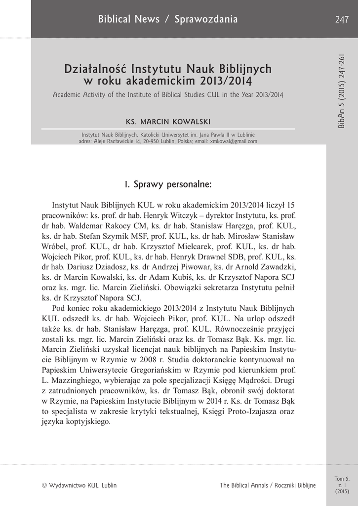 Działalność Instytutu Nauk Biblijnych w roku akademickim 2013/2014 Academic Activity of the Institute of Biblical Studies CUL in the Year 2013/2014 KS. MARCIN KOWALSKI 247 BibAn 5 (2015) 247-261 Biblical News / Sprawozdania Instytut Nauk Biblijnych, Katolicki Uniwersytet im. Jana Pawła II w Lublinie adres: Aleje Racławickie 14, 20-950 Lublin, Polska; email: [email protected] 1. Sprawy personalne: Instytut Nauk Biblijnych KUL w roku akademickim 2013/2014 liczył 15 pracowników: ks. prof. dr hab. Henryk Witczyk – dyrektor Instytutu, ks. prof. dr hab. Waldemar Rakocy CM, ks. dr hab. Stanisław Haręzga, prof. KUL, ks. dr hab. Stefan Szymik MSF, prof. KUL, ks. dr hab. Mirosław Stanisław Wróbel, prof. KUL, dr hab. Krzysztof Mielcarek, prof. KUL, ks. dr hab. Wojciech Pikor, prof. KUL, ks. dr hab. Henryk Drawnel SDB, prof. KUL, ks. dr hab. Dariusz Dziadosz, ks. dr Andrzej Piwowar, ks. dr Arnold Zawadzki, ks. dr Marcin Kowalski, ks. dr Adam Kubiś, ks. dr Krzysztof Napora SCJ oraz ks. mgr. lic. Marcin Zieliński. Obowiązki sekretarza Instytutu pełnił ks. dr Krzysztof Napora SCJ. Pod koniec roku akademickiego 2013/2014 z Instytutu Nauk Biblijnych KUL odszedł ks. dr hab. Wojciech Pikor, prof. KUL. Na urlop odszedł także ks. dr hab. Stanisław Haręzga, prof. KUL. Równocześnie przyjęci zostali ks. mgr. lic. Marcin Zieliński oraz ks. dr Tomasz Bąk. Ks. mgr. lic. Marcin Zieliński uzyskał licencjat nauk biblijnych na Papieskim Instytucie Biblijnym w Rzymie w 2008 r. Studia doktoranckie kontynuował na Papieskim Uniwersytecie Gregoriańskim w Rzymie pod kierunkiem prof. L. Mazzinghiego, wybierając za pole specjalizacji Księgę Mądrości. Drugi z zatrudnionych pracowników, ks. dr Tomasz Bąk, obronił swój doktorat w Rzymie, na Papieskim Instytucie Biblijnym w 2014 r. Ks. dr Tomasz Bąk to specjalista w zakresie krytyki tekstualnej, Księgi Proto-Izajasza oraz języka koptyjskiego. © Wydawnictwo KUL , Lublin The Biblical Annals / Roczniki Biblijne Tom 5, z. 1 (2015) 248 Ks. Marcin Kowalski B i bl i c al New s 2. Wydarzenia naukowe i nominacje 15 lutego 2014 r. ks. dr hab. Henryk Drawnel otrzymał z rąk J. M. Rektora KUL powołanie na stanowisko profesora nadzwyczajnego. 13 czerwca 2014 r. ks. dr Tomasz Bąk obronił na Papieskim Instytucie Biblijnym (Biblicum) w Rzymie pracę doktorską p.t. Il Proto-Isaia in copto-saidico. Edizione critica sulla base di sa 52 (M 568) e di altri testimoni. Praca została napisana pod kierunkiem prof. Philippe’a Luisier, S.J. Doktorat obejmuje krytyczne wydanie tekstu Proto-Izajasza w dialekcie saidyckim języka koptyjskiego opracowane na podstawie manuskryptu sa 52 (według nomenklatury Schüssler’a) lub M 568 (według nazewnictwa Depuydt’a). Manuskrypt należy do kolekcji Pierpont Morgan Library. Praca, oprócz informacji wstępnych na temat samego manuskryptu i opisu pewnych fenomenów pisarskich charakterystycznych dla tego kodeksu, zawiera również tekst koptyjski Iz 1-39 z aparatem krytycznym, opracowanym na podstawie dostępnych manuskryptów saidyckich. Ważnym elementem doktoratu jest również tłumaczenie koptyjskiego Proto-Izajasza na język angielski oraz porównanie każdego wersetu z greckim tekstem Septuaginty. W końcowej części pracy omówione zostają najciekawsze zjawiska językowe, jakie można zauważyć w manuskrypcie, a także ich wpływ na interpretację i odczytanie tekstu greckiego, który służył jako tekst bazowy dla tłumacza koptyjskiego. O potrzebie podjęcia tego tematu pracy może świadczyć sam fakt, iż ponad 35% tekstu Proto-Izajasza w dialekcie saidyckim znajduje się tylko i wyłącznie w opracowanym manuskrypcie. Do tej pory tekst ten nie był nigdzie publikowany. 3. Sympozja naukowe organizowane w Instytucie Nauk Biblijnych KUL 3.1. IX Międzynarodowe Jesienne Dni Biblijne „Głoszenie odpuszczenia grzechów w imię Jezusa (Łk 24,47)”, KUL, Lublin, 16-17 października 2013 r. Plan sympozjum przedstawiał się następująco: Środa, 16 października: Sesja I, poświęcona dorobkowi naukowemu ks. prof. dr hab. Józefa Kudasiewicza (1926-2012), prowadził ks. prof. dr hab. H. Witczyk –– ks. dr hab. Stanisław Haręzga, prof. KUL, „Wizja duszpasterstwa biblijnego w Polsce”. Vol. 5, no. 1 (2015) The Biblical Annals / Roczniki Biblijne 249 –– –– Sesja –– ks. dr hab. Stanisław Dyk, prof. KUL, „Więcej słowa w słowie”. ks. dr hab. Kazimierz Pek MIC, prof. KUL, „Mariologia biblijna”. II, prowadził ks. dr hab. Stefan Szymik MSF, prof. KUL ks. dr hab. Wojciech Pikor, prof. KUL, „Źródła nadziei odpuszczenia grzechów Izraela w Iz 63,7–64,11”. –– ks. dr hab. Mirosław S. Wróbel, prof. KUL, „Koncepcja grzechu i jego odpuszczenia we wspólnocie z Qumran”. Sesja III, prowadził ks. dr hab. Mirosław S. Wróbel, prof. KUL –– dr hab. Teresa Stanek UAM, Poznań, „Motyw darowania winy w Pięcioksięgu”. –– k s. dr Krzysztof Napora, KUL, „Bóg wobec grzechu człowieka w Rdz 1–11”. –– dr Mykhaylyna Kľusková, KU Ružomberok, Słowacja, „Dynamizm Bożego przebaczenia w świetle tekstu Ne 9,6-37”. Sp rawo z d an i a Działalność Instytutu Nauk Biblijnych w roku akademickim 2013/2014 Czwartek, 17 października: Sesja IV, prowadził ks. dr Marcin Kowalski Sesja specjalna: o. Prof. Jean-Noël Aletti, S.J., Pontificio Istituto Biblico, Rzym: –– “The Issue of Faith in the Letters of Saint Paul. The Case of Abraham in Rom 4 and Its Importance”. –– “Non-fede e fede in Lc 1,5-25 . Perché il racconto lucano comincia con la non-fede?”. Sesja V, prowadzi ks. prof. dr hab. W. Rakocy –– ks. dr hab. Artur Malina, prof. UŚ, Katowice, „Język tekstów Starego i Nowego Przymierza o odpuszczeniu grzechów. Co się zmieniło?”. –– ks. dr hab. Jan Klinkowski, prof. PWT, Wrocław, „Wątki liturgiczne święta Jom Kippur w opisach ewangelicznych pasji Jezusa”. Sesja VI, prowadził dr hab. Krzysztof Mielcarek, prof. KUL