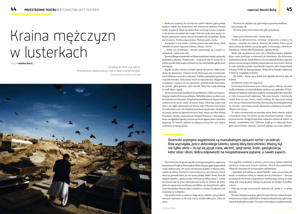 44 45 reportaż Moniki Bułaj PRZESTRZENIE TEATRU / AFGANISTAN JEST TEATREM Burka nie wystarczy, by wyrwać się z jarów Nahrinu, gdzie grasują bandyci. Gdyby nas rozpoznano, moi towarzysze podróży również byliby w opałach. Wrota do dolin Chost wa Firing to teren zasadzek, tu nie dociera ani policja, ani wojsko. Nikt nie wtyka nosa między rabusiów i plemienne zemsty, których początku nikt nie pamięta. Burka nie wystarczy. Trzeba czegoś jeszcze. Postawy, gestu, kroku. Zamknięta w tym worku z nylonu, powtarzam sobie lekcję, jakiej udzieliły mi przed wyjazdem kobiety z Mazar-i-Szarif. – Widać was na kilometr – mówiły, naśmiewając się z innych cudzoziemek – macie inne ciało. I pewnie dlatego wymalowały mi dłonie rysunkami z henny, i pożyczyły pantofelki z plastiku. Wspólniczki – stroją mnie jak na wesele, bo to jedyny sposób, bym mogła wytłumaczyć się z ukrytej lejki, gdyby mnie przyłapano. Reguły są takie: milczeć, pochylić głowę, skrzyżować fałdy burki, skulić się, skamienieć. Ubranie ma być błyszczące, jak u wieśniaczki, psychodeliczne szarawary z cekinami. Torebka z pieniędzmi gotowa na wypadek rabunku. Dokumenty wszyte w tapicerkę auta. Magnetofon w majtkach. I mam za nic nie zapomnieć, że kratka burki służy temu, by ujawnić, gdzie patrzysz, czyli twój lęk. Wszystko, każdy drobiazg to znak, objaw, sygnał. Mamy szczęście, przejeżdżamy bez problemów. Udało nam się prześlizgnąć między dwoma zasadzkami. Muhiddin śmieje się obok mnie. Jest inżynierem z Duszanbe, Tadżykiem przesiedlonym do Mazaru, który zaofiarował mi się na „męża”. Ja jestem Aiszą, Uzbeczką, mamy troje dzieci, ale ciągle zapominam ich imiona. Jako Uzbeczka mam prawo do niebieskich oczu i do kiepskiej znajomości języka dari. Muhiddin się śmieje, śmieje się afgański kierowca Nadi, śmieje się Polak Michał Przedlacki, działacz humanitarny, fotograf-filmowiec i dziennikarz, który zna afgańskie legendy i porusza się wśród Afgańczyków z naturalną elegancją. Tu śmiech i lekkość są najlepszą obroną dla tych, którzy codziennie ryzykują życiem. Kraina mężczyzn w lusterkach Autor: Monika Bułaj „Strzelają do mnie, a ja, wariat, chronię twarz szklaną tarczą. I idę w świat z tą tarczą tylko” Chuszhal Chan Chattak, XVII wiek – Wreszcie nie potykam się, gdy wstaję na poranną modlitwę. Inny, śmiejąc się: – Wreszcie widzę twarz mojej żony, gdy się kochamy. – Tutaj życie to kwestia stylu – nieraz słyszę. Trzeba się dostosowywać, zmieniać zachowanie z miejsca na miejsce – wszystko jest teatrem. Również dla talibów, którzy przed wkroczeniem do Kabulu muszą się ogolić. A wyruszając z Kabulu do Kandaharu, Ghazni albo Dżalalabadu, zapuścić brodę. Broda staje się glejtem na życie, jak u Musaffara Sadata, Tadżyka, który często podróżuje w interesach do Kandaharu. Źle farbowana, poplamione policzki. Broda fałszywa, bo nie należy do kultury tego, kto ją nosi i nie narzucają jej talibskie rozporządzenia, lecz strach. Chociaż to i tak wychodzi na jedno. Są też brody z importu, jak te hiszpańskich żołnierzy NATO do akcji specjalnych. Widzę ich na lotnisku wojskowym w Heracie, wyglądają na zbójów. – Zła broda – śmieje się w kułak mój afgański kierowca, gdy ich mijamy. Na kilometr można ich rozpoznać. Scenicznymi kostiumami są też nakrycia głowy. Mówią, czy jesteś mułłą, studentem czy rzemieślnikiem, z północy czy z południa. W Kandaharze nie będziesz nosił nakrycia głowy zwanego pakol albo masudka, w stylu renesansowych studentów. Tak samo koszula. I krój brody, i kolor farby na niej, i brwi, i nawet makijaż. Bo mężczyźni malują oczy. Noszą w kieszeniach lusterka z bezwstydną hinduską pięknością na wieczku. I pocierają powieki kamieniem podobnym do grafitu. Mimesis jest życiem. To wojna wyrafinowała ten teatralny talent. Biada obnosić otyłość i wyszukane stroje, bo można się stać smacznym kąskiem, a biznes porwań kwitnie. Hodga Enojat słono zapłacił za słabość do haftów na koszuli i smakołyków żony. Talibowie wzięli go za właściciela firmy, gdzie pracował jako robotnik, i porwali, żądając 240 tysięcy dolarów. teatr • 2/2016 fot. Monika Bułaj Dzienniki szpiegów wypełnione są maniakalnymi opisami tortur i przebrań. Rola wymagała, prócz aktorskiego talentu, sporej dozy bezczelności. Ważny był nie tylko ubiór – liczył się język ciała, akcent, spojrzenie, kroki, gestykulacja, kolor stóp i dłoni, dobra odpowiedź na niespodziewane pytanie, a nawet zapach. Moi towarzysze drogi pracują dla czeskiej pozarządowej organizacji humanitarnej People in Need i jadą do doliny Szaszan, gdzie doprowadzili wodę i elektryczność. (W murze ich skromnej siedziby w Mazarze zobaczyłam raz dziurę. Wychodzi z niej na ulicę kran, przy którym o świcie zbiera się gromada dzieci: już nie muszą chodzić daleko. Proste: kran dla ubogich sąsiadów, „sprawa smaku, w którym są włókna duszy”). A teraz przemieszczają się przez niebezpieczne tereny, by dotrzeć do dolin, gdzie nie wpuszczono ani Rosjan, ani talibów, ani Amerykanów, i gdzie nawet komendant Masud, który schodził tu z Doliny Pandższeru, był uznawany za rozbójnika. Gdy przybywamy na miejsce i mogę się już odsłonić, pytam dwóch starszych mężczyzn, co dla nich znaczy światło elektryczne. Jeden mi mówi: teatr • 2/2016 Dwa tygodnie zamknięty w piwnicy, przez szparę widział codzienne egzekucje i kaleczenie innych więźniów. Dwóch dwunastoletnich chłopców zmuszano do ścinania głów zakładnikom. – Spotykam tych talibów na ulicach Kabulu – mówi mi czerwony jak burak i w siódmym niebie, bo właśnie wrócił z hammanu. – Nocami przybijają do drzwi listy z pogróżkami, wydzwaniają, mówią, że mnie zabiją, jeśli wrócę do pracy. Dziś po raz pierwszy od miesiąca wyszedłem z domu. 