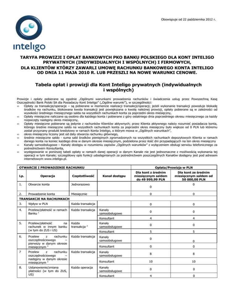 Obowiązuje od 22 października 2012 r. TARYFA PROWIZJI I OPŁAT BANKOWYCH PKO BANKU POLSKIEGO DLA KONT INTELIGO PRYWATNYCH (INDYWIDUALNYCH I WSPÓLNYCH) I FIRMOWYCH, DLA KLIENTÓW KTÓRZY ZAWARLI UMOWĘ RACHUNKU BANKOWEGO KONTA INTELIGO OD DNIA 11 MAJA 2010 R. LUB PRZESZLI NA NOWE WARUNKI CENOWE. Tabela opłat i prowizji dla Kont Inteligo prywatnych (indywidualnych i wspólnych) Prowizje i opłaty pobierane są zgodnie „Ogólnymi warunkami prowadzenia rachunków i świadczenia usług przez Powszechną Kasę Oszczędności Bank Polski SA dla Posiadaczy Kont Inteligo” („Ogólne warunki”), w szczególności: • Opłaty za transakcje/operacje – są pobierane w momencie realizacji transakcji/operacji; jeżeli wykonanie transakcji powoduje blokadę środków na rachunku, blokowana kwota transakcji jest powiększana o kwotę należnej prowizji, opłaty pobierane są w zależności od wysokości średniego miesięcznego salda na wszystkich rachunkach konta za poprzedni okres miesięczny, • Opłaty miesięczne naliczane są osobno dla każdego konta i pobierane z góry ostatniego dnia poprzedniego okresu miesięcznego za każdy rozpoczęty następny okres miesięczny, • Opłaty miesięczne pobierane są jedynie z rachunków Klientów aktywnych; przez Klienta aktywnego należy rozumieć posiadacza konta, którego średnie miesięczne saldo na wszystkich rachunkach konta za poprzedni okres miesięczny było większe od 0 PLN lub któremu został przyznany produkt kredytowy w ramach Konta Inteligo, o którym mowa w „Ogólnych warunkach”, • okres miesięczny liczony jest od daty otwarcia rachunku głównego, • średnie miesięczne saldo - suma sald środków pieniężnych zgromadzonych na wszystkich rachunkach depozytowych Klienta w ramach danego konta na koniec każdego dnia w danym okresie miesięcznym, podzielona przez ilość dni przypadających na ten okres miesięczny • Kanały samoobsługowe – Kanały dostępu w rozumieniu zapisów „Ogólnych warunków” z wyłączeniem obsługi serwisu telefonicznego za pośrednictwem Konsultanta, • występowanie w poniższej tabeli opłaty w ramach danej operacji w danym Kanale nie jest jednoznaczne z możliwością wykonania tej operacji w tym Kanale; szczegółowy opis funkcji udostępnianych za pośrednictwem poszczególnych Kanałów dostępny jest pod adresem internetowym www.inteligo.pl. OTWARCIE I PROWADZENIE RACHUNKU Lp. Operacja Opłata/Prowizja w PLN Częstotliwość Kanał dostępu Dla kont z średnim miesięcznym saldem do 49 999,99 PLN Dla kont ze średnim miesięcznym saldem od 50 000,00 PLN 1. Otwarcie konta Jednorazowo 2. Prowadzenie konta Miesięcznie 0 0 0 0 Kanały samoobsługowe 0 0 Konsultant 4 4 Kanały samoobsługowe 0 0 Konsultant 5 5 Kanały samoobsługowe 0 Konsultant 0 0 Kanały samoobsługowe 8 8 Konsultant 10 10 Kanały samoobsługowe 0 0 Konsultant 4 0 0 0 TRANSAKCJE NA RACHUNKACH 3. Wpływ w PLN Każda transakcja 4. Przelew/płatność w ramach Banku 1 Każda transakcja 5. Przelew/płatność na rachunek w innym banku (w tym do ZUS i US) Każda transakcja Przelew z rachunku oszczędnościowego – pierwszy w danym okresie miesięcznym 3 Każda transakcja Przelew z rachunku oszczędnościowego – następny w danym okresie miesięcznym 3 Każda transakcja Ustanowienie/zmiana płatności (w tym do ZUS, US) Każda operacja 6. 7 8. 2 0 9. Ustanowienie/zmiana zlecenia stałego Każda operacja 10. Realizacja stałego zlecenia na rachunek w ramach Banku (automatycznie) Każda transakcja Realizacja stałego zlecenia na rachunek w innym banku (automatycznie) Każda transakcja Przelew na zakup jednostek uczestnictwa w funduszach PKO TFI SA Każda transakcja 11. 12. Kanały samoobsługowe 0 0 Konsultant 4 0 0 0 0 0 0 0 1 W przypadku przelewów w ramach Kont Inteligo opłata dotyczy w szczególności przelewu standardowego, QuickMoney, SMSMoney, EmailMoney, CardMoney z zastrzeżeniem pkt 6 i 7. 2 W przypadku płatności lub przelewu do ZUS, transakcja to jednorazowy przelew na określony rachunek ZUS. 3 Okres miesięczny w rozumieniu zapisów pkt 4 wstępu PRZELEWY ZAGRANICZNE 4 Opłata/Prowizja w PLN Lp. Operacja Częstotliwość 13. Wpływ na rachunek w ramach Konta Inteligo z tytułu przelewu zagranicznego SEPA 5 Każda transakcja Wpływ na rachunek w ramach Konta Inteligo z tytułu przelewu zagranicznego innego niż przelew zagraniczny SEPA Każda transakcja Realizacja zagranicznego trybie zwykłym przelewu SEPA w Każda transakcja 14. 15. przelewu SEPA w Każda transakcja 17. Realizacja przelewu zagranicznego, w tym przelewu zagranicznego w walucie EUR do kraju EOG, innego niż przelew zagraniczny SEPA w trybie zwykłym 6 Każda transakcja Realizacja przelewu zagranicznego, w tym przelewu zagranicznego w walucie EUR do kraju EOG, innego niż przelew zagraniczny SEPA w trybie pilnym7 Każda transakcja 20. 21. Dla kont ze średnim miesięcznym saldem od 50 000,00 PLN 5 5 11 Kanały samoobsługowe 8 8 Konsultant 8 8 Kanały samoobsługowe 20 20 Konsultant 20 20 Kanały samoobsługowe 50 50 Konsultant 50 50 Kanały samoobsługowe 90 90 Konsultant 90 90 80 80 100 100 50 50 6 Realizacja zagranicznego trybie pilnym 7 19. Dla kont z średnim miesięcznym saldem do 49 999,99 PLN 11 16. 18. Kanał dostępu Opłata zryczałtowana z tytułu kosztów banków trzecich 8 Anulowanie zrealizowanego przelewu zagranicznego Każda transakcja 9 10 Inne dyspozycje dotyczące przelewu zagranicznego 10 Każda transakcja 4 Przelew zagraniczny – dewizowe polecenie wypłaty realizowane w ramach obrotu dewizowego z zagranicą lub obrotu wartościami dewizowymi w kraju. 5 Przelew zagraniczny SEPA – przelew zagraniczny w walucie Euro w ramach obszaru SEPA. 6 Tryb zwykły - realizacja przelewu zagranicznego: 1) SEPA z datą waluty „tomnext” 2) innego niż przelew zagraniczny SPEA z datą waluty „spot” lub przelewu zagranicznego w walucie EUR do kraju EOG z datą waluty „tomnext”. 7 Tryb pilny - realizacja przelewu za
