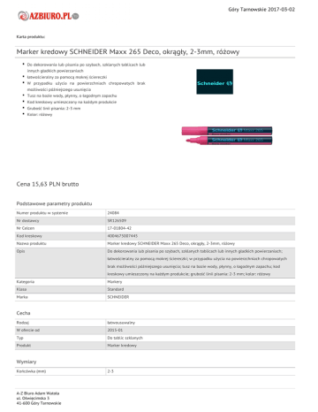 Góry Tarnowskie 2017-03-02 Karta produktu: Marker kredowy SCHNEIDER Maxx 265 Deco, okrągły, 2-3mm, różowy Do dekorowania lub pisania po szybach, szklanych tablicach lub innych gładkich powierzaniach łatwościeralny za pomocą mokrej ściereczki W przypadku użycia na powierzchniach chropowatych brak możliwości późniejszego usunięcia Tusz na bazie wody, płynny, o łagodnym zapachu Kod kreskowy umieszczony na każdym produkcie Grubość linii pisania: 2-3 mm Kolor: różowy Cena 15,63 PLN brutto Podstawowe parametry produktu Numer produktu w systemie 24084 Nr dostawcy SR126509 Nr Celcen 17-01804-42 Kod kreskowy 4004675007445 Nazwa produktu Marker kredowy SCHNEIDER Maxx 265 Deco, okrągły, 2-3mm, różowy Opis Do dekorowania lub pisania po szybach, szklanych tablicach lub innych gładkich powierzaniach; łatwościeralny za pomocą mokrej ściereczki; w przypadku użycia na powierzchniach chropowatych brak możliwości późniejszego usunięcia; tusz na bazie wody, płynny, o łagodnym zapachu; kod kreskowy umieszczony na każdym produkcie; grubość linii pisania: 2-3 mm; kolor: różowy Kategoria Markery Klasa Standard Marka SCHNEIDER Cecha Rodzaj łatwousuwalny W ofercie od 2015-01 Typ Do tablic szklanych Produkt Marker kredowy Wymiary Końcówka (mm) A-Z Biuro Adam Watoła ul. Oświęcimska 3 41-600 Góry Tarnowskie 2-3 Góry Tarnowskie 2017-03-02 Karta katalogowa produktu cd. Marker kredowy SCHNEIDER Maxx 265 Deco, okrągły, 2-3mm, różowy Grubość linii (mm) 2-3 Wspólny słownik zamówień CPV 30192125-3 Pisaki Certyfikaty Nowy produkt w ofercie Standard Hit Standard Kolor Kolor Serdecznie zapraszamy do współpracy A-Z Biuro Adam Watoła zespół. A-Z Biuro Adam Watoła ul. Oświęcimska 3 41-600 Góry Tarnowskie Różowy