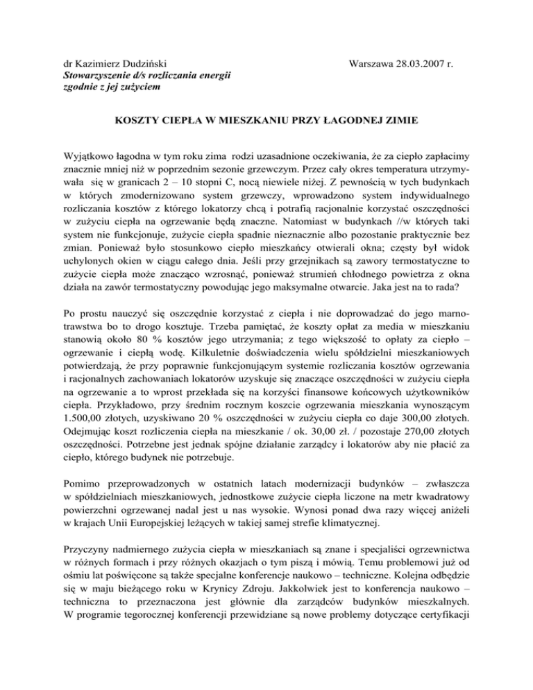 dr Kazimierz Dudziński Stowarzyszenie d/s rozliczania energii zgodnie z jej zużyciem Warszawa 28.03.2007 r. KOSZTY CIEPŁA W MIESZKANIU PRZY ŁAGODNEJ ZIMIE Wyjątkowo łagodna w tym roku zima rodzi uzasadnione oczekiwania, że za ciepło zapłacimy znacznie mniej niż w poprzednim sezonie grzewczym. Przez cały okres temperatura utrzymywała się w granicach 2 – 10 stopni C, nocą niewiele niżej. Z pewnością w tych budynkach w których zmodernizowano system grzewczy, wprowadzono system indywidualnego rozliczania kosztów z którego lokatorzy chcą i potrafią racjonalnie korzystać oszczędności w zużyciu ciepła na ogrzewanie będą znaczne. Natomiast w budynkach //w których taki system nie funkcjonuje, zużycie ciepła spadnie nieznacznie albo pozostanie praktycznie bez zmian. Ponieważ było stosunkowo ciepło mieszkańcy otwierali okna; częsty był widok uchylonych okien w ciągu całego dnia. Jeśli przy grzejnikach są zawory termostatyczne to zużycie ciepła może znacząco wzrosnąć, ponieważ strumień chłodnego powietrza z okna działa na zawór termostatyczny powodując jego maksymalne otwarcie. Jaka jest na to rada? Po prostu nauczyć się oszczędnie korzystać z ciepła i nie doprowadzać do jego marnotrawstwa bo to drogo kosztuje. Trzeba pamiętać, że koszty opłat za media w mieszkaniu stanowią około 80 % kosztów jego utrzymania; z tego większość to opłaty za ciepło – ogrzewanie i ciepłą wodę. Kilkuletnie doświadczenia wielu spółdzielni mieszkaniowych potwierdzają, że przy poprawnie funkcjonującym systemie rozliczania kosztów ogrzewania i racjonalnych zachowaniach lokatorów uzyskuje się znaczące oszczędności w zużyciu ciepła na ogrzewanie a to wprost przekłada się na korzyści finansowe końcowych użytkowników ciepła. Przykładowo, przy średnim rocznym koszcie ogrzewania mieszkania wynoszącym 1.500,00 złotych, uzyskiwano 20 % oszczędności w zużyciu ciepła co daje 300,00 złotych. Odejmując koszt rozliczenia ciepła na mieszkanie / ok. 30,00 zł. / pozostaje 270,00 złotych oszczędności. Potrzebne jest jednak spójne działanie zarządcy i lokatorów aby nie płacić za ciepło, którego budynek nie potrzebuje. Pomimo przeprowadzonych w ostatnich latach modernizacji budynków – zwłaszcza w spółdzielniach mieszkaniowych, jednostkowe zużycie ciepła liczone na metr kwadratowy powierzchni ogrzewanej nadal jest u nas wysokie. Wynosi ponad dwa razy więcej aniżeli w krajach Unii Europejskiej leżących w takiej samej strefie klimatycznej. Przyczyny nadmiernego zużycia ciepła w mieszkaniach są znane i specjaliści ogrzewnictwa w różnych formach i przy różnych okazjach o tym piszą i mówią. Temu problemowi już od ośmiu lat poświęcone są także specjalne konferencje naukowo – techniczne. Kolejna odbędzie się w maju bieżącego roku w Krynicy Zdroju. Jakkolwiek jest to konferencja naukowo – techniczna to przeznaczona jest głównie dla zarządców budynków mieszkalnych. W programie tegorocznej konferencji przewidziane są nowe problemy dotyczące certyfikacji energetycznej budynku ale także ciągle aktualne i ważne dla zarządców budynków sprawy racjonalnego gospodarowania ciepłem a zwłaszcza indywidualnego rozliczania kosztów ogrzewania. Jako przyczyny nadmiernego zużycia ciepła specjaliści wymieniają: - - nadmierne straty ciepła przez „skorupę budynku”, stare okna, brak właściwej regulacji hydraulicznej instalacji, nie zapewniającej odpowiedniej dystrybucji ciepła, często także zarośniętej osadami ponieważ woda instalacyjna nie odpowiada normie, brak systemu indywidualnego rozliczania kosztów ciepła, który motywowałby lokatorów do racjonalnych zachowań i tym samym do oszczędzania ciepła. Wiadomo powszechnie, że budynek posiadający właściwa izolację termiczną, wyposażony w sprawną instalację grzewczą oraz system indywidualnego rozliczania kosztów ciepła stwarza warunki do racjonalizacji jego zużycia i w konsekwencji do uzyskiwania oszczędności przez lokatora. Przy ograniczonych środkach finansowych podstawą jest modernizacja węzła cieplnego i instalacji centralnego ogrzewania a następnie wprowadzenie indywidualnego rozliczania kosztów ciepła. Przy takim podejściu do problemu stwarza się warunki do zmniejszenia zużycia ciepła w budynku. Kolejnym a zarazem koniecznym krokiem powinno być zmniejszenie mocy zamówionej u dostawcy ciepła na podstawie nowych obliczeń dotyczących zapotrzebowania na ciepło w budynku. Aby to zrobić fachowo należy opracowanie projektu powierzyć specjaliście. Baza danych o budynku i jego instalacjach będzie niezbędna dla wielu różnych sytuacji – na przykład do zadań związanych z certyfikacją budynków. Na brak oczekiwanych powszechnie rezultatów w gospodarowaniu ciepłem w budynkach wielolokalowych wpływ mają nie tylko czynniki techniczne i technologiczne funkcjonowania systemu grzewczego. Wiele także zależy od konkretnych podmiotów funkcjonujących w obszarze: dostawca ciepła – zarządca budynku – lokator jako końcowy odbiorca. Komu tak właściwie zależy na oszczędzaniu ciepła w budynku i sprowadzeniu jego zużycia do rzeczywistej potrzeby? DOSTAWCA CIEPŁA - chce sprzedać jak najwięcej ciepła po możliwie najwyższej cenie; zapewnił to sobie w strukturze taryfy ciepła; niechętnie godzi się na zmniejszenie mocy zamówionej – i przepisy mu to ułatwiają, - nie jest zainteresowany termomodernizacją i zmniejszeniem zużycia ciepła; ponieważ mamy łagodną zimę, to nie uzyska on zaplanowanych dochodów; niedługo więc możemy się spodziewać zmiany / podwyżki / taryfy na ciepło . ZARZĄDCA BUDYNKU - chce rozliczać koszty tak, żeby nie mieć kłopotów z lokatorami, - chętnie godzi się na rozliczanie ciepła według powierzchni chociaż powinien wiedzieć, że sposób ten można stosować tylko wówczas kiedy zastosowanie - indywidualnego rozliczania według zuż
