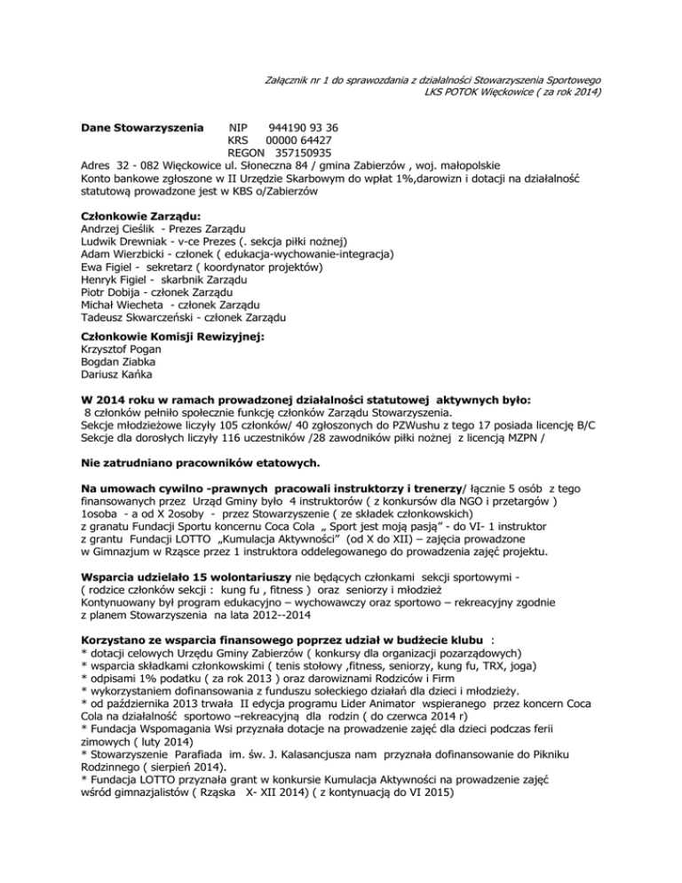Załącznik nr 1 do sprawozdania z działalności Stowarzyszenia Sportowego LKS POTOK Więckowice ( za rok 2014) Dane Stowarzyszenia NIP 944190 93 36 KRS 00000 64427 REGON 357150935 Adres 32 - 082 Więckowice ul. Słoneczna 84 / gmina Zabierzów , woj. małopolskie Konto bankowe zgłoszone w II Urzędzie Skarbowym do wpłat 1%,darowizn i dotacji na działalność statutową prowadzone jest w KBS o/Zabierzów Członkowie Zarządu: Andrzej Cieślik - Prezes Zarządu Ludwik Drewniak - v-ce Prezes (. sekcja piłki nożnej) Adam Wierzbicki - członek ( edukacja-wychowanie-integracja) Ewa Figiel - sekretarz ( koordynator projektów) Henryk Figiel - skarbnik Zarządu Piotr Dobija - członek Zarządu Michał Wiecheta - członek Zarządu Tadeusz Skwarczeński - członek Zarządu Członkowie Komisji Rewizyjnej: Krzysztof Pogan Bogdan Ziabka Dariusz Kańka W 2014 roku w ramach prowadzonej działalności statutowej aktywnych było: 8 członków pełniło społecznie funkcję członków Zarządu Stowarzyszenia. Sekcje młodzieżowe liczyły 105 członków/ 40 zgłoszonych do PZWushu z tego 17 posiada licencję B/C Sekcje dla dorosłych liczyły 116 uczestników /28 zawodników piłki nożnej z licencją MZPN / Nie zatrudniano pracowników etatowych. Na umowach cywilno -prawnych pracowali instruktorzy i trenerzy/ łącznie 5 osób z tego finansowanych przez Urząd Gminy było 4 instruktorów ( z konkursów dla NGO i przetargów ) 1osoba - a od X 2osoby - przez Stowarzyszenie ( ze składek członkowskich) z granatu Fundacji Sportu koncernu Coca Cola „ Sport jest moją pasją” - do VI- 1 instruktor z grantu Fundacji LOTTO „Kumulacja Aktywności” (od X do XII) – zajęcia prowadzone w Gimnazjum w Rząsce przez 1 instruktora oddelegowanego do prowadzenia zajęć projektu. Wsparcia udzielało 15 wolontariuszy nie będących członkami sekcji sportowymi ( rodzice członków sekcji : kung fu , fitness ) oraz seniorzy i młodzież Kontynuowany był program edukacyjno – wychowawczy oraz sportowo – rekreacyjny zgodnie z planem Stowarzyszenia na lata 2012--2014 Korzystano ze wsparcia finansowego poprzez udział w budżecie klubu : * dotacji celowych Urzędu Gminy Zabierzów ( konkursy dla organizacji pozarządowych) * wsparcia składkami członkowskimi ( tenis stołowy ,fitness, seniorzy, kung fu, TRX, joga) * odpisami 1% podatku ( za rok 2013 ) oraz darowiznami Rodziców i Firm * wykorzystaniem dofinansowania z funduszu sołeckiego działań dla dzieci i młodzieży. * od października 2013 trwała II edycja programu Lider Animator wspieranego przez koncern Coca Cola na działalność sportowo –rekreacyjną dla rodzin ( do czerwca 2014 r) * Fundacja Wspomagania Wsi przyznała dotacje na prowadzenie zajęć dla dzieci podczas ferii zimowych ( luty 2014) * Stowarzyszenie Parafiada im. św. J. Kalasancjusza nam przyznała dofinansowanie do Pikniku Rodzinnego ( sierpień 2014). * Fundacja LOTTO przyznała grant w konkursie Kumulacja Aktywności na prowadzenie zajęć wśród gimnazjalistów ( Rząska X- XII 2014) ( z kontynuacją do VI 2015) -1SPRAWOZDANIE Z DZIAŁALNOSCI W 2014 roku W ramach działalności Stowarzyszenia aktywne były sekcje sportowo –rekreacyjne: z ich działalnością można zapoznać się na stronie internetowej www wieckowice.org w zakładkach poszczególnych sekcji piłka nożna – seniorzy Zawodnicy brali udział w rozgrywkach grupy B okręgu krakowskiego, w zawodach Pucharu Polski, Piłkarskim Turnieju o Puchar Starosty Powiatu Krakowskiego, Pucharze Wójta Gminy Zabierzów oraz w turniejach i rozgrywkach towarzyskich z klubami innych powiatów i gmin Nastąpiła zmiana na stanowisku trenera i częściowo zmieniono skład drużyny. Rozegrano w rundzie wiosennej 14 meczy oraz w rundzie jesiennej 11 meczy. Rok 2014 sekcja pod kierunkiem trenera Pawła Frankowskiego zakończyła na 5 miejscu w tabeli rozgrywek grupy B okręgu krakowskiego. Zawodnicy trenowali 2 x w tygodniu na obiektach piłkarskich w Więckowicach a w okresie zimowym treningi odbywały się w sali ośrodka sportowego w Zabierzowie lub na ORLIKACH- w Szczyglicach a ostatnio w Zabierzowie .Sekcja i zawodnicy posiadają licencje Małopolskiego Związku Piłki Nożnej a 2 przedstawicieli POTOKU zasiada w Zarządzie Podokręgu Kraków Kung fu Łącznie sekcja liczy ponad 87 dzieci i młodzieży oraz grupę 20 dorosłych na zajęciach sensoryczno – motorycznych i sandy ( elementy siłowe i walki) 16 dzieci posiada licencję zawodnika 8 Ji upoważniającą do udziału w zawodach rangi krajowej i międzynarodowej .Instruktorzy podnosili swoje kwalifikacje zdając odpowiednio egzaminy zakończone uzyskaniem uprawnień 1x trenera klasy II,1x instruktora sportu wushu a 2 osoby sędziego punkowego kl. III Podczas wakacji 20 osób było na 7 dniowym na obozie treningowym w Zakrzowie, zorganizowano obóz zimowy połączony z nauką jazdy na nartach. Zakupiono dodatkowy sprzęt z funduszy pozyskanych z Urzędu Gminy Zabierzów oraz grantu Fundacji Sportu Koncernu Coca Cola Sekcja kung fu i zawodnicy pozyskali od 01.2014 licencję klubową w Polskim Związku Wushu W XX Mistrzostwach Polski 10 reprezentantów zdobyło w sumie 10 medali, a w Pucharze Polski reprezentacja zdobyła 21 medali./ wykaz na stronie sekcji kung fu Nagrodę Sportową Wójta Gminy Zabierzów otrzymało 13 zawodników, a 2 otrzymało nagrodę Starosty Powiatu Krakowskiego za osiągnięcia z 2013 roku i promocję sportu. Wyróżnienie i list gratulacyjny otrzymał od Starosty Krakowskiego trener p. Michał Nogieć. prowadzący zajęcia w POTOKu od 6 lat Zajęcia dla dzieci wzbogacono dodatkowo spotkaniem z członkami grupy rekonstrukcyjnej z Gwiezdnych Wojen, terapią dzwiękiem za pomocą mis tybetańskich , młodzież miała okazję zapoznać się z zajęciami jogi i poznawała zasady udzielania pomocy przedmedycznej. Tenis stołowy posiadany sprzęt, wielkość sali - umożliwia równoczesny trening max.12 uczestnikom. Łącznie trenuje w sekcji 14 