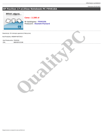 Informacje o produkcie Utworzono 02-03-2017 HP Pavilion 17-e135sw Notebook PC F9V61EA Cena : 2.280 zł Nr katalogowy : F9V61EA Producent : Hewlett-Packard Gwarancja: 24 miesiące gwarancji fabrycznej Kod Producenta: F9V61EA 888182515198 Q ua lit yP P/N:: C Kod Produktu: MOBHP-NOT1913 Wygenerowano w programie www.oscGold.com