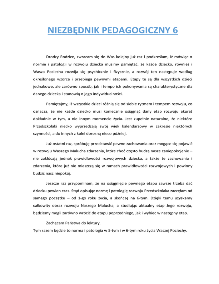 NIEZBĘDNIK PEDAGOGICZNY 6 Drodzy Rodzice, zwracam się do Was kolejny już raz i podkreślam, iż mówiąc o normie i patologii w rozwoju dziecka musimy pamiętać, że każde dziecko, również i Wasza Pociecha rozwija się psychicznie i fizycznie, a rozwój ten następuje według określonego wzorca i przebiega pewnymi etapami. Etapy te są dla wszystkich dzieci jednakowe, ale zarówno sposób, jak i tempo ich pokonywania są charakterystyczne dla danego dziecka i stanowią o jego indywidualności. Pamiętajmy, iż wszystkie dzieci różnią się od siebie rytmem i tempem rozwoju, co oznacza, że nie każde dziecko musi koniecznie osiągnąć dany etap rozwoju akurat dokładnie w tym, a nie innym momencie życia. Jest zupełnie naturalne, że niektóre Przedszkolaki niecko wyprzedzają swój wiek kalendarzowy w zakresie niektórych czynności, a do innych z kolei dorosną nieco później. Już ostatni raz, spróbuję przedstawić pewne zachowania oraz mogące się pojawić w rozwoju Waszego Malucha zdarzenia, które choć często budzą nasze zaniepokojenie – nie zakłócają jednak prawidłowości rozwojowych dziecka, a także te zachowania i zdarzenia, które już nie mieszczą się w ramach prawidłowości rozwojowych i powinny budzić nasz niepokój. Jeszcze raz przypominam, że na osiągnięcie pewnego etapu zawsze trzeba dać dziecku pewien czas. Stąd opisując normę i patologię rozwoju Przedszkolaka zaczęłam od samego początku – od 1-go roku życia, a skończę na 6-tym. Dzięki temu uzyskamy całkowity obraz rozwoju Naszego Malucha, a studiując aktualny etap Jego rozwoju, będziemy mogli zarówno wrócić do etapu poprzedniego, jak i wybiec w następny etap. Zachęcam Państwa do lektury. Tym razem będzie to norma i patologia w 5-tym i w 6-tym roku życia Waszej Pociechy. NORMY ROZWOJOWE ZASYPIANIE I SEN 5 ROK ŻYCIA Chociaż z zasypianiem Pięciolatek nie ma już większych kłopotów, jednak w ciągu nocy niemal nagminnie zdarzają się lęki nocne – wiąże się to z burzliwym rozwojem wyobraźni i intelektu w tym wieku. 6 ROK ŻYCIA Sześciolatki zazwyczaj zasypiają i śpią dobrze, chociaż mogą jeszcze pojawiać się lęki nocne. SPOŻYWANIE POSIŁKÓW 5 ROK ŻYCIA U Pięciolatków poprawia się apetyt, zwiększa się także zakres Ich wymagań kulinarnych. Bardzo chętnie próbują zwłaszcza te produkty, które są przedmiotem reklam telewizyjnych. Coraz lepiej radzą sobie z używaniem sztućców i spożywaniem posiłków przy wspólnym stole. 6 ROK ŻYCIA Sześciolatki są nieprzewidywalne – jednego dnia mają wspaniały apetyt, następnego natomiast są rozgrymaszonymi niejadkami. Przy stole zachowują się okropnie – mówią z pełną buzią, bujają się na krześle, kręcą się, rozlewają napoje, nie są w stanie spokojnie usiedzieć w miejscu. Bardzo często przepadają za słodyczami, pojawia się u Nich również ochota na potrawy ostre bądź pikantne. WYDALANIE 5 ROK ŻYCIA Pięciolatki wykazują zupełną samowystarczalność w załatwianiu potrzeb fizjologicznych. Bardzo często pochłonięte zabawą biegną do toalety w ostatniej chwili, może się czasami zdarzyć, że nie zdąż. Noce natomiast są w większości suche. 6 ROK ŻYCIA W szóstym roku życia w wyjątkowych sytuacjach ( po bardzo ekscytujących przeżyciach, przy dużym zmęczeniu, a także w chłodne noce, kiedy dziecko zmarznie) mogą zdarzyć się „wpadki wydalnicze”, ale dziecko jest wówczas wyraźnie zażenowane. W pewnych przypadkach pod koniec szóstego roku życia powraca moczenie się dziecka w dzień – może być to pewnego rodzaju protest przeciwko kończącym się przywilejom wczesnego dzieciństwa i perspektywą szkolnych obowiązków. UCZUCIA I EMOCJE 5 ROK ŻYCIA Jest to okres spokoju i chwilowej stabilizacji uczuciowej dziecka. Stąd oczywiście mniej objawów napięcia psychicznego oraz mniej sposobów służących jego rozładowaniu, zwykle bywa to jedno specyficzne dla danego dziecka zachowanie, np. obgryzanie paznokci. Jednak w ciągu nocy nagminnie występują lęki nocne. Pięciolatek może się z krzykiem zerwać ze snu i bać się zasnąć ponownie we własnym łóżku, a nawet we własnym pokoju. 6 ROK ŻYCIA Jest to okres silnych napięć i niezliczonych konfliktów, toteż repertuar sposobów ich rozładowania ponownie rośnie. U niektórych dzieci powracają napady wściekłości, a u Tych, które ssą palce, nawyk ten się intensyfikuje, przed wyjściem do przedszkola czy „zerówki” mogą wystąpić bóle brzucha, nudności, wymioty, a także częste oddawanie moczu. Sześciolatki podenerwowanych. z reguły sprawiają wrażenie ogólnie zaniepokojonych, RELACJE Z RODZICAMI 5 ROK ŻYCIA Dla Pięciolatka rodzice są najwspanialszymi istotami, stąd ich polecenia wykonują z największą starannością i podporządkowuje się ich wymaganiom. 6 ROK ŻYCIA Jest to okres niestałości, skrajnej chwiejności, rywalizacji, nieposłuszeństwa w stosunku z rodzicami. Sześciolatek potrafi z prowokująca bezczelnością odmówić wykonania polecenia oświadczając – „no i co mi zrobisz?”. Takie zachowanie, to tylko wyładowanie swoich gwałtownych emocji na tym kogo ma pod ręką i kto Mu nie zagraża. LĘKI, STRACHY, NIEPOKOJE 5 ROK ŻYCIA Strachy Pięciolatków są bardziej realistyczne i konkretne. Pięciolatki boją się: „złych ludzi”(np. : agresywnie zachowujących się , pijanych), ugryzień, kopnięć, wszelkich krzywd, których mogą doznać ze strony zwierząt, ale także (w związku z tym, że stają się bardziej ostrożne i przewidujące) bólu i cierpienia związanego z potłuczeniem bądź zranieniem. Może się jeszcze utrzymywać lęk przed ciemnością. 6 ROK ŻYCIA Coraz lepiej rozwinięta i rozbudowana wyobraźnia sprawia, że jest to okres powrotu w krainę strachów. Powracają leki przed odgłosami zza ścian, hałasem windy, szumem w rurach, brzęczeniem komara. Pojawia się strach przed burzą, wodą, ogn