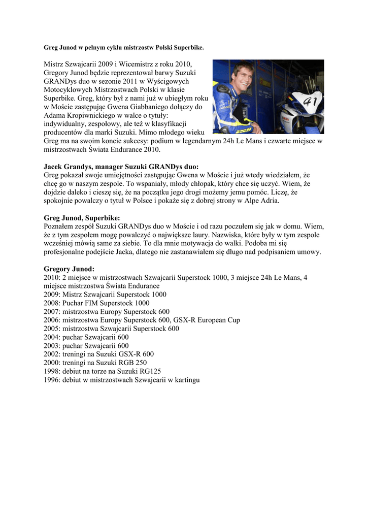 Greg Junod w pełnym cyklu mistrzostw Polski Superbike. Mistrz Szwajcarii 2009 i Wicemistrz z roku 2010, Gregory Junod będzie reprezentował barwy Suzuki GRANDys duo w sezonie 2011 w Wyścigowych Motocyklowych Mistrzostwach Polski w klasie Superbike. Greg, który był z nami już w ubiegłym roku w Moście zastępując Gwena Giabbaniego dołączy do Adama Kropiwnickiego w walce o tytuły: indywidualny, zespołowy, ale też w klasyfikacji producentów dla marki Suzuki. Mimo młodego wieku Greg ma na swoim koncie sukcesy: podium w legendarnym 24h Le Mans i czwarte miejsce w mistrzostwach Świata Endurance 2010. Jacek Grandys, manager Suzuki GRANDys duo: Greg pokazał swoje umiejętności zastępując Gwena w Moście i już wtedy wiedziałem, że chcę go w naszym zespole. To wspaniały, młody chłopak, który chce się uczyć. Wiem, że dojdzie daleko i cieszę się, że na początku jego drogi możemy jemu pomóc. Liczę, że spokojnie powalczy o tytuł w Polsce i pokaże się z dobrej strony w Alpe Adria. Greg Junod, Superbike: Poznałem zespół Suzuki GRANDys duo w Moście i od razu poczułem się jak w domu. Wiem, że z tym zespołem mogę powalczyć o największe laury. Nazwiska, które były w tym zespole wcześniej mówią same za siebie. To dla mnie motywacja do walki. Podoba mi się profesjonalne podejście Jacka, dlatego nie zastanawiałem się długo nad podpisaniem umowy. Gregory Junod: 2010: 2 miejsce w mistrzostwach Szwajcarii Superstock 1000, 3 miejsce 24h Le Mans, 4 miejsce mistrzostwa Świata Endurance 2009: Mistrz Szwajcarii Superstock 1000 2008: Puchar FIM Superstock 1000 2007: mistrzostwa Europy Superstock 600 2006: mistrzostwa Europy Superstock 600, GSX-R European Cup 2005: mistrzostwa Szwajcarii Superstock 600 2004: puchar Szwajcarii 600 2003: puchar Szwajcarii 600 2002: treningi na Suzuki GSX-R 600 2000: treningi na Suzuki RGB 250 1998: debiut na torze na Suzuki RG125 1996: debiut w mistrzostwach Szwajcarii w kartingu