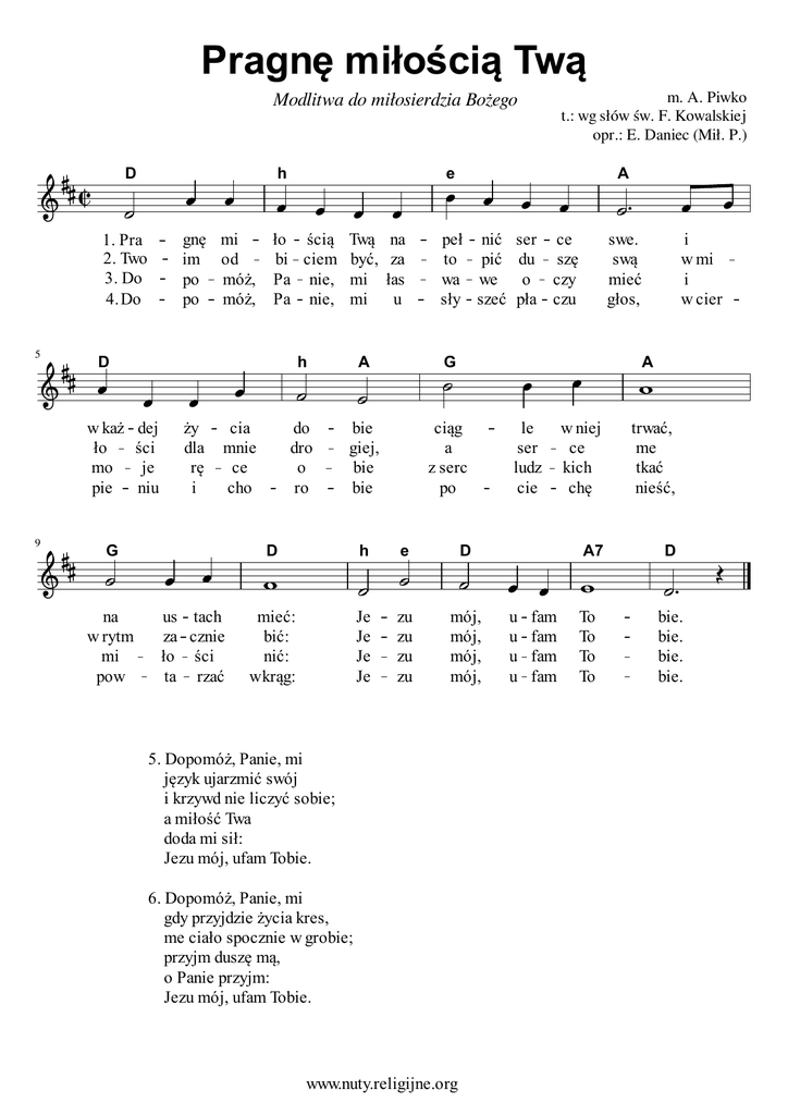 Pragnę miłością Twą m. A. Piwko t.: wg słów św. F. Kowalskiej opr.: E. Daniec (Mił. P.) Modlitwa do miłosierdzia Bożego D h e gnę im po po 1. Pra 2. Two 3. Do 4. Do 5 mi od móż, móż, D ży dla rę i cia mnie ce cho G A do dro o ro bie giej, bie bie D h peł nić to pić wa we sły szeć ser ce du szę o czy pła czu swe. swą mieć głos, i w mi i w cier A ciąg a z serc po le ser ludz cie w niej ce kich chę trwać, me tkać nieść, A7 D u u u u To To To To bie. bie. bie. bie. e D us tach za cznie ło ści ta rzać G na w rytm mi pow ło ścią Twą na bi ciem być, za Pa nie, mi łas Pa nie, mi u w każ dej ło ści mo je pie niu 9 h A mieć: bić: nić: w krąg: Je Je Je Je zu zu zu zu mój, mój, mój, mój, 5. Dopomóż, Panie, mi język ujarzmić swój i krzywd nie liczyć sobie; a miłość Twa doda mi sił: Jezu mój, ufam Tobie. 6. Dopomóż, Panie, mi gdy przyjdzie życia kres, me ciało spocznie w grobie; przyjm duszę mą, o Panie przyjm: Jezu mój, ufam Tobie. www.nuty.religijne.org fam fam fam fam