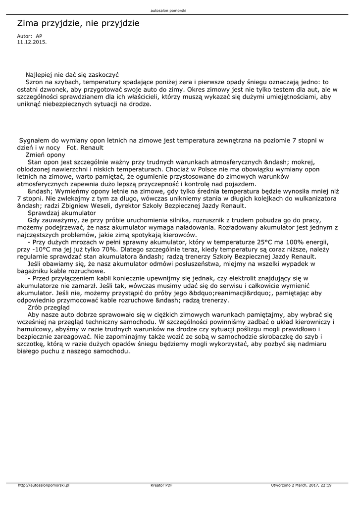 autosalon pomorski Zima przyjdzie, nie przyjdzie Autor: AP 11.12.2015. Najlepiej nie dać się zaskoczyć Szron na szybach, temperatury spadające poniżej zera i pierwsze opady śniegu oznaczają jedno: to ostatni dzwonek, aby przygotować swoje auto do zimy. Okres zimowy jest nie tylko testem dla aut, ale w szczególności sprawdzianem dla ich właścicieli, którzy muszą wykazać się dużymi umiejętnościami, aby uniknąć niebezpiecznych sytuacji na drodze. Sygnałem do wymiany opon letnich na zimowe jest temperatura zewnętrzna na poziomie 7 stopni w dzień i w nocy Fot. Renault Zmień opony Stan opon jest szczególnie ważny przy trudnych warunkach atmosferycznych – mokrej, oblodzonej nawierzchni i niskich temperaturach. Chociaż w Polsce nie ma obowiązku wymiany opon letnich na zimowe, warto pamiętać, że ogumienie przystosowane do zimowych warunków atmosferycznych zapewnia dużo lepszą przyczepność i kontrolę nad pojazdem. – Wymieńmy opony letnie na zimowe, gdy tylko średnia temperatura będzie wynosiła mniej niż 7 stopni. Nie zwlekajmy z tym za długo, wówczas unikniemy stania w długich kolejkach do wulkanizatora – radzi Zbigniew Weseli, dyrektor Szkoły Bezpiecznej Jazdy Renault. Sprawdzaj akumulator Gdy zauważymy, że przy próbie uruchomienia silnika, rozrusznik z trudem pobudza go do pracy, możemy podejrzewać, że nasz akumulator wymaga naładowania. Rozładowany akumulator jest jednym z najczęstszych problemów, jakie zimą spotykają kierowców. - Przy dużych mrozach w pełni sprawny akumulator, który w temperaturze 25°C ma 100% energii, przy -10°C ma jej już tylko 70%. Dlatego szczególnie teraz, kiedy temperatury są coraz niższe, należy regularnie sprawdzać stan akumulatora – radzą trenerzy Szkoły Bezpiecznej Jazdy Renault. Jeśli obawiamy się, że nasz akumulator odmówi posłuszeństwa, miejmy na wszelki wypadek w bagażniku kable rozruchowe. - Przed przyłączeniem kabli koniecznie upewnijmy się jednak, czy elektrolit znajdujący się w akumulatorze nie zamarzł. Jeśli tak, wówczas musimy udać się do serwisu i całkowicie wymienić akumulator. Jeśli nie, możemy przystąpić do próby jego „reanimacji”, pamiętając aby odpowiednio przymocować kable rozruchowe – radzą trenerzy. Zrób przegląd Aby nasze auto dobrze sprawowało się w ciężkich zimowych warunkach pamiętajmy, aby wybrać się wcześniej na przegląd techniczny samochodu. W szczególności powinniśmy zadbać o układ kierowniczy i hamulcowy, abyśmy w razie trudnych warunków na drodze czy sytuacji poślizgu mogli prawidłowo i bezpiecznie zareagować. Nie zapominajmy także wozić ze sobą w samochodzie skrobaczkę do szyb i szczotkę, którą w razie dużych opadów śniegu będziemy mogli wykorzystać, aby pozbyć się nadmiaru białego puchu z naszego samochodu. http://autosalonpomorski.pl Kreator PDF Utworzono 2 March, 2017, 22:19