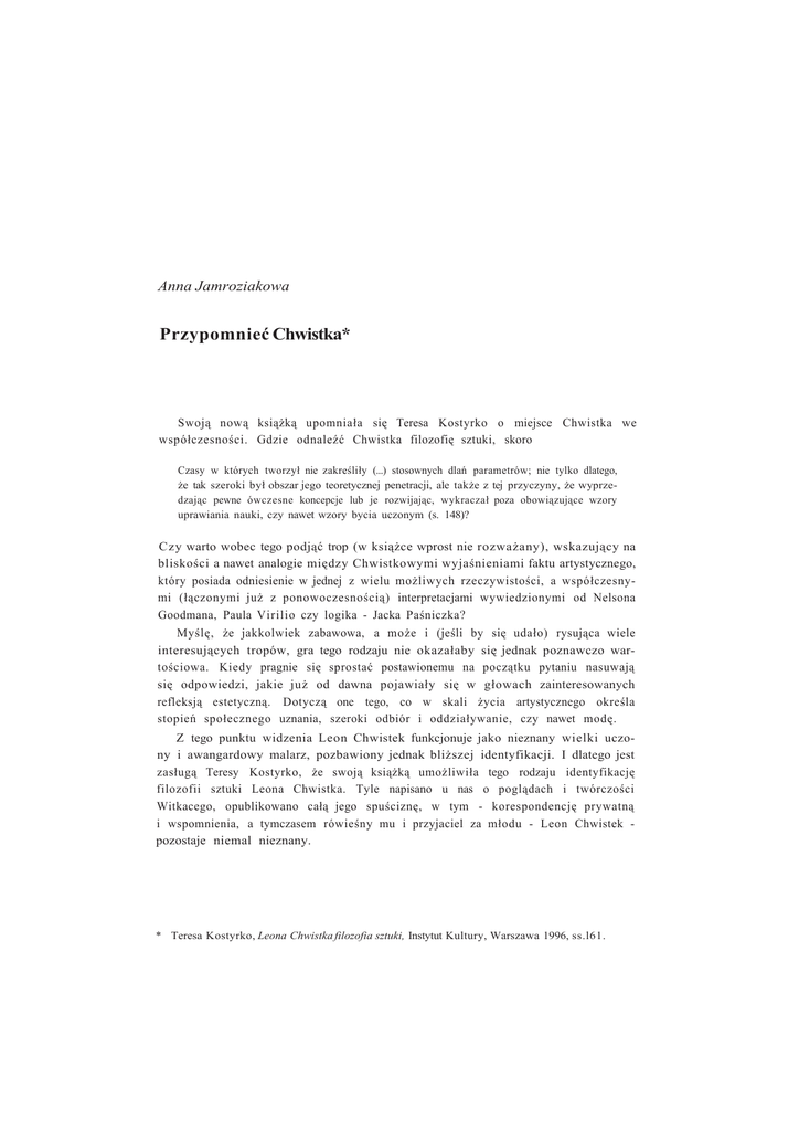 Anna Jamroziakowa Przypomnieć Chwistka* Swoją nową książką upomniała się Teresa Kostyrko o miejsce Chwistka we współczesności. Gdzie odnaleźć Chwistka filozofię sztuki, skoro Czasy w których tworzył nie zakreśliły (...) stosownych dlań parametrów; nie tylko dlatego, że tak szeroki był obszar jego teoretycznej penetracji, ale także z tej przyczyny, że wyprzedzając pewne ówczesne koncepcje lub je rozwijając, wykraczał poza obowiązujące wzory uprawiania nauki, czy nawet wzory bycia uczonym (s. 148)? Czy warto wobec tego podjąć trop (w książce wprost nie rozważany), wskazujący na bliskości a nawet analogie między Chwistkowymi wyjaśnieniami faktu artystycznego, który posiada odniesienie w jednej z wielu możliwych rzeczywistości, a współczesnymi (łączonymi już z ponowoczesnością) interpretacjami wywiedzionymi od Nelsona Goodmana, Paula Virilio czy logika - Jacka Paśniczka? Myślę, że jakkolwiek zabawowa, a może i (jeśli by się udało) rysująca wiele interesujących tropów, gra tego rodzaju nie okazałaby się jednak poznawczo wartościowa. Kiedy pragnie się sprostać postawionemu na początku pytaniu nasuwają się odpowiedzi, jakie już od dawna pojawiały się w głowach zainteresowanych refleksją estetyczną. Dotyczą one tego, co w skali życia artystycznego określa stopień społecznego uznania, szeroki odbiór i oddziaływanie, czy nawet modę. Z tego punktu widzenia Leon Chwistek funkcjonuje jako nieznany wielki uczony i awangardowy malarz, pozbawiony jednak bliższej identyfikacji. I dlatego jest zasługą Teresy Kostyrko, że swoją książką umożliwiła tego rodzaju identyfikację filozofii sztuki Leona Chwistka. Tyle napisano u nas o poglądach i twórczości Witkacego, opublikowano całą jego spuściznę, w tym - korespondencję prywatną i wspomnienia, a tymczasem rówieśny mu i przyjaciel za młodu - Leon Chwistek pozostaje niemal nieznany. * Teresa Kostyrko, Leona Chwistka filozofia sztuki, Instytut Kultury, Warszawa 1996, ss.l61. 90 RECENZJE I OMÓWIENIA W książce poświęconej filozofii sztuki Leona Chwistka poznajemy go w trzech próbach ujęcia. Część pierwsza poświęcona jest przybliżeniu i wyjaśnieniu koncepcji wielości rzeczywistości przez odkrycie filozoficznych jej uwarunkowań - samych podstaw teorii wraz z recepcją i narosłymi wokół niej komentarzami filozofów i krytyków ówczesnych (T. Kotarbińskiego, R. Ingardena, K. Błeszyńskiego, St. I. Witkiewicza, L. Infelda, K. Irzykowskiego). Do teorii docieramy jednak w jej interpretacji współczesnej, w zaproponowanej przez Autorkę nowej aparaturze pojęciowej. Teresa Kostyrko postawiła sobie zadanie ambitne - nie chce bowiem sugerować, że dzięki nowym narzędziom z zakresu logiki i metodologii koncepcja Chwistka nie należy do historii, lecz że dzięki wykorzystaniu koncepcji modelu semantycznego można wprost - i to w sposób naukowy - wskazać na jej ważność i przeprowadzić jej obronę. Oryginalność teorii Chwistka uwarunkowana jest bowiem jego własnym usytuowaniem wielości rzeczywistości, które nie znalazło naówczas adekwatnej logicznej formy wyrazu. Pojęcie modelu semantycznego pojawiło się bowiem dopiero w latach pięćdziesiątych, co dowodzić może zindywidualizowania i oryginalności jego naukowych osiągnięć, interesujących zwłaszcza w intuicyjnym wyprzedzeniu przez Chwistka idei, które zapanowały w metodologii nauk około 30 lat po opublikowaniu Wielości rzeczywistości i nadal należą do wykorzystywanych założeń badawczych w dziedzinie semantyki logicznej (s. 59). W części drugiej filozoficzna teoria wielości rzeczywistości odniesiona została do sztuki, do rozważań Chwistka nasyconych wiedzą o faktach z zakresu historii sztuki i sztuki współczesnej - sztuki zawsze podejmującej oryginalny artystyczny eksperyment, nigdy naśladowczej. Z wielkim krytycyzmem wypowiadał się więc Chwistek o powszechnej naturalistycznej konwencji obrazowania, której nie towarzyszy - istotna dla uwarunkowania wielości rzeczywistości w sztuce - teza, że "natura jest czymś, co my na swój sposób tworzymy". Upływ czasu każe przyznać Chwistkowi rację i jest zdumiewające, że jego prognozy poświęcone rozwojowi artystycznej praktyki w szerokiej skali społecznej były tak trafne. Tego nie dostrzegali zupełnie jego polemiści. Poświęcony tym problemom fragment książki przykuwa uwagę, odsłania bowiem zależności, jakim podlegają procesy mentalne krytyków koncepcji Chwistka. Rzeczywistość duchowa, którą wyrażali i z którą się identyfikowali w krytyce odmiennych niż upowszechnione poglądów, zdaje się mieć mocno wytyczone granice i niewielką przestrzeń, nieledwie "boiska". Część trzecia przybliża Chwistka jako artystę zaangażowanego w legitymizowanie awangardowego kierunku artystycznego, z którym pozostawał związany, tak w manifestach, jakie towarzyszyły prezentacjom artystycznym, jak i w sporach, które im towarzyszyły, a także w przyjaźniach i kontaktach towarzyskich. Teresa Kostyrko podejmuje tu także niezwykle ważny i mniej okazjonalnie uwarunkowany aspekt metody w estetyce. Chwistek jest niewątpliwie rzecznikiem uteoretycznienia nie tylko sztuki, ale i szerzej - kultury artystycznej, tyle że podejmował się realizacji tego w sposób nietradycyjny. Nie identyfikował się bowiem z tradycją aka- RECENZJE I OMÓWIENIA 91 demicką (w której założenia ontologiczne miały swoje konsekwencje na gruncie estetyki). Punktem wyjścia bowiem jest dlań program poznawczy (jak on sam mówił: problem teorii poznania), w którym istotną rolę odgrywają reguły logiki domagające się wewnętrznej niesprzeczności, tj. spójności tworzonego systemu teoretycznego. Poza takim systemem nie jest, zdaniem Chwistka, możliwe rozpatrywanie problemów ontologicznych i epistemologicznych w różnych przejawach działalności człowieka (s. 118). Warto by jeszcze zastanowić si