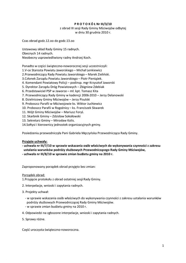 P R O T O K Ó Ł Nr III/3/10 z obrad III sesji Rady Gminy Mściwojów odbytej w dniu 30 grudnia 2010 r. Czas obrad godz.12.oo do godz.13.oo Ustawowy skład Rady Gminy 15 radnych. Obecnych 14 radnych. Nieobecny usprawiedliwiony radny Andrzej Koch. Ponadto w części świąteczno-noworocznej sesji uczestniczyli: 1.V-ce Starosta Powiatu Jaworskiego – Michał Lenkiewicz 2.Przewodniczący Rady Powiatu Jaworskiego – Marek Zieliński. 3.Członek Zarządu Powiatu Jaworskiego – Piotr Pieniążek. 4. Komendant Powiatowy Policji – podinsp. mgr Krzysztof Jaworski 5. Dyrektor Zarządu Dróg Powiatowych – Zbigniew Zdebiak 6. Przedstawiciel PSP w Jaworze – mł. kpt. Tomasz Kita 7. Przewodniczący Rady Gminy w kadencji 2006-2010 – Jerzy Delanowski 8. Dzielnicowy Gminy Mściwojów – Jerzy Pisulski 9. Proboszcz Parafii w Mściwojowie ks. Wiktor Juchiewicz 10. Proboszcz Parafii w Rogoźnicy – ks. Franciszek Skwarek 11. Wójt Gminy Mściwojów – Mariusz Foryś. 12. Skarbnik Gminy – Zdzisław Sokołowski 13. Sekretarz Gminy – Mirosław Kolis. 14.Sołtysi i kierownicy jednostek organizacyjnych gminy. Posiedzeniu przewodniczyła Pani Gabriela Męczyńska Przewodnicząca Rady Gminy. Przyjęte uchwały: - uchwała nr III/7/10 w sprawie wskazania osób właściwych do wykonywania czynności z zakresu ustalania warunków podróży służbowych Przewodniczącego Rady Gminy Mściwojów, - uchwała nr III/8/10 w sprawie zmian budżetu gminy na 2010 r. Zaproponowany porządek obrad przyjęto bez zmian: Porządek obrad: 1.Przyjęcie protokołu z obrad ostatniej sesji Rady Gminy. 2. Interpelacje, wnioski i zapytania radnych. 3. Projekty uchwał: - w sprawie wskazania osób właściwych do wykonywania czynności z zakresu ustalania warunków podróży służbowych Przewodniczącej Rady Gminy Mściwojów. - w sprawie zmian budżetu gminy na 2010 r. 4. Odpowiedzi na zgłoszone interpelacje, wnioski i zapytania radnych. 5. Sprawy różne. Część uroczysta świąteczno-noworoczna. 1 Ad.1. Protokół z obrad II sesji Rady Gminy przyjęto jednogłośnie w głosowaniu jawnym. Ad.2. W ramach interpelacji, wniosków i zapytań zgłoszono: - radny Henryk Michalak z Targoszyna – zgłosił interpelację w sprawie wycinki starych lip na cmentarzu komunalnym w Targoszynie, już jedna z nich jest niebezpiecznie przechylona na dom przedpogrzebowy, Na prośbę mieszkańców zgłosił do rozważenia wniosek w sprawie usytuowania przystanku dla BUS-ów w okolicy wjazdu do parku (posesja nr 25). W imieniu mieszkańców Targoszyna radny podziękował za całonocne świecenie lamp oświetlenia ulicznego. - radny Krzysztof Dziura z Targoszyna – zgłosił wniosek w sprawie ustawienia pojemnika na szkło i na śmieci w środkowej części miejscowości (tzw. „górce”). Radny zgłosił również, że wycieka woda spod kafelek na posadce przed toaletami na świetlicy wiejskiej w Targoszynie. Na wniosek właściciela Baru w Targoszynie zgłosił zapytanie, dlaczego tylko w Targoszynie bar ma być czynny do godz.23.oo, prawdopodobnie gdzie indziej jest dłużej, do kiedy chcą ? - radny Zbigniew Łuniewski z Zimnika – zwrócił uwagę na bardzo zły stan dróg powiatowych w okresie zimy – w innych miejscowościach poza powiatem jaworskim drogi są należycie utrzymywane ( odśnieżane w należyty sposób). - radny Henryk Adamus ze Snowidzy – zwrócił uwagę na konieczność zabezpieczenia przechylonej wieży na cmentarzu – może dojść do nieszczęścia. - radna Dorota Rajnert z Niedaszowa – zgłosiła problem z brudną wodą po każdej awarii wodociągu. Proces oczyszczania trwa do 2 tyg. – woda nie jest zdatna do użytku. Rada zwróciła uwagę, że przyczyną takiego stanu rzeczy może być wyciek na wodociągu przy posesji p. Kartkowskich. W imieniu mieszkańców sołectwa Siekierzyce radna zgłosiła: - konieczność wymiany zniszczonego znak STOP od strony Niedaszowa, - ustawienia znaku informującego o nazwie miejscowości od strony Niedaszowa oraz ustawienie znaku zakazującego wjazdu do miejscowości pojazdów powyżej 6 ton ładowności, - ze względu na bezpieczeństwo dzieci dojeżdżających do szkoły prosiła o rozważenie możliwości wjazdu do wsi autobusu szkolnego i zabierania tam dzieci, - zabezpieczenie „starej” nieczynnej wagi – możliwość wpadnięcia do środka, - jeżeli będą możliwości wymienić na nową wiatę przystankową przy drodze powiatowej, - radny Jan Chomiak z Luboradza – zgłosił wniosek aby ze względu na pracujących rozważyć możliwość wydłużenia, chociaż w jeden dzień w tygodniu, pracy Urzędu i Zakładu Gospodarki Komunalnej. Ze względu na bezpieczeństwo mieszkańców gminy zgłosił wniosek o rozważenie możliwości całonocnego funkcjonowania oświetlenia ulicznego. - radny Andrzej Kozioł z Marcinowic – w ślad za poprzednikiem zaproponował aby lamy świeciły się trochę później (od dobrego zmroku) do bladego świtu a w zamian oświetlenie uliczne aby funkcjonowało przez całą noc. 2 Ad.3. Po przedstawieniu przez Panią Przewodniczącą Rady Gminy projektu uchwały w głosowaniu jawnym jednogłośnie, przy obecności 14 radnych wskazano V-ce Przewodniczących jako osoby właściwe do wykonywania czynności z zakresu ustalania warunków podróżny służbowych Przewodniczącej. ( uchwała nr III/7/10 w załączeniu) Omawiając kolejny projekt Pan Skarbnik poinformował, że w przedstawionym projekcie uchwały proponuje się zmniejszenie planowanych dochodów i wydatków gminy o kwotę 135.666,00 zł oraz zmniejszenie planu wydatków inwestycyjnych o kwotę 37.110,00 zł. Po wprowadzeniu proponowanych zmniejszeń, plan dochodów będzie wynosił 15.137.996,00 zł, w tym dochody bieżące 8.989.600,00 zł, plan wydatków 16.510.036,00 zł w tym wydatki bieżące 10.450.509,00 zł. Wydatki inwestycyjne wyniosą 5.928.527,00 zł. W planie dochodów następuje zwiększenie z tytułu najmu i dzierżawy składników majątkowych o 