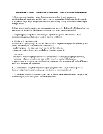 Regulamin korzystania z komputerów Internetowego Centrum Informacji Multimedialnej 1. Komputer multimedialny służy do przeglądania edukacyjnych programów multimedialnych, dostępnych w bibliotece oraz do wyszukiwania informacji w Internecie. Korzystać z niego mogą wszyscy uczniowie i pracownicy szkoły na zasadach określonych w regulaminie. 2. Przy stanowisku komputerowym mogą pracować najwyżej dwie osoby. Maksymalny czas pracy wynosi 1 godzinę. Można zarezerwować czas pracy na następny dzień. 3. Na pracę przy komputerze potrzebna jest zgoda nauczyciela bibliotekarza. Przed rozpoczęciem pracy należy się wpisać do zeszytu ewidencji. 4. Użytkownik ma obowiązek: - informować dyżurującego ucznia lub nauczyciela o nieprawidłowym działaniu komputera oraz o ewentualnych uszkodzeniach technicznych, - zachować ciszę i nie zakłócać pracy innym użytkownikom. - stosować się do poleceń nauczyciela lub dyżurującego ucznia. 5. Nie wolno: - instalować własnych programów i dokonywać zmian w istniejącym oprogramowaniu, - wyłączać i włączać urządzeń do sieci elektrycznej bez zgody bibliotekarza, - wykorzystywać oprogramowania do celów komercyjnych, naruszających godność innych osób oraz niezgodnych z prawem. 6. Za uszkodzenie sprzętu komputerowego i oprogramowania użytkownik odpowiada finansowo (jeśli jest niepełnoletni, odpowiedzialność ponoszą rodzice). 7. Za nieprzestrzeganie regulaminu grozi kara w formie zakazu korzystania z komputerów w określonym przez nauczyciela bibliotekarza czasie.