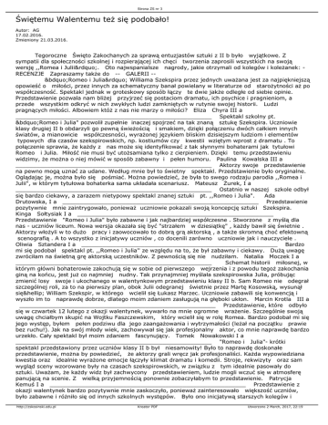 Strona ZS nr 3 Świętemu Walentemu też się podobało! Autor: AG 17.02.2016. Zmieniony 21.03.2016. Tegoroczne Święto Zakochanych za sprawą entuzjastów sztuki z II b było wyjątkowe. Z sympatii dla społeczności szkolnej i rozpierającej ich chęci tworzenia zaprosili wszystkich na swoją wersję ,,Romea i Julii”. Oto najwspanialsze nagrody, jakie otrzymali od kolegów i koleżanek: RECENZJE Zapraszamy także do -- GALERII -„Romeo i Julia” Williama Szekspira przez jednych uważana jest za najpiękniejszą opowieść o miłości, przez innych za schematyczny banał powielany w literaturze od starożytności aż po współczesność. Spektakl jednak w groteskowy sposób łączy te dwie jakże odległe od siebie opinie. Przedstawienie pozwala nam bliżej przyjrzeć się postaciom dramatu, ich psychice i pragnieniom, a przede wszystkim odkryć w nich zwykłych ludzi zamkniętych w rutynie swojej historii. Ludzi pragnących miłości. Albowiem któż z nas nie marzy o miłości? Eliza Chyra III a ________________________________________________________ Spektakl szkolny pt. „Romeo i Julia" pozwolił zupełnie inaczej spojrzeć na tak znaną sztukę Szekspira. Uczniowie klasy drugiej II b obdarzyli go pewną świeżością i smakiem, dzięki połączeniu dwóch całkiem innych światów, a mianowicie współczesności, wyrażonej językiem bliskim dzisiejszym ludziom i elementów typowych dla czasów szekspirowskich, np. kostiumów czy kwestii wziętym wprost z dramatu . To połączenie sprawia, że każdy z nas może się identyfikować z tak słynnymi bohaterami jak tytułowi Romeo i Julia. Miłość nie musi być utożsamiana tylko z cierpieniem. Dzięki temu przedstawieniu widzimy, że można o niej mówić w sposób zabawny i pełen humoru. Paulina Kowalska III a ________________________________________________________ Aktorzy swoje przedstawienie na pewno mogą uznać za udane. Według mnie był to świetny spektakl. Przedstawienie było oryginalne. Oglądając je, można było się pośmiać. Można powiedzieć, że była to swego rodzaju parodia ,,Romea i Julii", w którym tytułowa bohaterka sama układała scenariusz. Mateusz Żurek, I a ________________________________________________________ Ostatnio w naszej szkole odbył się bardzo ciekawy, a zarazem nietypowy spektakl znanej sztuki pt. ,,Romeo i Julia". Ada Drutowska, I a ________________________________________________________ Przedstawienie pozytywnie mnie zaintrygowało, ponieważ uczniowie pokazali swoją koncepcję sztuki Szekspira. Kinga Sołtysiak I a ________________________________________________________ Przedstawienie "Romeo i Julia" było zabawne i jak najbardziej współczesne . Stworzone z myślą dla nas - uczniów liceum. Nowa wersja okazała się być "strzałem w dziesiątkę" , każdy bawił się świetnie . Aktorzy włożyli w to dużo pracy i zaowocowało to dobrą grą aktorską , a także skromną choć efektowną scenografią . A to wszystko z inicjatywy uczniów , co docenili zarówno uczniowie jak i nauczyciele . Oliwia Sztandera I a ________________________________________________________ Bardzo mi się podobał spektakl pt. ,,Romeo i Julia'' ze względu na to, że był zabawny i ciekawy. Dużą uwagę zwróciłam na świetną grę aktorską uczestników. Z pewnością się nie nudziłam. Natalia Moczek I a ________________________________________________________ Schemat historii miłosnej, w którym główni bohaterowie zakochują się w sobie od pierwszego wejrzenia i z powodu tegoż zakochania giną na końcu, jest już co najmniej nudny. Tak przynajmniej myślała szekspirowska Julia, próbując zmienić losy swoje i ukochanego w walentynkowym przedstawieniu klasy II b. Sam Romeo nie odegrał szczególnej roli, za to na pierwszy plan, obok Julii odegranej świetnie przez Martę Kosowską, wysunął się… William Szekspir, w którego wcielił się Łukasz Marzec. Uczniowie zabawili się konwencją i wyszło im to naprawdę dobrze, dlatego moim zdaniem zasługują na głęboki ukłon. Marcin Krotla III a ________________________________________________________ Przedstawienie, które odbyło się w czwartek 12 lutego z okazji walentynek, wywarło na mnie ogromne wrażenie. Szczególnie swoją uwagę chciałbym skupić na Wojtku Faszczewskim, który wcielił się w rolę Romea. Bardzo podobał mi się jego występ, byłem pełen podziwu dla jego zaangażowania i wytrzymałości (leżał na początku prawie bez ruchu!). Jak na swój młody wiek, zachowywał się jak profesjonalny aktor, co mnie naprawdę bardzo urzekło. Cały spektakl był moim zdaniem fascynujący. Tomek Nowakowski I a ________________________________________________________ "Romeo i Julia"- krótki spektakl przedstawiony przez uczniów klasy II b był niesamowity! Było to naprawdę doskonałe przedstawienie, można by powiedzieć, że aktorzy grali wręcz jak profesjonaliści. Każda wypowiedziana kwestia oraz idealnie wyrażone emocje łączyły klimat dramatu i komedii. Stroje, rekwizyty oraz sam wygląd sceny wzorowane były na czasach szekspirowskich, w związku z tym idealnie pasowały do sztuki. Uważam, że każdy widz był zachwycony przedstawieniem, ludzie mogli wczuć się w atmosferę panującą na scenie. Z wielką przyjemnością ponownie zobaczyłabym to przedstawienie. Patrycja Kemuś I a ________________________________________________________ Przedstawienie z okazji walentynek bardzo pozytywnie mnie zaskoczyło, ponieważ zainteresowało większość uczniów, było zabawne i różniło się od innych szkolnych występów. Było ono inicjatywą starszych kolegów i http://zskosinski.edu.pl Kreator PDF Utworzono 2 March, 2017, 22:19 Strona ZS nr 3 koleżanek z II b, którzy sami załatwili ładne stroje i ciekawie przygotowali scenę. Z pewnością włożyli we wszystko dużo pracy i poświęcili swój własny czas. Było też widać, że sprawiło im to przyjemność. Justyna Trojak, kl. Ia ________
