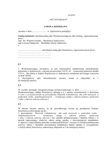- projektAKT NOTARIALNY UMOWA DZIERŻAWY zawarta w dniu ........................... w Sędziszowie pomiędzy: Gminą Sędziszów określaną dalej jako Wydzierżawiającym albo Gminą, reprezentowaną przez : mgr inż. Wacława Szarka – Burmistrza Sędziszowa, mgr Lucynę Nahajczuk – Skarbnika Gminy Sędziszów, a ......................................... , określanym dalej jako Dzierżawca reprezentowanym przez : ……………………………………… ……………………………………… ……………………………………… §1 1. Wydzierżawiający oświadcza, że jest właścicielem zabudowanej nieruchomości położonej w Sędziszowie, o łącznej powierzchni 3.6519 m2 , oznaczonej numerem działki 1751/1, dla której w Sądzie Rejonowym w Jędrzejowie urządzona jest księga wieczysta Nr KW 58478 2. Szczegółowy opis nieruchomości zawarty został w załączniku nr 1 do niniejszej umowy . §2 W wyniku przetargu nieograniczonego przeprowadzonego w dniu .................................. Wydzierżawiający oddaje Dzierżawcy opisaną w § 1 umowy nieruchomość w dzierżawę w celu i z przeznaczeniem na prowadzenie Placówki Całodobowej dla osób starszych, w podeszłym wieku, niepełnosprawnych – świadczącą usługi z zakresu pomocy społecznej ( albo z zakresu ochrony zdrowia ) §3 W okresie trwania umowy, aż do prawidłowego zwrotu jej przedmiotu Gminie, Dzierżawca zobowiązuje się do : 1. prowadzenia Placówki Całodobowej dla osób starszych, w podeszłym wieku , niepełnosprawnych – świadcząca usługi z zakresu pomocy społecznej ( albo z zakresu ochrony zdrowia ) bez udziału dofinansowania z budżetu Gminy i w sposób zapewniający właściwy zakres usług, zgodny z obowiązującym standardem, w oparciu o indywidualne potrzeby świadczeniobiorców i zawarte ze świadczeniobiorcami umowy; zakres i charakter prowadzonej działalności będzie zgodny w szczególności z treścią oferty Dzierżawcy stanowiącej załącznik nr 2 do niniejszej umowy 2. wypełniania obowiązków związanych z zarządzaniem dzierżawioną nieruchomością a w szczególności : a) ponoszenia kosztów eksploatacji nieruchomości (media - woda, ścieki, prąd, telekomunikacja, wywóz śmieci i inne), b) utrzymania na własny koszt i we własnym zakresie nieruchomości w niepogorszonym stanie technicznym, w tym utrzymania substancji obiektu, jego wyposażenia oraz urządzeń infrastruktury towarzyszącej a także terenu przyległego w tym otaczającej zieleni (konserwacja, naprawy i remonty oraz ewentualna modernizacja), usuwania odpadów, odśnieżania i zamiatania dróg, parkingów, wykonywania innych obowiązków wynikających z przepisów prawa w tym w szczególności prawa budowlanego oraz prawa ochrony zabytków dotyczących utrzymania nieruchomości w należytym stanie, ponosząc wyłączną odpowiedzialność z tego tytułu; Dzierżawca podejmuje wszelkie czynności niezbędne do zabezpieczenia przedmiotu dzierżawy przed skutkami zdarzeń losowych. c) ubezpieczenia majątku i opłacania składek, d) należytego utrzymania na własny koszt i we własnym zakresie użytkowanego parku, szczególnie z uwzględnieniem estetyki, czystości, utrzymania kwiatów i zieleni. §4 Niezależnie od postanowień § 2 Dzierżawca zobowiązuje się : 1. Zapewnić we własnym zakresie i na własny koszt wyposażenie obiektu Placówki (meble + wyposażenie specjalistyczne niezbędne do realizacji zadań) w zakresie zawartym w swojej ofercie - oraz utrzymania tych składników majątkowych w należytym stanie w tym bieżącej wymiany zużytych elementów wyposażenia; Dzierżawca zobowiązuje się uruchomić Placówkę nie później niż w ciągu 3 miesięcy od rozstrzygnięcia przetargu tj. do dnia ……………….. 2. Zapewnić pierwszeństwo zatrudnienia w Placówce w okresie trwania umowy osobom zamieszkałym na terenie Gminy Sędziszów . 3. Zapewnić do dyspozycji Gminy 5 miejsc stałego pobytu z odpłatnością nie wyższą od kosztów własnych. §5 Dzierżawca nie ma prawa oddawać w poddzierżawę, podnajem lub do nieodpłatnego używania przedmiotu umowy lub jego części osobom trzecim, lub przenosić innych praw i obowiązków wynikających z niniejszej umowy na osoby trzecie bez uprzedniej pisemnej zgody Wydzierżawiającego. §6 Wydzierżawiający przez swoje służby ma prawo w czasie uzgodnionym przez Strony dokonywać przeglądu przedmiotu umowy . §7 Dzierżawca przyjmuje na siebie wszelką odpowiedzialność za szkody związane z ryzykiem osobowym i rzeczowym wynikającym z posiadania przedmiotu umowy jakie wydarzyły się na jego terenie albo pozostają w związku z jego użytkowaniem, w szczególności Strony wyłączają odpowiedzialność Wydzierżawiającego z tego tytułu wobec Dzierżawcy oraz osób trzecich. §8 Dzierżawca ponosi we własnym zakresie obciążenia publiczno-prawne dotyczące prowadzonej działalności jak też samego przedmiotu dzierżawy . §9 1. Strony ustalają następującą miesięczną wysokość czynszu dzierżawnego: - grunt – odstępuje się od czynszu - obiekt za m2 – ……….. zł (netto) + VAT tj. 759,50 m2 x ……… zł. = ………….. …………… + VAT - wyposażenie …………………. + VAT Łącznie - …………………… ( słownie ) + VAT . 2. Termin płatności strony ustalają do dnia 15-go każdego miesiąca z góry 3. Zmiana stawki czynszowej następować będzie bez potrzeby sporządzania aneksu do umowy, corocznie o wskaźnik wzrostu cen na towary i usługi konsumpcyjne ogłoszony przez Prezesa GUS w Monitorze Polskim za poprzedni kwartał. Waloryzacja następuje od pierwszego dnia kwartału następującego po kwartale, w którym zawarta została umowa. 4. Za dokonanie płatności uznaje się datę wpływu środków na rachunek bankowy Wydzierżawiającego. W przypadku uchybienia terminu płatności, Dzierżawca zobowiązuje się płacić odsetki umowne za opóźnienie, w wysokośc