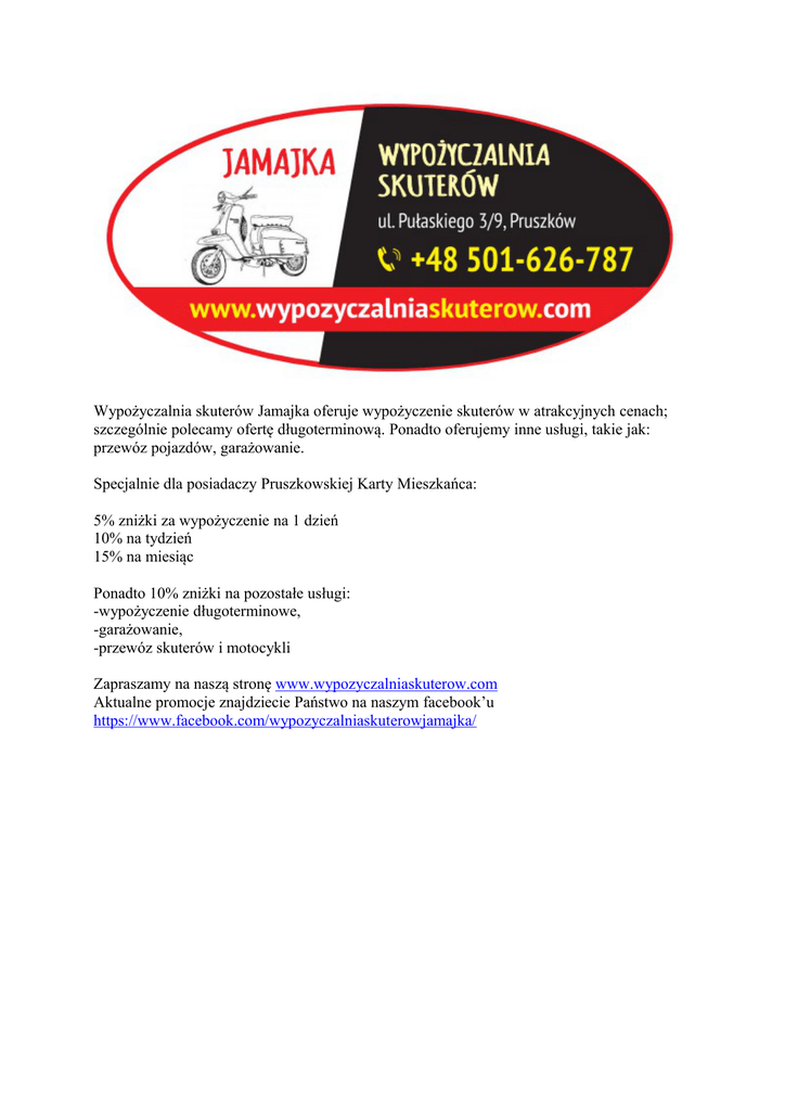 Wypożyczalnia skuterów Jamajka oferuje wypożyczenie skuterów w atrakcyjnych cenach; szczególnie polecamy ofertę długoterminową. Ponadto oferujemy inne usługi, takie jak: przewóz pojazdów, garażowanie. Specjalnie dla posiadaczy Pruszkowskiej Karty Mieszkańca: 5% zniżki za wypożyczenie na 1 dzień 10% na tydzień 15% na miesiąc Ponadto 10% zniżki na pozostałe usługi: -wypożyczenie długoterminowe, -garażowanie, -przewóz skuterów i motocykli Zapraszamy na naszą stronę www.wypozyczalniaskuterow.com Aktualne promocje znajdziecie Państwo na naszym facebook’u https://www.facebook.com/wypozyczalniaskuterowjamajka/