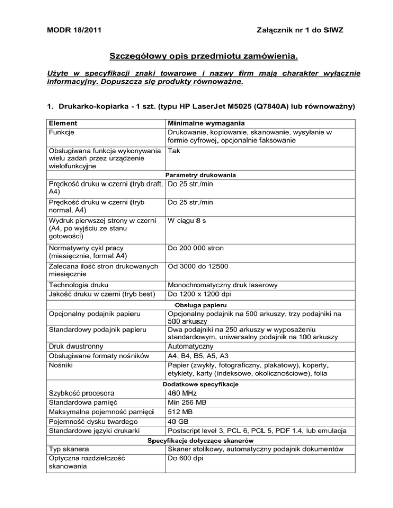 MODR 18/2011 Załącznik nr 1 do SIWZ Szczegółowy opis przedmiotu zamówienia. Użyte w specyfikacji znaki towarowe i nazwy firm mają charakter wyłącznie informacyjny. Dopuszcza się produkty równoważne. 1. Drukarko-kopiarka - 1 szt. (typu HP LaserJet M5025 (Q7840A) lub równoważny) Element Funkcje Minimalne wymagania Drukowanie, kopiowanie, skanowanie, wysyłanie w formie cyfrowej, opcjonalnie faksowanie Obsługiwana funkcja wykonywania Tak wielu zadań przez urządzenie wielofunkcyjne Parametry drukowania Prędkość druku w czerni (tryb draft, Do 25 str./min A4) Prędkość druku w czerni (tryb normal, A4) Do 25 str./min Wydruk pierwszej strony w czerni (A4, po wyjściu ze stanu gotowości) W ciągu 8 s Normatywny cykl pracy (miesięcznie, format A4) Do 200 000 stron Zalecana ilość stron drukowanych miesięcznie Od 3000 do 12500 Technologia druku Jakość druku w czerni (tryb best) Monochromatyczny druk laserowy Do 1200 x 1200 dpi Obsługa papieru Opcjonalny podajnik papieru Standardowy podajnik papieru Druk dwustronny Obsługiwane formaty nośników Nośniki Opcjonalny podajnik na 500 arkuszy, trzy podajniki na 500 arkuszy Dwa podajniki na 250 arkuszy w wyposażeniu standardowym, uniwersalny podajnik na 100 arkuszy Automatyczny A4, B4, B5, A5, A3 Papier (zwykły, fotograficzny, plakatowy), koperty, etykiety, karty (indeksowe, okolicznościowe), folia Dodatkowe specyfikacje Szybkość procesora Standardowa pamięć Maksymalna pojemność pamięci Pojemność dysku twardego Standardowe języki drukarki 460 MHz Min 256 MB 512 MB 40 GB Postscript level 3, PCL 6, PCL 5, PDF 1.4, lub emulacja Specyfikacje dotyczące skanerów Typ skanera Optyczna rozdzielczość skanowania Skaner stolikowy, automatyczny podajnik dokumentów Do 600 dpi Kodowanie koloru Maks. format skanowania (skaner płaski) 30-bitowe 29,7 x 42,0 cm Maks. format skanowania (automatyczny podajnik dokumentów) Jakość skanowania w czerni (tryb normal) 297 x 420 mm Do 25 str./min Specyfikacje dotyczące kopiarki Prędkość kopiowania (w czerni, Do 25 kopii/min tryb normal, format A4) Rozdzielczość kopii (tekst w czerni) Do 600 x 600 dpi Zmniejszanie/powiększanie kopii 25-400% Maksymalna liczba kopii 1000 Drukowanie zdjęć Wyświetlacz Ekran LCD, dotykowy Standardowe rozwiązania komunikacyjne Wbudowany serwer druku do sieci Fast Ethernet, port FIH (Foreign Interface Harness), port USB (zgodny ze specyfikacją USB 2.0) typu A, port USB (zgodny ze specyfikacją USB 2.0) typu B, otwarte gniazdo EIO, opcjonalny faks analogowy Obsługiwane systemy operacyjne Microsoft® Windows® 2000, XP Home, XP Professional, XP Professional x64, Server 2003; Mac OS X 10.2 lub nowszy Sieci i łączność Wymiary i waga Waga produktu Waga w opakowaniu (brutto) 55 kg 62kg Wymagania dotyczące zasilania i eksploatacji Zasilanie Zużycie energii Ciśnienie akustyczne od 220 do 240 V (+/- 10%), 50 Hz (+/- 2 Hz), 6 A Maksymalnie 0,2 W (wyłączone), maksymalnie 21 W (tryb uśpienia), maksymalnie 80 W (tryb gotowości), maksymalnie 600 W (drukowanie), maksymalnie 640 W (kopiowanie) 51 dB(A) (drukowanie), 56 dB(A) (kopiowanie lub skanowanie) Moc dźwięku 6,6 B(A) (drukowanie z prędkością 25 str./min) Poziom ciśnienia akustycznego 51 dB(A) emisji obok urządzenia (aktywność, drukowanie) Zakres temperatur podczas Od 15°C do 35°C eksploatacji Certyfikat ENERGY STAR® Tak Zawartość opakowania Gwarancja 3 letnia ograniczona gwarancja na sprzęt z serwisem u klienta oraz pomoc telefoniczna i internetowa 2. Drukarka - 10 szt. (typu HP LaserJet Enterprise P3015d CE526A lub równoważny) Element Prędkość druku w czerni (tryb normal, A4) Wydruk pierwszej strony w czerni (A4, po wyjściu ze stanu gotowości) Minimalne wymagania Do 40 str./min Jakość druku w czerni (tryb best) Technologia druku Normatywny cykl pracy (miesięcznie, format A4) Zalecana ilość stron drukowanych miesięcznie Standardowa pamięć Maksymalna pojemność pamięci Szybkość procesora Standardowe języki drukarki Do 1200 x 1200 dpi Monochromatyczny druk laserowy Do 100000 stron 7,5 s Od 1500 do 5000 128 MB 640 MB 540 MHz PCL, HP, Postscript Level 3, bezpośredni druk PDF (wersja 1.4) lub ich emulacja Obsługa papieru Standardowa liczba podajników papieru Maks. liczba pojemników na papier Standardowy podajnik papieru 2 4 Uniwersalny podajnik na 100 ark. (podajnik nr 1), jeden podajnik na 500 ark. (podajnik nr 2), moduł automatycznego druku dwustronnego Opcjonalny podajnik papieru 2 opcjonalne podajniki papieru na 500 ark. (podajnik nr 3 i 4) Standardowy odbiornik papieru Odbiornik na 250 arkuszy, odbiornik tylny na 100 arkuszy Druk dwustronny Obsługiwane formaty nośników Niestandardowe wymiary nośników Automatyczny (standardowo) A4, A5, B5 (JIS), A6 Podajnik uniwersalny: 76 x 127 — 216 x 356 mm; podajnik nr 2 i opcjonalne podajniki papieru na 500 ark. (podajnik nr 3 i 4) od 105 x 148 do 216 x 356 mm Nośniki Papier (typu bond, kolorowy, firmowy, zwykły, wstępnie zadrukowany, dziurkowany, ekologiczny, szorstki), koperty, etykiety, kartony, folia do przezroczy, zdefiniowany przez użytkownika Sieci i łączność Standardowe rozwiązania komunikacyjne 1 port Hi-Speed USB 2.0, 1 zew. port Host USB, 2 wew. porty akcesoriów dla rozwiązań HP i partnerów, 1 gniazdo EIO Wymiary i waga Gramatura nośników (wg ścieżki podawania papieru) Podajnik 1: od 60 do 199 g/m² (prosta ścieżka prowadzenia papieru dla nośników specjalnych); podajnik 2, 3: od 60 do 120 g/m² Wymiary (szer. x głęb. x wys.) Waga produktu 448 x 412 x 316 mm 16 kg Wymagania dotyczące zasilania i eksploatacji Obsługiwane systemy operacyjne Microsoft® Windows® 2000 (SP4), XP Home, XP Professional, Server 2003, Server 2008; Windows Vista®, x64; Pobór mocy (urządzenie uśpione) Pobór mocy (tryb gotowości) Pobór mocy (urządzenie wyłączone) Zakres temperatur podczas eksploatacji Certyfikat ENERGY STAR® Gwarancja 18,5 W 14,5 W 0,6 W Od 15 do 32,5°C Tak 3 letnia ogranic