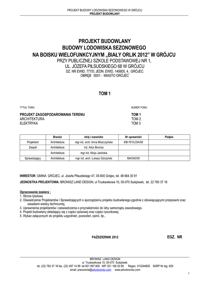 PROJEKT BUDOWY LODOWISKA SEZONOWEGO W GRÓJCU PROJEKT BUDOWLANY PROJEKT BUDOWLANY BUDOWY LODOWISKA SEZONOWEGO NA BOISKU WIELOFUNKCYJNYM „BIAŁY ORLIK 2012” W GRÓJCU PRZY PUBLICZNEJ SZKOLE PODSTAWOWEJ NR 1, UL. JÓZEFA PIŁSUDSKIEGO 68 W GRÓJCU DZ. NR EWID. 777/5; JEDN. EWID. 140605_4_ GRÓJEC OBRĘB 0001 - MIASTO GRÓJEC TOM 1 TYTUŁ TOMU NUMER TOMU PROJEKT ZAGOSPODAROWANIA TERENU ARCHITEKTURA ELEKTRYKA TOM 1 TOM 2 TOM 3 Branża Imię i nazwisko Nr uprawnień Projektant Architektura mgr inż. arch. Anna Miszczyńska 9/B-761/ŁOIA/08 Zespół Architektura inż. Artur Bronisz Architektura mgr inż. Alicja Jasińska Architektura mgr inż. arch. Łukasz Górzyński Sprawdzający Podpis MA/040/05 INWESTOR: GMINA GRÓJEC, ul. Józefa Piłsudskiego 47, 05-600 Grójec, tel. 48 664 30 91 JEDNOSTKA PROJEKTOWA: BRONISZ LAND DESIGN, ul Truskawkowa 10, 05-070 Sulejówek, tel. 22 783 37 16 Opracowanie zawiera : 1. Strona tytułowa 2. Oświadczenie Projektantów i Sprawdzających o sporządzeniu projektu budowlanego,zgodnie z obowiązującymi przepisami oraz zasadami wiedzy technicznej, 3. Uprawnienia projektantów i zaświadczenia o przynależności do Izby samorządu zawodowego, 4. Projekt budowlany składający się z części opisowej oraz części rysunkowej. 5. Wykaz załączonych do projektu uzgodnień, pozwoleń, opinii, itp., PAŹDZIERNIK 2012 EGZ. NR BRONISZ LAND DESIGN ul. Truskawkowa 10, 05-070 Sulejówek tel. (22) 783 37 16 fax. (22) 497 14 99 tel 601 997 809 NIP. 521 168 20 68 Regon 013244605 SARP Nr leg. 628 email: [email protected] www.arturbronisz.com 1 PROJEKT BUDOWY LODOWISKA SEZONOWEGO W GRÓJCU PROJEKT BUDOWLANY DANE OGÓLNE NAZWA I ADRES OBIEKTU: Teren objęty opracowaniem znajduje się na terenie kompleksu sportowego Orlik 2012 przy Publicznej Szkole Podstawowej Nr 1, przy ul. Józefa Piłsudskiego 68 w Grójcu. DZ. NR EWID. 777/5; JEDN. EWID. 140605_4_ GRÓJEC OBRĘB 0001 - MIASTO GRÓJEC INWESTOR: GMINA GRÓJEC Ul. Józefa Piłsudskiego 47 05-600 Grójec tel. 48 664 30 91 PROJEKTANT: Bronisz Land Design 05-070 Sulejówek ul Truskawkowa 10 tel. (22) 783 37 16 OPRACOWANIE: Projekt budowlany PODSTAWA OPRACOWANIA: Umowa z Zamawiającym z dnia 23.10.2012 r; Przepisy ustawy Prawo Budowlane i Polskie Normy, DATA SPORZĄDZENIA PROJEKTU: październik 2012 BRONISZ LAND DESIGN ul. Truskawkowa 10, 05-070 Sulejówek tel.(22) 783 37 16 kom. 601 997 809 email: [email protected] www.arturbronisz.com 2 PROJEKT BUDOWY LODOWISKA SEZONOWEGO W GRÓJCU PROJEKT BUDOWLANY 2. OŚWIADCZENIE PROJEKTANTÓW I SPRAWDZAJĄCYCH O SPORZĄDZENIU PROJEKTU BUDOWLANEGO ZGODNIE Z OBOWIĄZUJĄCYMI PRZEPISAMI ORAZ ZASADAMI WIEDZY TECHNICZNEJ NA PODSTAWIE Z ART. 20 UST.4 PRAWA BUDOWLANEGO Oświadczam, że projekt budowlany BUDOWY LODOWISKA SEZONOWEGO NA BOISKU WIELOFUNKCYJNYM „BIAŁY ORLIK 2012” W GRÓJCU PRZY PUBLICZNEJ SZKOLE PODSTAWOWEJ NR 1, UL. JÓZEFA PIŁSUDSKIEGO 68 W GRÓJCU DZ. NR EWID. 777/5; JEDN. EWID. 140605_4_ GRÓJEC OBRĘB 0001 - MIASTO GRÓJEC opracowany na zlecenie Inwestora: GMINA GRÓJEC Ul. Józefa Piłsudskiego 47 05-600 Grójec tel. 48 664 30 91 adres inwestycji: Grójec; ul. Józefa Piłsudskiego 68 działka nr ewid. 777/5, obręb 0001 – miasto Grójec został sporządzony zgodnie z obowiązującymi przepisami i zasadami wiedzy technicznej oraz zgodnie z art. 20 ust.1 p. 1b Prawa budowlanego i posiada informację dotyczącą bezpieczeństwa i ochrony zdrowia. Jednocześnie oświadczamy, że projekt ten, zostaje wydany w stanie kompletnym z punktu widzenia celu, któremu ma służyć. Branża Imię i nazwisko Nr uprawnień Projektant Architektura mgr inż. arch. Anna Miszczyńska 9/B-761/ŁOIA/08 Sprawdzający Architektura mgr inż. arch. Łukasz Górzyński MA/040/05 BRONISZ LAND DESIGN ul. Truskawkowa 10, 05-070 Sulejówek tel.(22) 783 37 16 kom. 601 997 809 email: [email protected] www.arturbronisz.com Podpis PROJEKT BUDOWY LODOWISKA SEZONOWEGO W GRÓJCU PROJEKT BUDOWLANY 3. Uprawnienia projektantów i zaświadczenia o przynależności do Izby samorządu zawodowego BRONISZ LAND DESIGN ul. Truskawkowa 10, 05-070 Sulejówek tel.(22) 783 37 16 kom. 601 997 809 email: [email protected] www.arturbronisz.com 4 PROJEKT BUDOWY LODOWISKA SEZONOWEGO W GRÓJCU PROJEKT BUDOWLANY BRONISZ LAND DESIGN ul. Truskawkowa 10, 05-070 Sulejówek tel.(22) 783 37 16 kom. 601 997 809 email: [email protected] www.arturbronisz.com PROJEKT BUDOWY LODOWISKA SEZONOWEGO W GRÓJCU PROJEKT BUDOWLANY BRONISZ LAND DESIGN ul. Truskawkowa 10, 05-070 Sulejówek tel.(22) 783 37 16 kom. 601 997 809 email: [email protected] www.arturbronisz.com 6 PROJEKT BUDOWY LODOWISKA SEZONOWEGO W GRÓJCU PROJEKT BUDOWLANY BRONISZ LAND DESIGN ul. Truskawkowa 10, 05-070 Sulejówek tel.(22) 783 37 16 kom. 601 997 809 email: [email protected] www.arturbronisz.com PROJEKT BUDOWY LODOWISKA SEZONOWEGO W GRÓJCU PROJEKT BUDOWLANY BRONISZ LAND DESIGN ul. Truskawkowa 10, 05-070 Sulejówek tel.(22) 783 37 16 kom. 601 997 809 email: [email protected] www.arturbronisz.com 8 PROJEKT BUDOWY LODOWISKA SEZONOWEGO W GRÓJCU PROJEKT BUDOWLANY 4. Projekt budowlany składający się z części opisowej oraz graficznej SPIS TREŚCI 1. DANE OGÓLNE.............................................................................................................................................................12 2. PRZEDMIOT INWESTYCJI...........................................................................................................................................12 3. ISTNIEJĄCY STAN ZAGOSPODAROWANIA DZIAŁKI.................................................................................................13 4. PROJEKTOWANE ZAGOSPODAROWANIE DZIAŁKI ................................................................................................13 4.1. BUDYNKI KONTENEROWE..............................................................................................................................13 4.1.1 KONTENER ZAPLECZA LODOWISKA..........................