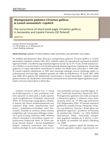 ARTYKUŁY Chrońmy Przyr. Ojcz. 69 (3): 221–225, 2013 Występowanie gadożera Circaetus gallicus w Lasach Janowskich i Lipskich The occurrence of short-toed eagle Circaetus gallicus in Janowskie and Lipskie Forests (SE Poland) ADAM FLIS Instytut Ochrony Przyrody PAN 31–120 Kraków, al. A. Mickiewicza 33 e-mail: fl[email protected] Słowa kluczowe: gadożer, Circaetus gallicus, ptaki szponiaste, Lasy Janowskie, Lasy Lipskie. W artykule przedstawiono dane dotyczące występowania gadożera Circaetus gallicus w Lasach Janowskich i Lipskich w latach 1990–2011. Gadożer należy do najrzadszych szponiastych ptaków lęgowych Polski, a liczebność jego populacji lęgowej szacuje się na 10–15 par. Został zamieszczony w Polskiej czerwonej księdze zwierząt jako gatunek skrajnie zagrożony wyginięciem. Ostatni lęg gadożera w Lasach Janowskich stwierdzono w okolicy wsi Pikule (pow. janowski) w 1990 roku. W Lasach Lipskich odnaleziono w 1992 roku martwego młodego, jeszcze nielotnego ptaka, co jednoznacznie dowodzi lęgu, jednakże gniazda nie udało się zlokalizować. W latach 2001–2004 oraz 2008–2011 gadożer był wielokrotnie rejestrowany w Lasach Janowskich i Lipskich, jednak gniazd również nie odnaleziono. Stwierdzono natomiast nowe stanowisko lęgowe gadożera na południe od Lasów Janowskich w 2010 roku. Gadożer Circaetus gallicus (ryc. 1) zwany też krótkoszponem (z racji posiadania krótkich szponów) to duży ptak z rzędu szponiastych Accipitriformes (Tomiałojć, Stawarczyk 2003). W Europie jego zasięg lęgowy obejmuje niemal cały obszar śródziemnomorski oraz częściowo kraje strefy umiarkowanej środkowej i południowo-wschodniej części kontynentu. Zasiedla tu zarówno tereny nizinne, podgórskie, jak i niższe góry obfitujące zwłaszcza w gady (Cramp, Simmons 1980). Wybiera obszary naturalne w niewielkim stopniu zurbanizowane (Stajszczyk 2004). W Polsce preferuje obrzeża dużych i starych kompleksów leśnych, zwłaszcza sosnowych oraz bezpośrednio przyległe do nich rozległe otwarte te- reny podmokłe tworzące mozaikę bagien, olsów i torfowisk (Ivanovsky, Shamovich 2011). Występowanie gadożera jest ściśle powiązane z obecnością gadów, a zwłaszcza węży, które stanowią nawet ok. 70–80% jego pożywienia (Gil, Pleguezuelos 2001). W Europie najwięcej gadożerów zasiedla Grecję, Hiszpanię i Francję oraz Białoruś, Ukrainę i Rosję, gdzie jest gatunkiem lęgowym i przebywa od kwietnia do października (Tucker i in. 1994; BirdLife International 2004). Zimowiska europejskiej populacji znajdują się w Afryce, w strefie Sahelu, na południe od Sahary (Meyburg i in. 1998). W Polsce gadożer należy do skrajnie nielicznych gatunków ptaków zagrożonych wy- 221 Chrońmy Przyr. Ojcz. rocznik 69, zeszyt 3, 2013 Ryc. 1. Gadożer Circaetus gallicus (rys. Ł. Bednarz) Fig. 1. Short-toed eagle Circaetus gallicus (drawing by Ł. Bednarz) ginięciem o statusie CR w Polskiej czerwonej księdze zwierząt (Dyrcz 2001), a jego populację lęgową szacuje się na około 10–15 par, głównie we wschodniej i południowej części kraju (Tomiałojć, Stawarczyk 2003; BirdLife International 2004). Trudności w ocenie liczebności populacji i niewiele odnalezionych stanowisk lęgowych wynikają z samotniczego trybu życia tego ptaka, dużych rewirów łowieckich (do 100 km2) oraz obserwacji przelotnych lub koczujących młodych osobników, które nie mają jeszcze stałych terytoriów (Stajszczyk 2004). Aktualnymi ostojami lęgowymi tego gatunku są: dolina Biebrzy, Puszcza Augustowska i Białowieska oraz Bieszczady (Pugacewicz 1996; 222 Tomiałojć, Stawarczyk 2003). Najliczniejsza jednak – jak się wydaje – populacja zamieszkuje Lubelszczyznę, z której stwierdzenia gadożera pochodzą m.in. z Puszczy Solskiej, Lasów Janowskich, Strzeleckich i Sobiborskich (Komisja Faunistyczna 2005–2012). Charakterystyczną cechą tego regionu jest obfitość terenów otwartych i podmokłych otoczonych licznymi lasami, stanowiących dla gadożera odpowiednie warunki siedliskowe (Wójciak i in. 2005; Potakiewicz 2007). Lasy Janowskie będące „przedsionkiem” Roztocza i Puszczy Solskiej, wraz z przylegającymi do nich bezpośrednio na zachodzie Lasami Lipskimi (ryc. 2), tworzą duży i zwarty obszar leśny poprzecinany znaczną liczbą mokradeł, torfowisk, polan i zbiorników wodnych obfitujących w siedliska sprzyjające występowaniu gadów, będących głównym pokarmem gadożera (Wediuk 2005). W Puszczy Solskiej w latach 90. XX wieku stwierdzany był corocznie rewir zajęty przez gadożery, a od 2004 roku, kiedy odnaleziono gniazdo z młodym, corocznie przynajmniej jedna para tych ptaków przystępuje do odbycia lęgu na tym obszarze (Wójciak i in. 2005; Komisja Faunistyczna 2006, 2009–2012). W Lasach Lipskich stwierdzano obecność krótkoszponów, ale gniazda dotychczas nie odnaleziono. W 1990 roku napotkano rannego dorosłego osobnika na trasie Zaklików–Lipa, który ucierpiał w wyniku kolizji z pojazdem. Ptak pomimo leczenia nie przeżył i obecnie stanowi eksponat w Muzeum Przyrodniczym Parku Krajobrazowego Lasy Janowskie w Janowie Lubelskim (A. Wediuk, Nadl. Janów Lubelski – inf. ustna). W 1992 roku koło Antoniowa odnaleziono martwego młodego, jeszcze nielotnego ptaka, co świadczyło o gnieżdżeniu się tego gatunku w okolicy, jednak gniazda nie udało się odnaleźć (Potakiewicz 2007). Ponadto w latach 90. XX wieku kilkakrotnie stwierdzono występowanie gadożerów w południowej części Lasów Lipskich, np. koło Radomyśla nad Sanem oraz miejscowości Lipa (Wójciak i in. 2005; Potakiewicz 2007). Gadożery gnieżdżą się także przypuszczalnie w sąsiedztwie poli- A. Flis Gadożer w Lasach Janowskich i Lipskich Ryc. 2. Lasy Janowskie i Lipskie: 1 – lasy, 2 – zbiorniki wodne, 3 – tereny otwarte (pola i łąki) Fig. 2. Janowskie and Lipskie Forests: 1 – forests, 2 – water bodies, 3 – open areas (fields and meadows)