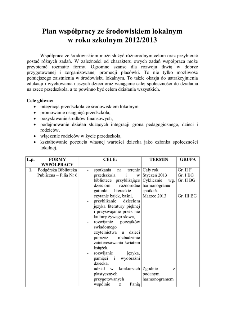 Plan współpracy ze środowiskiem lokalnym w roku szkolnym 2012