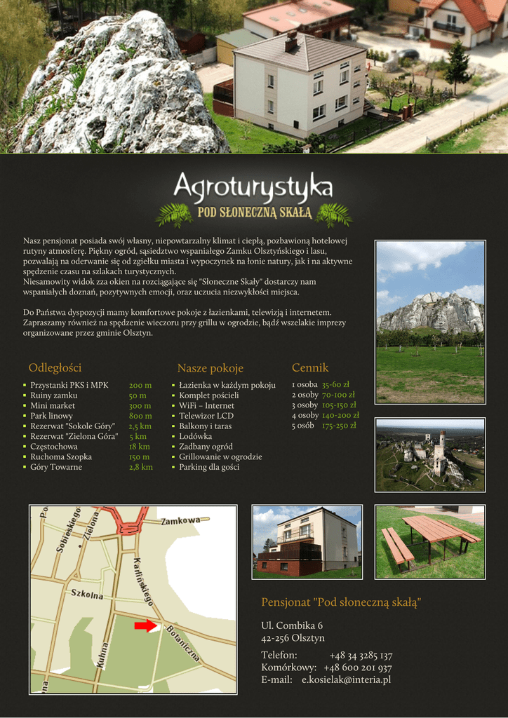 Nasz pensjonat posiada swój własny, niepowtarzalny klimat i ciepłą, pozbawioną hotelowej rutyny atmosferę. Piękny ogród, sąsiedztwo wspaniałego Zamku Olsztyńskiego i lasu, pozwalają na oderwanie się od zgiełku miasta i wypoczynek na łonie natury, jak i na aktywne spędzenie czasu na szlakach turystycznych. Niesamowity widok zza okien na rozciągające się "Słoneczne Skały" dostarczy nam wspaniałych doznań, pozytywnych emocji, oraz uczucia niezwykłości miejsca. Do Państwa dyspozycji mamy komfortowe pokoje z łazienkami, telewizją i internetem. Zapraszamy również na spędzenie wieczoru przy grillu w ogrodzie, bądź wszelakie imprezy organizowane przez gminie Olsztyn. Odległości Przystanki PKS i MPK Ruiny zamku Mini market Park linowy Rezerwat "Sokole Góry" Rezerwat "Zielona Góra" Częstochowa Ruchoma Szopka Góry Towarne 200 m 50 m 300 m 800 m 2,5 km 5 km 18 km 150 m 2,8 km Nasze pokoje Cennik Łazienka w każdym pokoju Komplet pościeli WiFi – Internet Telewizor LCD Balkony i taras Lodówka Zadbany ogród Grillowanie w ogrodzie Parking dla gości 1 osoba 2 osoby 3 osoby 4 osoby 5 osób 35-60 zł 70-100 zł 105-150 zł 140-200 zł 175-250 zł Pensjonat "Pod słoneczną skałą" Ul. Combika 6 42-256 Olsztyn Telefon: +48 34 3285 137 Komórkowy: +48 600 201 937 E-mail: [email protected]