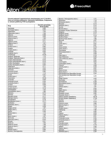 Cennik połączeń zagranicznych obowiązujący od 17.10.2014 Ceny za minutę połączenia, naliczanie sekundowe. Połączenia w ramach platformy FCN są bezpłatne. Kraj Abchazja Abchazja (kom.) Afganistan Afganistan (kom.) Albania Albania (inne) Albania (kom.) Algieria Algieria (inne) Algieria (kom.) Andora Andora (kom.) Angola Angola (kom.) Anguilla Anguilla (kom.) Antarktyda Antigua i Barbuda Antigua i Barbuda (kom.) Antyle Holenderskie Antyle Holenderskie (kom.) Arabia Saudyjska Arabia Saudyjska (kom.) Argentyna Argentyna (kom.) Armenia Armenia (inne) Armenia (kom.) Aruba Aruba (kom.) Ascension Australia Australia (inne) Australia (kom.) Austria Austria (inne) Austria (kom.) Azerbejdżan Azerbejdżan (kom.) Bahamy Bahrajn Bahrajn (inne) Bahrajn (kom.) Bangladesz Bangladesz (kom.) Barbados Barbados (kom.) Belgia Belgia (inne) Belgia (kom.) Belize Belize (kom.) Benin Benin (kom.) Bermudy Bermudy (kom.) Bhutan Białoruś Białoruś (inne) Białoruś (kom.) Boliwia Boliwia (kom.) Bośnia i Hercegowina Cennik sprzedaży (PLN brutto) 0,65 0,93 1,04 1,36 0,98 0,65 1,83 0,31 2,11 1,57 0,10 0,82 0,40 0,35 0,55 1,02 10,04 1,15 1,15 0,75 0,75 0,42 0,64 0,11 0,43 0,53 0,90 1,14 0,47 1,07 12,42 0,08 0,30 0,30 0,08 1,39 0,19 1,02 1,66 0,74 0,35 0,17 0,42 0,19 0,17 1,23 1,22 0,09 1,97 0,14 0,98 1,14 1,26 1,27 0,18 0,23 0,41 1,64 1,49 1,68 0,57 0,90 0,61 Bośnia i Hercegowina (kom.) Botswana Botswana (kom.) Brazylia Brazylia (kom.) Brunei Brunei (kom.) Brytyjskie Wyspy Dziewicze Bułgaria Bułgaria (inne) Bułgaria (kom.) Burkina Faso Burkina Faso (kom.) Burundi Chile Chile (kom.) Chiny Chiny (inne) Chiny (kom.) Chorwacja Chorwacja (kom.) Cypr Cypr (kom.) Cypr Północny Cypr Północny (kom.) Czad Czarnogóra Czarnogóra (kom.) Czechy Czechy (kom.) Dania Dania (inne) Dania (kom.) Demokratyczna Republika Konga Demokratyczna Republika Konga (kom.) Diego Garcia Dominika Dominikana Dominikana (kom.) Dżibuti Dżibuti (kom.) Egipt Egipt (kom.) Ekwador Ekwador (inne) Ekwador (kom.) Ellipso System Satelitarny Emsat System Satelitarny Erytrea Estonia Estonia (inne) Estonia (kom.) Etiopia Etiopia (kom.) Falklandy Fidżi Filipiny Filipiny (kom.) Finlandia Finlandia (inne) Finlandia (kom.) Francja Francja (inne) Francja (kom.) Gabon Gabon (kom.) Gambia Gambia (kom.) 1,71 1,10 1,10 0,13 0,14 0,12 0,15 1,16 0,19 0,17 0,19 1,57 1,65 4,47 0,11 0,07 0,07 0,15 0,07 0,07 0,48 0,09 0,19 0,25 0,67 2,24 0,63 1,91 0,09 0,24 0,07 0,05 0,19 2,24 2,25 4,42 1,22 0,39 0,39 1,67 1,67 0,44 0,46 0,59 0,60 1,32 18,76 17,54 1,11 0,10 2,68 0,13 1,19 1,19 7,96 0,82 0,53 0,67 0,27 0,35 0,26 0,07 1,47 0,19 2,45 2,77 2,26 2,34 1 Ghana Ghana (kom.) Gibraltar Gibraltar (kom.) GLOBAL NETWORKS Antarctica GLOBAL NETWORKS MCP GLOBAL PERSONAL NUMBER GLOBAL SATELLITE GLOBAL SATELLITE 882 Globalstar Grecja Grecja (kom.) Grenada Grenada (kom.) Grenlandia Grenlandia (kom.) Gruzja Gruzja (inne) Gruzja (kom.) Guam Guantanamo Gujana Gujana (kom.) Gujana Francuska Gujana Francuska (kom.) Gwadelupa Gwadelupa (kom.) Gwatemala Gwatemala (kom.) Gwinea Gwinea (kom.) Gwinea Bissau Gwinea Równikowa Haiti Haiti (kom.) Hiszpania Hiszpania (inne) Hiszpania (kom.) Holandia Holandia (inne) Holandia (kom.) Honduras Honduras (kom.) Hong Kong Hong Kong (kom.) India India (inne) India (kom.) Indonezja Indonezja (kom.) Inmarsat Irak Irak (kom.) Iran Iran (kom.) Iridium System Satelitarny Irlandia Irlandia (inne) Irlandia (kom.) Islandia Islandia (kom.) Izrael Izrael (inne) Izrael (kom.) Jamajka Jamajka (kom.) Japonia Japonia (kom.) Jemen 1,20 1,18 0,87 0,87 16,56 11,17 6,76 17,13 22,17 17,00 0,07 0,19 2,23 1,23 1,77 2,61 0,18 3,33 0,47 0,09 4,80 1,06 1,30 0,05 0,23 0,13 0,22 0,65 0,65 2,40 2,22 3,64 1,31 1,81 1,83 0,07 0,11 0,29 0,08 0,07 0,22 0,51 0,95 0,12 0,13 0,14 0,05 0,15 0,27 0,31 31,31 0,74 1,31 0,23 0,30 22,00 0,08 0,25 0,37 0,10 0,17 0,08 0,98 0,19 2,05 2,09 0,14 0,45 0,73 Jemen (kom.) Jordania Jordania (kom.) Kajmany Kambodża Kambodża (kom.) Kamerun Kamerun (kom.) Kanada Katar Katar (kom.) Kazachstan Kazachstan (inne) Kazachstan (kom.) Kenia Kenia (kom.) Kirgistan Kirgistan (kom.) Kiribati Kolumbia Kolumbia (kom.) Komory Komory (inne) Komory (kom.) Kongo Korea Południowa Korea Południowa (kom.) Korea Północna Kostaryka Kostaryka (kom.) Kuba Kuba (kom.) Kuwejt Kuwejt (kom.) Laos Lesotho Lesotho (kom.) Liban Liban (kom.) Liberia Liberia (kom.) Libia Libia (kom.) Liechtenstein Liechtenstein (kom.) Litwa Litwa (inne) Litwa (kom.) Luksemburg Luksemburg (kom.) Łotwa Łotwa (inne) Łotwa (kom.) Macedonia Macedonia (kom.) Madagaskar Madagaskar (kom.) Makau Makau (kom.) Malawi Malawi (kom.) Malediwy Malezja Malezja (kom.) Mali Mali (kom.) Malta Malta (kom.) Mariany Północne 0,88 0,48 0,85 1,10 0,44 0,38 0,68 2,54 0,05 0,93 0,93 0,15 1,21 0,30 0,63 0,84 0,72 0,64 5,42 0,23 0,43 1,80 1,39 1,79 2,25 0,08 0,14 4,23 0,52 0,35 3,88 4,95 0,22 0,41 0,45 0,70 1,11 0,46 0,83 2,60 2,65 1,09 1,19 0,37 0,89 0,19 2,65 0,19 0,08 0,49 0,25 0,30 0,71 0,85 2,03 3,82 3,11 0,29 0,29 1,71 1,95 4,89 0,09 0,09 1,04 1,70 0,07 0,24 0,22 2 Maroko Maroko (kom.) Martynika Martynika (kom.) Mauretania Mauritius Mauritius (kom.) Meksyk Meksyk (kom.) Mikronezja Mjanma Mjanma (kom.) Mołdawia Mołdawia (inne) Mołdawia (kom.) Monako Monako (inne) Monako (kom.) Mongolia Montserrat Mozambik Mozambik (inne) Mozambik (kom.) Namibia Namibia (kom.) Nauru Nepal Nepal (kom.) Niemcy Niemcy (inne) Niemcy (kom.) Niger Nigeria Nigeria (inne) Nigeria (kom.) Nikaragua Nikaragua (kom.) Niue Norfolk Norwegia Norwegia (inne) Norwegia (kom.) Nowa Kaledonia Nowa Zelandia Nowa Zelandia (kom.) Oman Pakistan Pakistan (inne) Pakistan (kom.) Palau Palestyna Palestyna (kom.) Panama Panama (kom.) Papua Nowa Gwinea Papua Nowa Gwinea (kom.) Paragwaj Paragwaj (kom.) Peru Peru (inne) Peru (kom.) Polinezja Francuska Portoryko Portugalia Portugalia (kom.) PREMIUM Republika Południowej Afryki Republika Południowej Afryki (kom.) Republika Środkowoafrykańska 0,10 2,18 0,13 0,18 2,39 0,40 0,40 0,05 0,17 1,17 1,16 1,1
