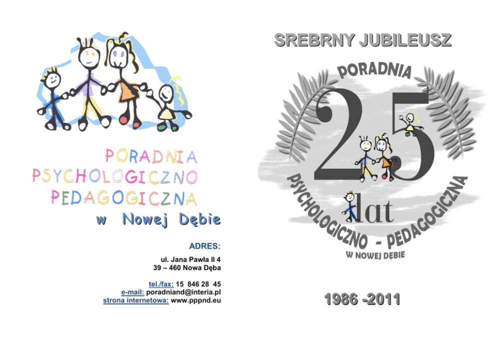 SREBRNY JUBILEUSZ w Nowej Dębie ADRES: ul. Jana Pawła II 4 39 – 460 Nowa Dęba tel./fax: 15 846 28 45 e-mail: [email protected] strona internetowa: www.pppnd.eu 1986 -2011 25 lat Poradni Psychologiczno – Pedagogicznej w Nowej Dębie 25 lat Poradni Psychologiczno – Pedagogicznej w Nowej Dębie Pamięć o przeszłości oznacza zaangażowanie w przyszłość. Jan Paweł II Autorzy publikacji: Pracownicy PPP w Nowej Dębie: Ewa Monika Szczepan Katarzyna Tadra Urszula Sudoł Opracowanie graficzne: Ewa Monika Szczepan Logo uroczystości: Kamila Tadra Zdjęcia: Sylwia Lubera Szanowni Państwo! Mija już 25 lat działania Poradni Psychologiczno – Pedagogicznej w Nowej Dębie. Na przestrzeni ćwierćwiecza zmieniają się zadania i zakres poradnictwa, tak jak zmienia się i ewoluuje pojęcie „porada”. W okresie baroku termin ten kojarzył się z pracą u podstaw, z nakazami, a nie z szukaniem wspólnej drogi. Obecnie porada, konsultacja, doradztwo ma głębokie psychologiczne implikacje i może odbywać się tylko w interakcji z drugim człowiekiem. Osoby na siebie oddziałują za pomocą bezpośredniej komunikacji. Relacja ta opiera się na otwartości i zaufaniu. Jubileusz 25 – lecia jest okazją do obejrzenia się wstecz i zobaczenia ludzi, którzy w tej relacji z nami uczestniczyli w trakcie prowadzonych badań, zajęć terapeutycznych i realizacji innych zadań. Jest to także czas refleksji i wzruszeń, bo przypominają nam się twarze Tych, którym nasza praca przyniosła radość, wyznaczyła drogę, pomogła odnaleźć rozwiązanie w trudnej sytuacji i jednocześnie przygotowała grunt pod lepszą przyszłość. Losy naszych klientów są także częścią naszego życia – zawodowego, ale i emocjonalnego. Nie można bowiem zapomnieć radosnych oczu dziecka, które po wielu próbach wreszcie wypowiedziało ćwiczoną głoskę, napisało samodzielnie zdanie czy z radością policzyło wszystkie patyczki. Z pozoru niewielkie wydarzenie, nakreśliło niejednemu dziecku lepszą przyszłość. To nasza misja, nasze zadanie na co dzień - dać szansę rozwoju!!! Pragniemy w tej publikacji wspomnieć o Tych Osobach, które z nami już nie pracują, ale pozostawiły swój ślad, mają ogromny wkład w rozwój placówki, dzięki zaangażowaniu, poświęceniu i wiedzy. Myśl o przeszłości pozwala nam myśleć perspektywicznie. Chcemy nadal rozwijać się, doskonalić formy pomocy psychologiczno pedagogicznej, by nadal z sukcesem przyczyniać się do rozwoju dziecka, a tym samym społeczeństwa. Czego sobie i Państwu życzymy!!! Dyrektor i pracownicy PPP 25 lat Poradni Psychologiczno – Pedagogicznej w Nowej Dębie MISJA PORADNI “Każde dziecko ma swoją szansę rozwoju” 25 lat Poradni Psychologiczno – Pedagogicznej w Nowej Dębie MOTTO PLACÓWKI „Mów dziecku, że jest dobre, że może, że potrafi’” WIZJA PORADNI Poradnia jest miejscem, gdzie każde dziecko odkryje swoje możliwości rozwojowe poprzez: pracę pedagogów, psychologów i logopedów, która nastawiona jest na wyszukiwanie u dzieci pozytywnych cech i możliwości bez względu na poziom rozwoju dziecka; opracowane metody i techniki pracy z dzieckiem oraz takie formy stymulacji rozwoju, które są odpowiednie do wieku i możliwości dziecka; uwzględnianie wszystkich aspektów rozwoju psychicznego, intelektualnego, emocjonalnego, społecznego i duchowego; pomoc dziecku z problemami, wspomagając jego rodzinę i przy zastosowaniu różnorodnych nowoczesnych technik i metod terapii; współpracę ze szkołami, kładąc nacisk na wyszukiwanie i wskazywanie, że każde dziecko ma pozytywne cechy, mocne strony i możliwości, które należy pomóc mu rozwinąć. Tylko proces edukacyjny oparty o pozytywne myślenie o dziecku daje dobre efekty – pozwala rozwinąć dziecku to, co w nim najlepsze. Janusz Korczak LOGO PORADNI 25 lat Poradni Psychologiczno – Pedagogicznej w Nowej Dębie Kolejne karty z kalendarza. Nasza historia… Zaczęło się to 25 lat temu... Pierwszym dokumentem znajdującym się w archiwach poradni jest decyzja Kuratora Oświaty i Wychowania w Tarnobrzegu o powołaniu jednostki organizacyjnej pod nazwą Poradnia Wychowawczo – Zawodowa w Nowej Dębie z dnia 22 września 1986r. Od 1 października tegoż roku poradnia mieściła się w budynku Zespołu Szkół Zawodowych (obecnie Zespół Szkół nr 2 im. Eugeniusza Kwiatkowskiego w Nowej Dębie). Zasięg działania poradni obejmował szkoły i placówki oświatowo-wychowawcze miasta i gminy Nowa Dęba oraz gminy Majdan Królewski. Poradnię organizowała psycholog Urszula Sudoł. Opiekę merytoryczną nad poradnią sprawowała Wojewódzka Poradnia Wychowawczo-Zawodowa w Tarnobrzegu. Początki były skromne – zatrudnionych było 3 pracowników: mgr Wanda Krawczyk (pedagog), mgr Grażyna Cetera (pedagog) i mgr Urszula Sudoł (psycholog), która pełniła funkcję dyrektora. Następnie od 1988r. funkcję dyrektora objęła mgr Helena Błahut. Z kolei w 1990r. obowiązki dyrektora powierzono mgr Elżbiecie Hodór. W tym czasie w Polsce nastąpiły przemiany społeczne i gospodarcze. Wzrosło zapotrzebowanie na udzielanie pomocy psychologiczno – pedagogicznej. Stopniowo zmieniały się zadania, które poszerzono m.in. o wyrównywanie startu szkolnego oraz wczesne wykrywanie i korygowanie nieharmonijnego rozwoju dzieci, w tym zaburzeń mowy. W związku z tym zatrudniono nowych pracowników, którzy poszerzali zakres oddziaływań psychologicznych, pedagogicznych i logopedycznych. Kadra pedagogiczna chcąc sprostać oczekiwaniom społecznym, systematycznie się doskonaliła, zdobywała coraz większą wiedzę i umiejętności. Baza lokalowa wciąż była niewystarczająca. Dlatego też 1 stycznia 1990 r. poradnia została przeniesiona do budynku Urzędu Miasta i Gminy Nowa Dęba przy ulicy Rzeszowskiej 3. Od 1991r. funkcję dyrektora poradni nieprzerwanie do chwili obecnej pełni mgr Ewa Jaworska. 25 lat Poradni Psychologiczno – Pedagogi