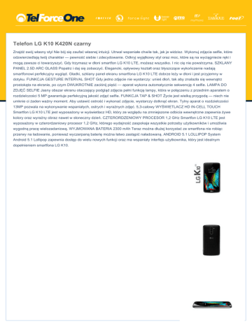 Telefon LG K10 K420N czarny Znajdź swój własny styl Nie bój się zaufać własnej intuicji. Utrwal wspaniałe chwile tak, jak je widzisz. Wykonuj zdjęcia selfie, które odzwierciedlają twój charakter — pewność siebie i zdecydowanie. Odkryj wyjątkowy styl oraz moc, które są na wyciągniecie ręki i mogą zawsze ci towarzyszyć. Gdy trzymasz w dłoni smartfon LG K10 LTE, możesz wszystko. I nic cię nie powstrzyma. SZKLANY PANEL 2.5D ARC GLASS Popatrz i daj się zobaczyć. Elegancki, opływowy kształt oraz błyszczące wykończenie nadają smartfonowi perfekcyjny wygląd. Gładki, szklany panel ekranu smartfona LG K10 LTE dobrze leży w dłoni i jest przyjemny w dotyku. FUNKCJA GESTURE INTERVAL SHOT Gdy jedno zdjęcie nie wystarczy: unieś dłoń, tak aby znalazła się wewnątrz prostokąta na ekranie, po czym DWUKROTNIE zaciśnij pięść — aparat wykona automatycznie sekwencję 4 selfie. LAMPA DO ZDJĘĆ SELFIE Jasny obszar ekranu otaczający podgląd zdjęcia pełni funkcję lampy, która w połączeniu z przednim aparatem o rozdzielczości 5 MP gwarantuje perfekcyjną jakość zdjęć selfie. FUNKCJA TAP & SHOT Życie jest wielką przygodą — niech nie umknie ci żaden ważny moment. Aby ustawić ostrość i wykonać zdjęcie, wystarczy dotknąć ekran. Tylny aparat o rozdzielczości 13MP pozwala na wykonywanie wspaniałych, ostrych i wyraźnych zdjęć. 5,3-calowy WYŚWIETLACZ HD IN-CELL TOUCH Smartfon LG K10 LTE jest wyposażony w wyświetlacz HD, który ze względu na zmniejszone odbicia wewnętrzne zapewnia żywe kolory oraz wyraźny obraz nawet w słoneczny dzień. CZTERORDZENIOWY PROCESOR 1,2 GHz Smartfon LG K10 LTE jest wyposażony w czterordzeniowy procesor 1,2 GHz, którego wydajność zaspokaja wszystkie potrzeby użytkowników i umożliwia wygodną pracę wielozadaniową. WYJMOWANA BATERIA 2300 mAh Teraz można dłużej korzystać ze smartfona nie robiąc przerwy na ładowanie, ponieważ wyczerpaną baterię można łatwo zastąpić naładowaną. ANDROID 5.1 LOLLIPOP System Android 5.1 Lollipop zapewnia dostęp do wielu nowych funkcji oraz ma wspaniały interfejs użytkownika, który jest idealnym dopełnieniem smartfona LG K10.