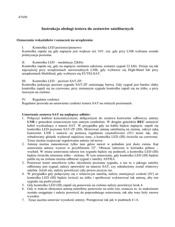 47450 Instrukcja obsługi testera do zestawów satelitarnych Oznaczenia wskaźników i oznaczeń na urządzeniu: I. Kontrolka LED poziomo/pionowo: Kontrolka zapala się gdy napięcie jest większe niŜ 16V, tzn. gdy przy LNB wybrana została polaryzacja pozioma. II. Kontrolka LED – modulacja 22kHz: Kontrolka zapala się, gdy na napięcie zasilania załoŜony zostanie sygnał 22 kHz. Dzieje się tak najczęściej przy urządzeniach uniwersalnych LNB, gdy wybierze się High-Band lub przy urządzeniach Multifeed, gdy wybierze się EUTELSAT. III. Kontrolka LED – poziom SAT-ZF: Kontrolka pokazuje poziom sygnału SAT-ZF zmieniając barwę. Gdy sygnał jest bardzo słaby kontrolka zapali się na czerwono, przy zmiennym sygnale kontrolka zapali się na Ŝółto, a przy mocnym na zielono. IV. Regulator czułości: Regulator pozwala na ustawienie czułości testera SAT na róŜnych poziomach. Ustawienie zestawu SAT na najlepszy odbiór: 1. Połączyć kablem koncentrycznym, dołączonym do zestawu konwerter odbiorczy anteny LNB z gniazdem oznaczonym tym samym symbolem. W drugim gnieździe REC umieścić kabel wychodzący z tunera SAT. W przypadku gdy na kablu będzie napięcie, zapali się kontrolka LED poziomu SAT-ZF (III). Skierować antenę satelitarną na ziemię, zakryć ręką konwerter LNB i ustawić za pomocą regulatora częstotliwości (IV) tester tak, aby wbudowany głośnik wydawał najniŜsze tony, a kontrolka LED (III) świeciła na czerwono. Teraz moŜna rozpocząć regulowanie anteny od nowa. 2. Antenę moŜna zamontować tylko tam gdzie nawet w południe jest duŜo cienia. Kąt ustawienia anteny wynosi w przybliŜeniu 32°. Obracać talerzem w kierunku północ – wschód. W miarę ustawiania talerza ton sygnału będzie się podnosił, a kontrolka LED (III) będzie świeciła zmiennie Ŝółto - zielono. W tym ustawieniu, gdy kontrolka LED (III) będzie paliła się na zielono moŜna odbierać sygnał z satelity ASTRA. 3. PoniewaŜ tester umoŜliwia tylko określenie poziomu sygnału, a nie to z jakiego satelity odbierany jest sygnał, naleŜy sprawdzić na tunerze SAT, czy odnaleziony został właściwy satelita. JeŜeli nie, naleŜy powtórzyć cały proces jeszcze raz. 4. W przypadku gdy połączymy się z właściwym satelitą, naleŜy zmniejszyć czułość (IV) aŜ kontrolka LED (III) będzie świecić na Ŝółto i spróbować wykierować tak antenę, aby ton sygnału się podwyŜszał. 5. Gdy kontrolka LED (III) zapali się ponownie na zielono naleŜy powtórzyć krok 4. 6. Gdy w trakcie obracania anteną natrafimy ponownie na niski ton, oznacza to, Ŝe maksimum zostało osiągnięte i naleŜy powrócić do poprzedniego ustawienia, tak aby tony były znowu wysokie. 7. Teraz moŜna ustawiać wysokość anteny. Postępować tak jak w punktach 4 i 6. Środki ostroŜności: - Chronić przed wilgocią; - Delikatnie obchodzić się z pokrętłem czułości (IV); - Zachować wszelkie środki ostroŜności podczas montaŜu anteny satelitarnej; - Nie pozostawiać urządzenia wmontowanego do sieci. (urządzenie słuŜy tylko do poprawnego wysterowania anteny satelitarnej). *Oznaczenia (I), (II), (III), (IV) zgodne z rysunkiem instrukcji oryginalnej.