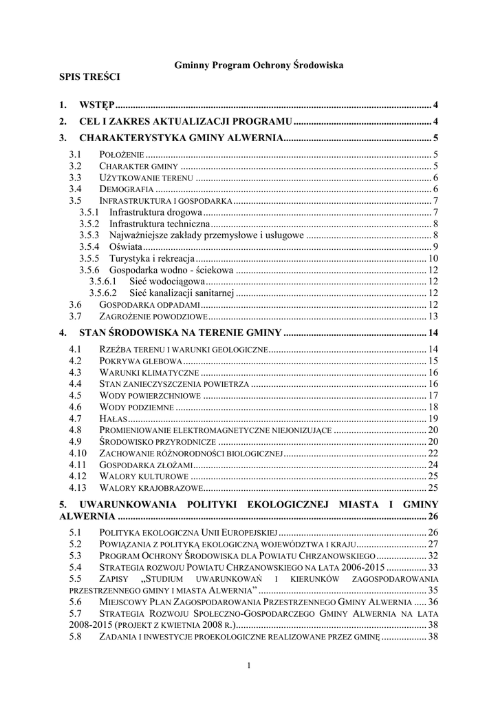 Gminny Program Ochrony Środowiska SPIS TREŚCI 1. WSTĘP .............................................................................................................................. 4 2. CEL I ZAKRES AKTUALIZACJI PROGRAMU ....................................................... 4 3. CHARAKTERYSTYKA GMINY ALWERNIA........................................................... 5 3.1 POŁOśENIE .................................................................................................................. 5 3.2 CHARAKTER GMINY .................................................................................................... 5 3.3 UśYTKOWANIE TERENU .............................................................................................. 6 3.4 DEMOGRAFIA .............................................................................................................. 6 3.5 INFRASTRUKTURA I GOSPODARKA ............................................................................... 7 3.5.1 Infrastruktura drogowa ........................................................................................... 7 3.5.2 Infrastruktura techniczna ........................................................................................ 8 3.5.3 NajwaŜniejsze zakłady przemysłowe i usługowe .................................................. 8 3.5.4 Oświata ................................................................................................................... 9 3.5.5 Turystyka i rekreacja ............................................................................................ 10 3.5.6 Gospodarka wodno - ściekowa ............................................................................ 12 3.5.6.1 Sieć wodociągowa ........................................................................................ 12 3.5.6.2 Sieć kanalizacji sanitarnej ............................................................................ 12 3.6 GOSPODARKA ODPADAMI .......................................................................................... 12 3.7 ZAGROśENIE POWODZIOWE ....................................................................................... 13 4. STAN ŚRODOWISKA NA TERENIE GMINY ......................................................... 14 4.1 4.2 4.3 4.4 4.5 4.6 4.7 4.8 4.9 4.10 4.11 4.12 4.13 RZEŹBA TERENU I WARUNKI GEOLOGICZNE ............................................................... 14 POKRYWA GLEBOWA ................................................................................................. 15 WARUNKI KLIMATYCZNE .......................................................................................... 16 STAN ZANIECZYSZCZENIA POWIETRZA ...................................................................... 16 WODY POWIERZCHNIOWE ......................................................................................... 17 WODY PODZIEMNE .................................................................................................... 18 HAŁAS ....................................................................................................................... 19 PROMIENIOWANIE ELEKTROMAGNETYCZNE NIEJONIZUJĄCE ..................................... 20 ŚRODOWISKO PRZYRODNICZE ................................................................................... 20 ZACHOWANIE RÓśNORODNOŚCI BIOLOGICZNEJ ......................................................... 22 GOSPODARKA ZŁOśAMI............................................................................................. 24 WALORY KULTUROWE .............................................................................................. 25 WALORY KRAJOBRAZOWE......................................................................................... 25 5. UWARUNKOWANIA POLITYKI EKOLOGICZNEJ MIASTA I GMINY ALWERNIA ........................................................................................................................... 26 5.1 5.2 5.3 5.4 5.5 POLITYKA EKOLOGICZNA UNII EUROPEJSKIEJ ........................................................... 26 POWIĄZANIA Z POLITYKĄ EKOLOGICZNĄ WOJEWÓDZTWA I KRAJU............................ 27 PROGRAM OCHRONY ŚRODOWISKA DLA POWIATU CHRZANOWSKIEGO .................... 32 STRATEGIA ROZWOJU POWIATU CHRZANOWSKIEGO NA LATA 2006-2015 ................ 33 ZAPISY „STUDIUM UWARUNKOWAŃ I KIERUNKÓW ZAGOSPODAROWANIA PRZESTRZENNEGO GMINY I MIASTA ALWERNIA” ................................................................... 35 5.6 MIEJSCOWY PLAN ZAGOSPODAROWANIA PRZESTRZENNEGO GMINY ALWERNIA ..... 36 5.7 STRATEGIA ROZWOJU SPOŁECZNO-GOSPODARCZEGO GMINY ALWERNIA NA LATA 2008-2015 (PROJEKT Z KWIETNIA 2008 R.)............................................................................ 38 5.8 ZADANIA I INWESTYCJE PROEKOLOGICZNE REALIZOWANE PRZEZ GMINĘ .................. 38 1 5.9 WSPÓŁPRACA GMINY W ZAKRESIE OCHRONY ŚRODOWISKA ...................................... 39 6. DŁUGOTERMINOWA POLITYKA ŚRODOWISKOWA GMINY DO ROKU 201440 6.1 PRIORYTETY POLITYKI EKOLOGICZNEJ GMINY .......................................................... 40 6.1.1 Ochrona wód i zaopatrzenie ludności w wodę ..................................................... 40 6.1.2 System kanalizacji i oczyszczania ścieków.......................................................... 40 6.1.3 Gospodarka odpadami .......................................................................................... 41 6.1.4 Edukacja ekologiczna w gminie ........................................................................... 41 6.2 POZOSTAŁE OBSZARY DZIAŁAŃ ................................................................................. 43 6.2.1 Ochrona przyrody i róŜnorodności biologicznej .................................................. 43 6.2.2 Zmniejszenie wodochłonności i energochłonności w gospodarce komunalnej ... 44 6.2.3 ZrównowaŜone rolnictwo, ochrona gleb i powierzchni ziemi, ...............
