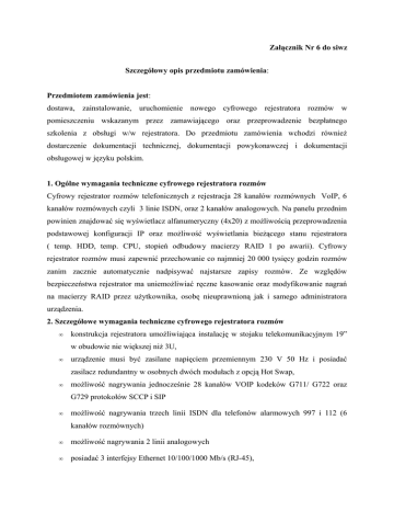 Załącznik Nr 6 do siwz Szczegółowy opis przedmiotu zamówienia: Przedmiotem zamówienia jest: dostawa, zainstalowanie, uruchomienie nowego cyfrowego rejestratora rozmów w pomieszczeniu wskazanym przez zamawiającego oraz przeprowadzenie bezpłatnego szkolenia z obsługi w/w rejestratora. Do przedmiotu zamówienia wchodzi również dostarczenie dokumentacji technicznej, dokumentacji powykonawczej i dokumentacji obsługowej w języku polskim. 1. Ogólne wymagania techniczne cyfrowego rejestratora rozmów Cyfrowy rejestrator rozmów telefonicznych z rejestracja 28 kanałów rozmównych VoIP, 6 kanałów rozmównych czyli 3 linie ISDN, oraz 2 kanałów analogowych. Na panelu przednim powinien znajdować się wyświetlacz alfanumeryczny (4x20) z możliwością przeprowadzenia podstawowej konfiguracji IP oraz możliwość wyświetlania bieżącego stanu rejestratora ( temp. HDD, temp. CPU, stopień odbudowy macierzy RAID 1 po awarii). Cyfrowy rejestrator rozmów musi zapewnić przechowanie co najmniej 20 000 tysięcy godzin rozmów zanim zacznie automatycznie nadpisywać najstarsze zapisy rozmów. Ze względów bezpieczeństwa rejestrator ma uniemożliwiać ręczne kasowanie oraz modyfikowanie nagrań na macierzy RAID przez użytkownika, osobę nieuprawnioną jak i samego administratora urządzenia. 2. Szczegółowe wymagania techniczne cyfrowego rejestratora rozmów • konstrukcja rejestratora umożliwiająca instalację w stojaku telekomunikacyjnym 19” w obudowie nie większej niż 3U, • urządzenie musi być zasilane napięciem przemiennym 230 V 50 Hz i posiadać zasilacz redundantny w osobnych dwóch modułach z opcją Hot Swap, • możliwość nagrywania jednocześnie 28 kanałów VOIP kodeków G711/ G722 oraz G729 protokołów SCCP i SIP • możliwość nagrywania trzech linii ISDN dla telefonów alarmowych 997 i 112 (6 kanałów rozmównych) • możliwość nagrywania 2 linii analogowych • posiadać 3 interfejsy Ethernet 10/100/1000 Mb/s (RJ-45), • nagrywania rozmów z systemu telefonicznego opartego o wykorzystanie Unified Communications Manager (CUCM) z wykorzystaniem funkcjonalności Built-INBridge w wersjach 6 , 7, 8 oraz 9 poprzez integrację SIP-TRUNK (Integracja musi być oparta całkowicie na rozwiązaniu programowym, bez stosowania dodatkowego wyposażenia sprzętowego), • wyklucza się stosowanie licencji na rejestrację rozmów w formie jakiegokolwiek klucza sprzętowego (np.: na złączu USB, RS232). Dopuszczalna licencja na nagrywanie rozmów jedynie w formie pliku lub plików umieszczonych w cyfrowym rejestratorze rozmów • rejestracja informacji dodatkowych o rozmowie (data i czas rozpoczęcia rozmowy, czas trwania rozmowy, numer wywołujący/wywoływany/osiągnięty (po przekierowaniu) • cyfrowy rejestrator rozmów musi posiadać wbudowany w obudowę opisany panel sterowania, który umożliwi poruszanie się po menu celem przeprowadzenia podstawowej konfiguracji adresacji IP • cyfrowy rejestrator rozmów ma posiadać wyświetlacz LCD przynajmniej o parametrach 4 x 20 (ilość wierszy x ilość znaków) oraz głośnik, stanowiące lokalny interfejs obsługi urządzenia, który umożliwi dostęp do podstawowych funkcji takich jak: odsłuch nagrań, wyświetlanie informacji o stanie pracy urządzenia (alarmy, temp. HDD, temp. CPU, stopień odbudowy macierzy RAID 1 po awarii),oraz konfigurację interfejsów sieciowych (adres IP, maska, brama sieci) • cyfrowy rejestrator rozmów powinien sygnalizować stany awaryjne i przedawaryjne (uszkodzenie dysku, zbliżająca się awaria dysku, zanik synchronizacji z serwerem NTP, awaria lub brak zasilania w danym module, awaria interfejsów sieciowych) lokalnie na rejestratorze (na wyświetlaczu LCD), przez sieć TCP/IP na standardowym komputerze PC ,poprzez złącze alarmowe za pomocą przekaźnika oraz w formie dźwiękowej poprzez głośnik zamontowany w obudowie rejestratora. • cyfrowy rejestrator rozmów powinien zapewnić przechowanie co najmniej 20 000 tysięcy godzin rozmów zanim zacznie automatycznie nadpisywać najstarsze zapisy rozmów • rejestracja musi się odbywać na dwóch wymiennych nośnikach HDD typu SATA 3,5 cala o tej samej pojemności minimum 1 TB w macierzy RAID 1, w kieszeni „HotSwap” z funkcją automatycznej odbudowy • w przypadku czasowego zaniku zasilania, które spowodowałoby wyłączenie cyfrowego rejestratora rozmów, urządzenie winno automatycznie podjąć swoją pracę. (informacja zwrotna o zaistniałym zdarzeniu w postaci alarmu) • cyfrowy rejestrator rozmów powinien automatycznie aktualizować czasu z serwera NTP • zarządzanie siecią rejestratorów z poziomu dedykowanej aplikacji urządzenia z możliwością monitorowania stanów pracy wszystkich rejestratorów jednocześnie, zdalnego odsłuchu (także w czasie nagrywania aktualnej korespondencji), archiwizacji, przeglądania korespondencji z filtracją oraz opcją wyszukiwania (data i godzina, numer telefonu, numer kanału, adres IP, MAC adres, ostatnio zapisane rozmowy, możliwość ustawienia po zakresie dat, oraz z możliwością parametryzacji opcji wyszukiwania.), Wyklucza się zastosowanie programów typu VNC, protokół RDP znany jako zdalny pulpit. • tworzenie plików wav z pojedynczych rozmów lub ich fragmentów poprzez zastosowanie konwersji pliku • Archiwizacja zapisów na standardowym komputerze PC do postaci zbiorczego archiwum (bazy nagrań) oraz pojedynczych plików *.wav • Archiwizacja logów rejestratora na standardowym komputerze PC za pomocą aplikacji do zarządzania rejestratora. • możliwość wykonywania archiwizacji automatycznie na podstawie wcześniej zdefiniowanego przez administratora harmonogramu • wielopoziomowy system autoryzacji i zabezpieczeń (zakładanie i usuwanie indywidualnych kont dla użytkowników, nadawanie im odpowiednich uprawnień, edycja uprawnień przez administratora urządzenia) • Cyfrowy rejestrator rozmów powinien sygnalizować próby nieaut
