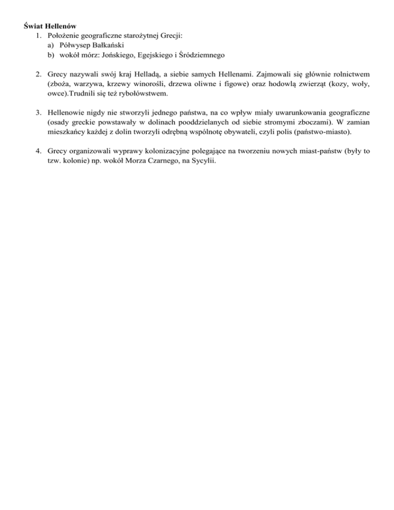 Świat Hellenów 1. Położenie geograficzne starożytnej Grecji: a) Półwysep Bałkański b) wokół mórz: Jońskiego, Egejskiego i Śródziemnego 2. Grecy nazywali swój kraj Helladą, a siebie samych Hellenami. Zajmowali się głównie rolnictwem (zboża, warzywa, krzewy winorośli, drzewa oliwne i figowe) oraz hodowlą zwierząt (kozy, woły, owce).Trudnili się też rybołówstwem. 3. Hellenowie nigdy nie stworzyli jednego państwa, na co wpływ miały uwarunkowania geograficzne (osady greckie powstawały w dolinach pooddzielanych od siebie stromymi zboczami). W zamian mieszkańcy każdej z dolin tworzyli odrębną wspólnotę obywateli, czyli polis (państwo-miasto). 4. Grecy organizowali wyprawy kolonizacyjne polegające na tworzeniu nowych miast-państw (były to tzw. kolonie) np. wokół Morza Czarnego, na Sycylii.
